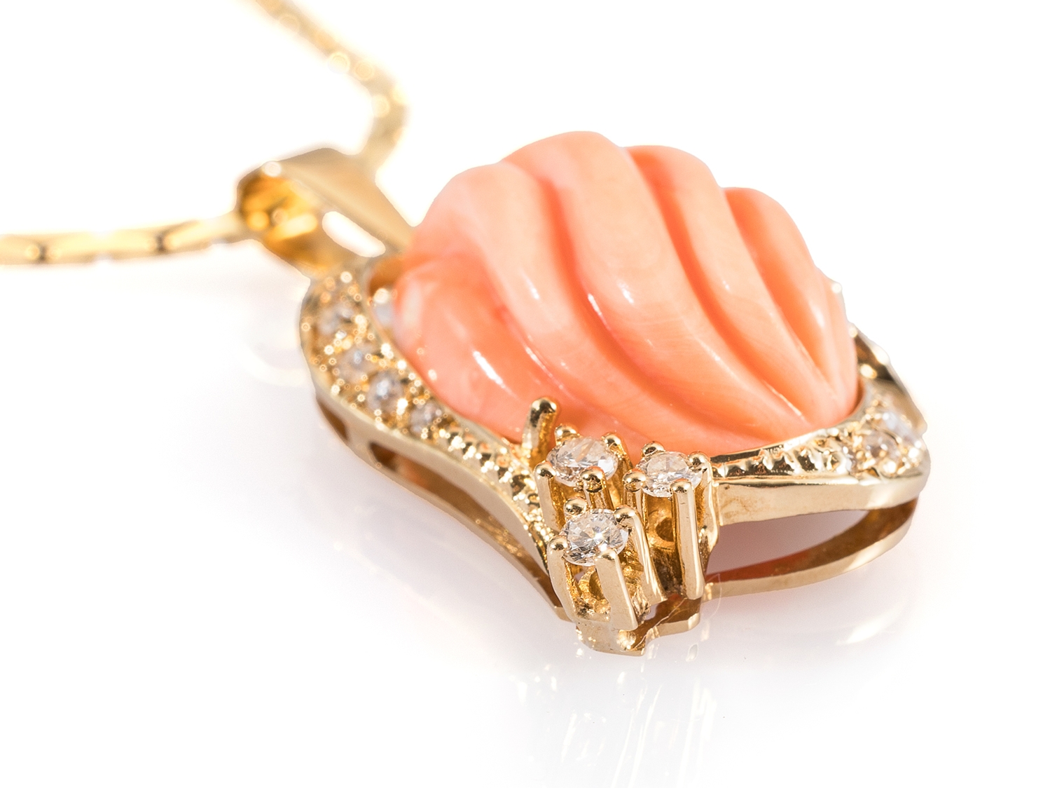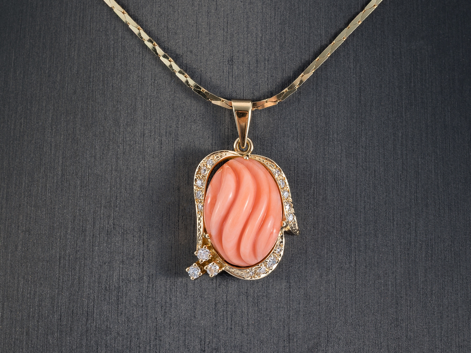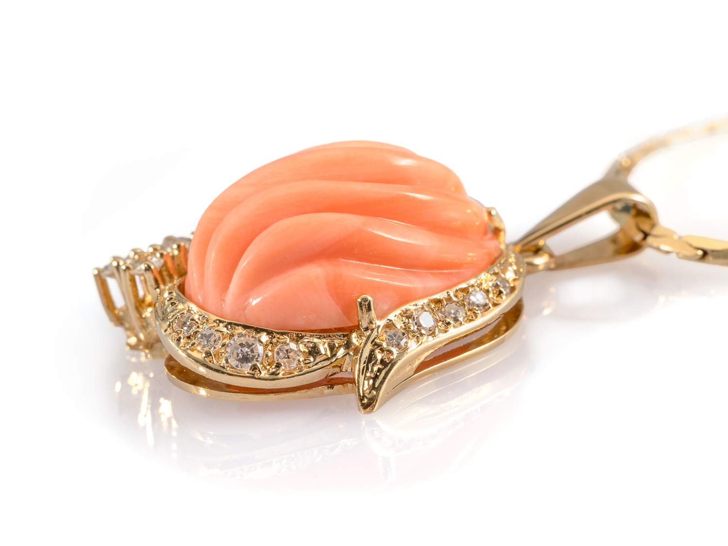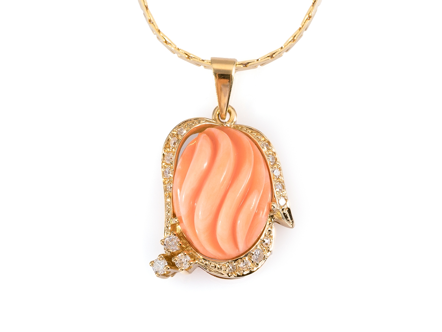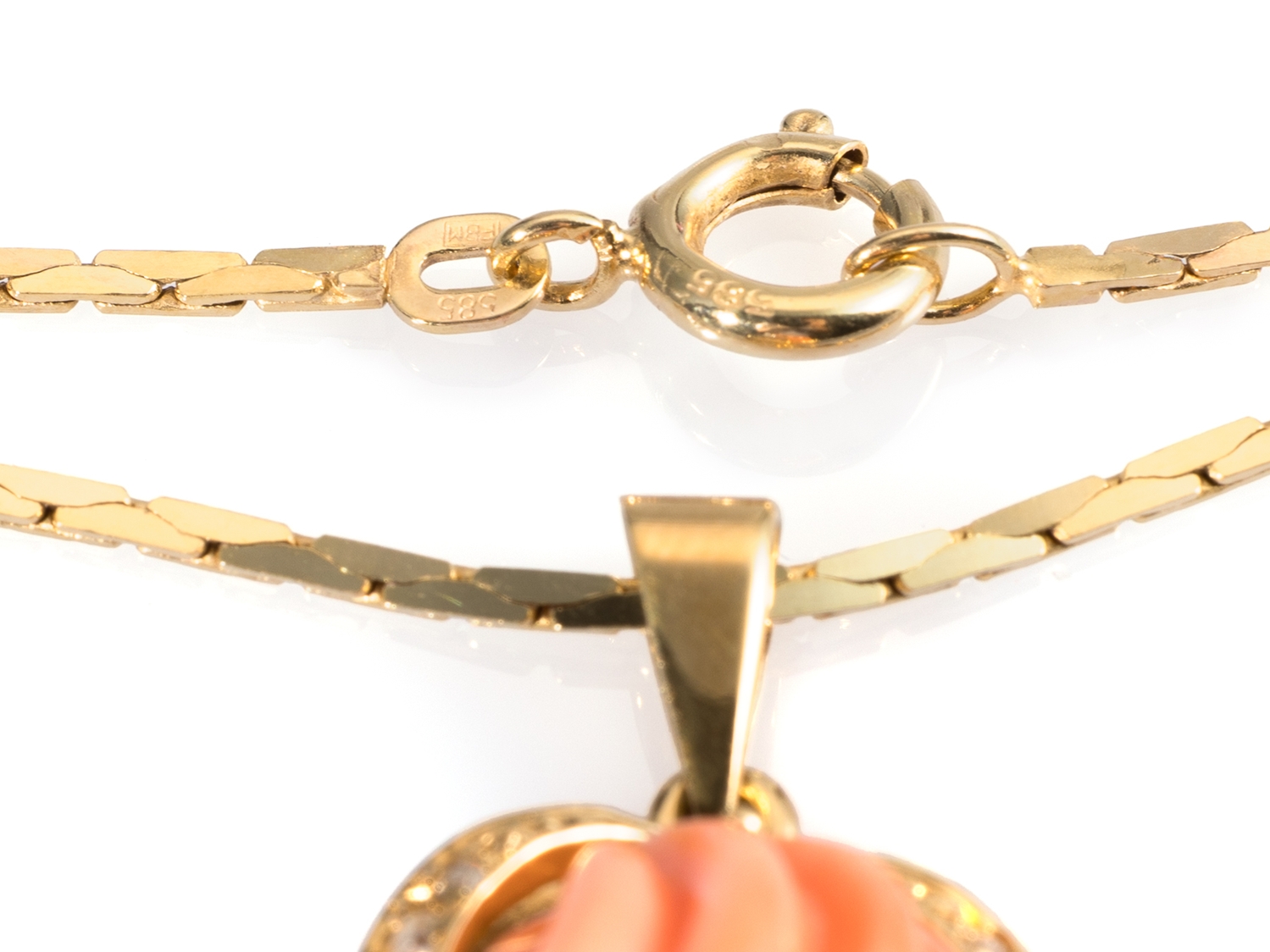 Attraktives Collier aus Gelbgold, Anhänger und Kette mit 585 punziert. Im Anhänger gefasst eine gravierte lachsfarbene Koralle ca. 18 x 13 mm, sowie 3 Brillanten und 14 Achtkant Diamanten zusammen etwa 0,25 Carat, geringer Farb- und Reinheitsgrad. Anhänger und Kette haben einen gepflegten Zustand, die Kette hat eine Länge von 38 cm, das Gewicht beträgt zusammen 10,46 Gramm (Anhänger 6,45 Gramm, Kette 4,01 Gramm).