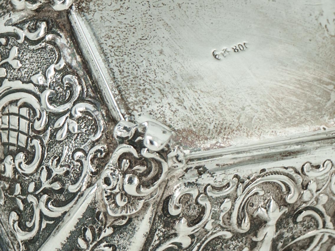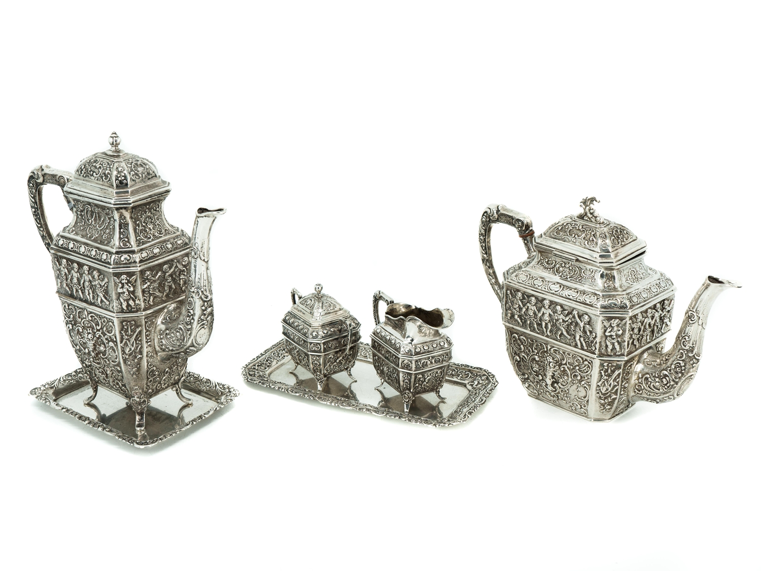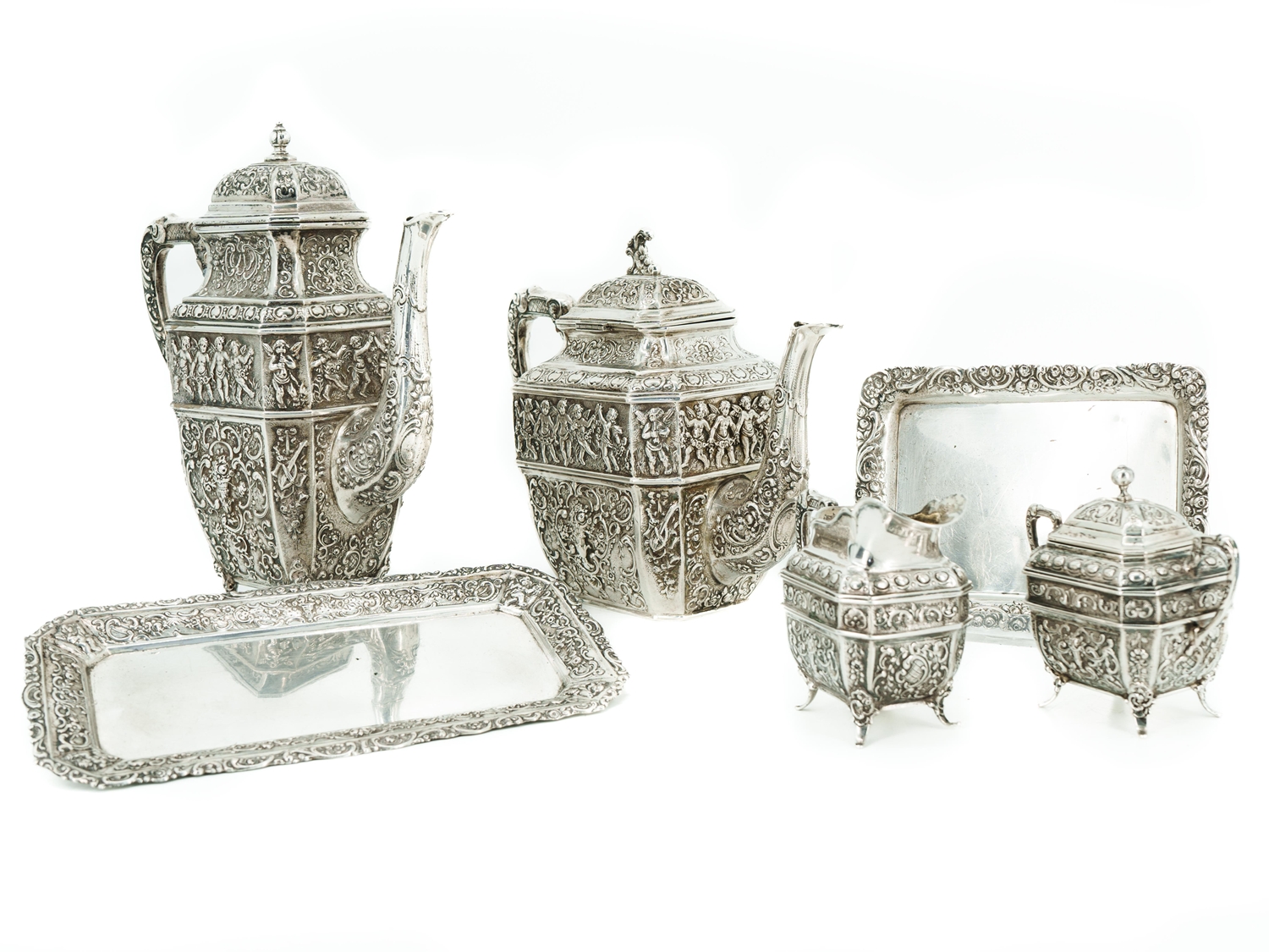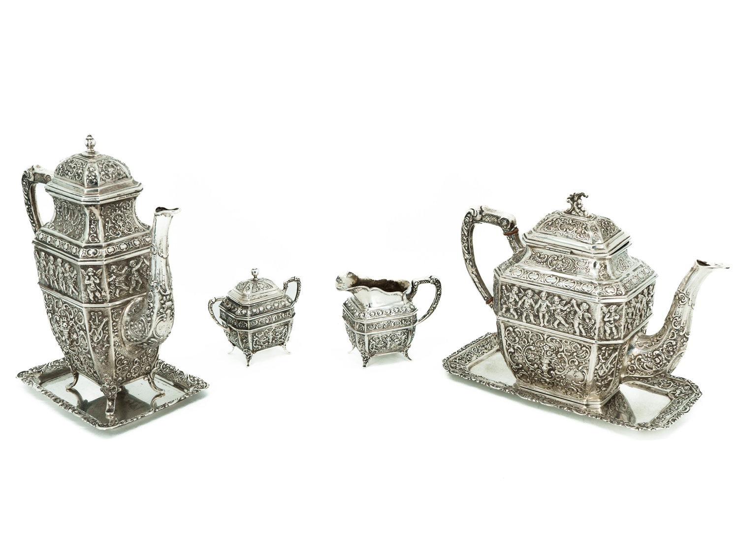 Repräsentatives, mehrteiliges Silberservice, bestehend aus Teekanne, Kaffeekanne, Zuckerdose mit Deckel, Sahnegießer sowie zwei rechteckigen Untersetzern/Tabletts. Die Gefäße sechspassig gegliedert und reich verziert, mit umlaufenden figürlichen Reliefszenen, die antikisierende Darstellungen mit Putti, Tänzern und Musikanten zeigen - ergänzt durch florale Ornamentik, Rollwerk und stilisierte Blattmotive. Die Korpuswände, Ausgüsse, Henkel und Deckel sind fein reliefiert und meisterlich getrieben. Alle Teile auf vier geschweiften Füßchen stehend. Silbergehalt: 800er, punziert mit Halbmond, Krone und Feingehaltsstempel „800“. Höhe Teekanne: ca. 20 cm, Kaffeekanne: ca. 26 cm. Gesamtgewicht: ca. 2320 Gramm. Sehr guter Erhaltungszustand, minimale altersbedingte Gebrauchsspuren.