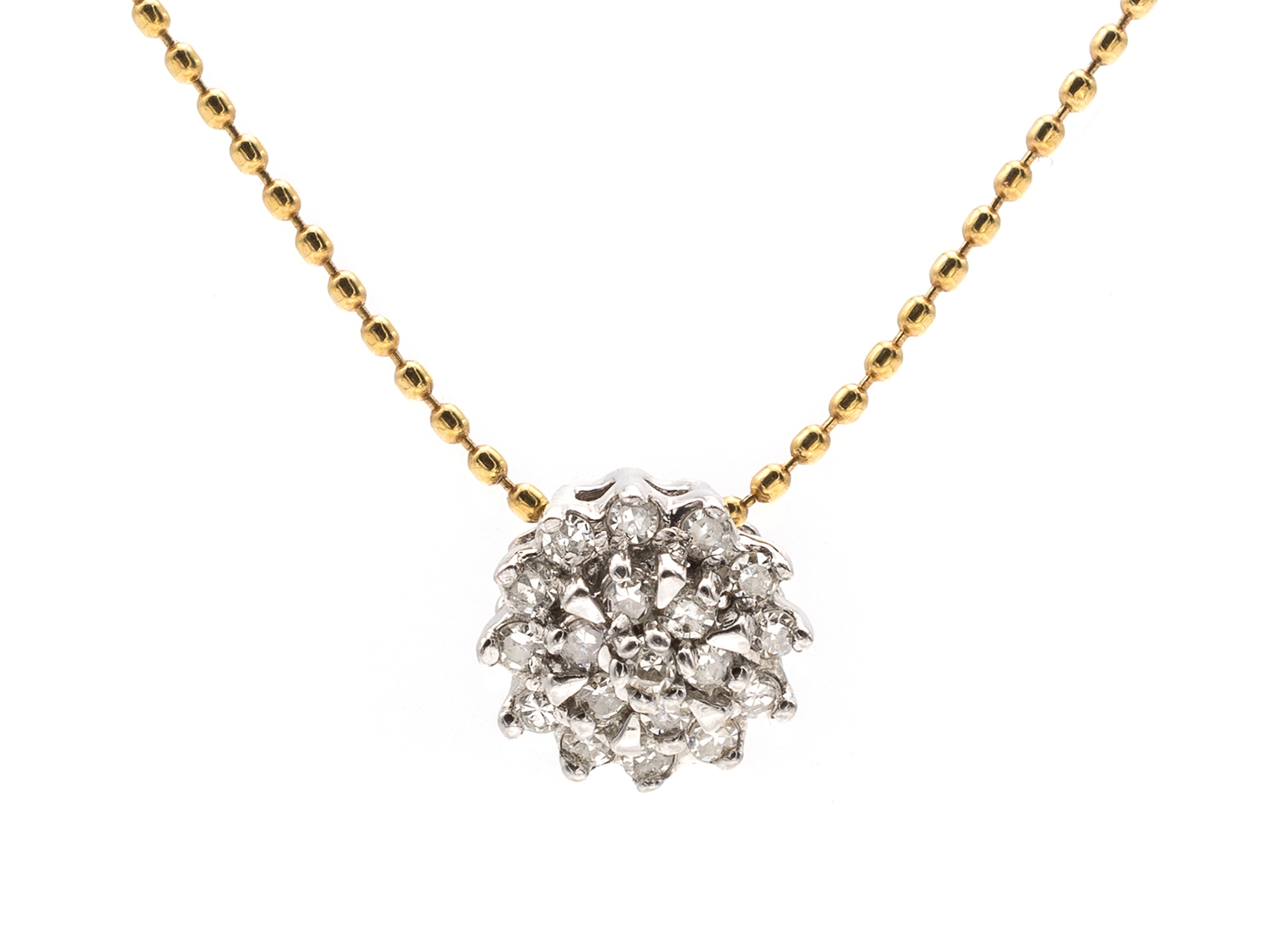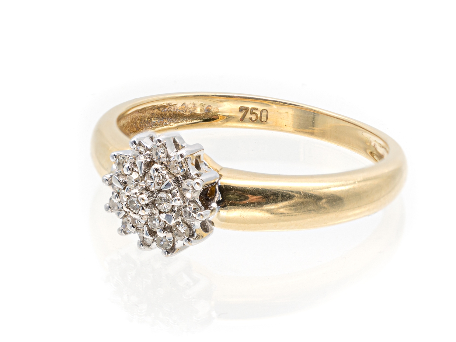 Dezenter Ring aus Gelbgold, punziert 750. Im Ring rhodiniert gefasst sind 19 kleine Diamanten im Achtkantschliff. Der Ring hat einen guten Zustand, die Weite 54/17,2, Durchmesser Ringkopf 7,6 mm, Gewicht 3,59 Gramm. Anhänger an 45,5 cm langer Kette aus Gelbgold, punziert 585. Im Anhänger rhodiniert gefasst sind 19 kleine Diamanten im Achtkantschliff. Das Schmuckstück hat einen guten Zustand, Durchmesser Anhänger 8 mm, Gewicht Kette mit Anhänger 2,67 Gramm.