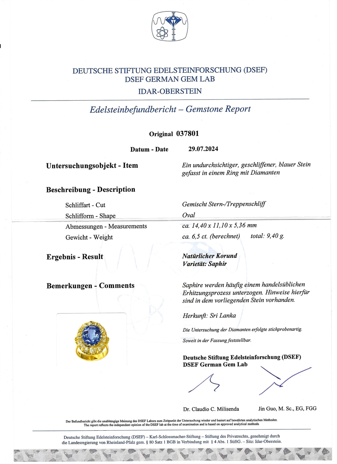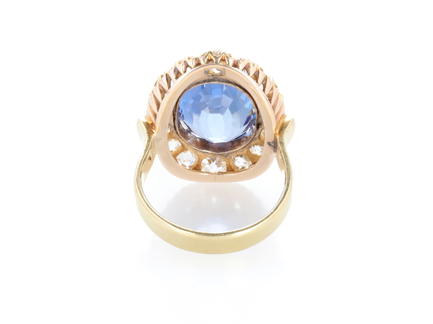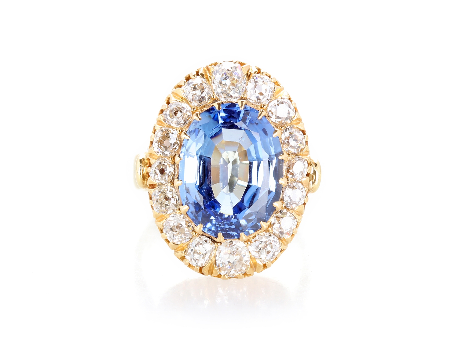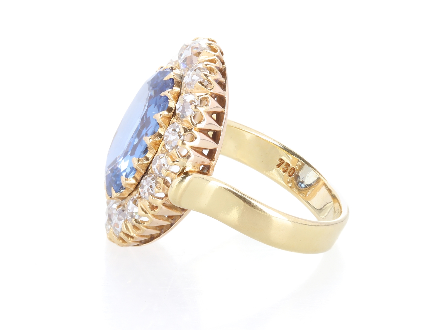 Prachtvoller Ring aus Gelbgold, in der Schiene mit 750 punziert. Im Ring gefasst ist ein ovaler Saphir aus Sri Lanka von ca. 6,50 Carat, sowie 6 ovale und 10 runde Diamanten im Altschliff (weißer Farb- und hoher bis mittlerer Reinheitsgrad) von zusammen ca. 2,80 Carat. Der Ring hat einen gepflegten Zustand, die Weite 55/17,5, der Ringkopf hat das Format 23,5x16,5 mm, das Gewicht beträgt 9,40 Gramm. DSEF Edelsteinbefundbericht 037801 vom 29.07.2024 liegt bei.