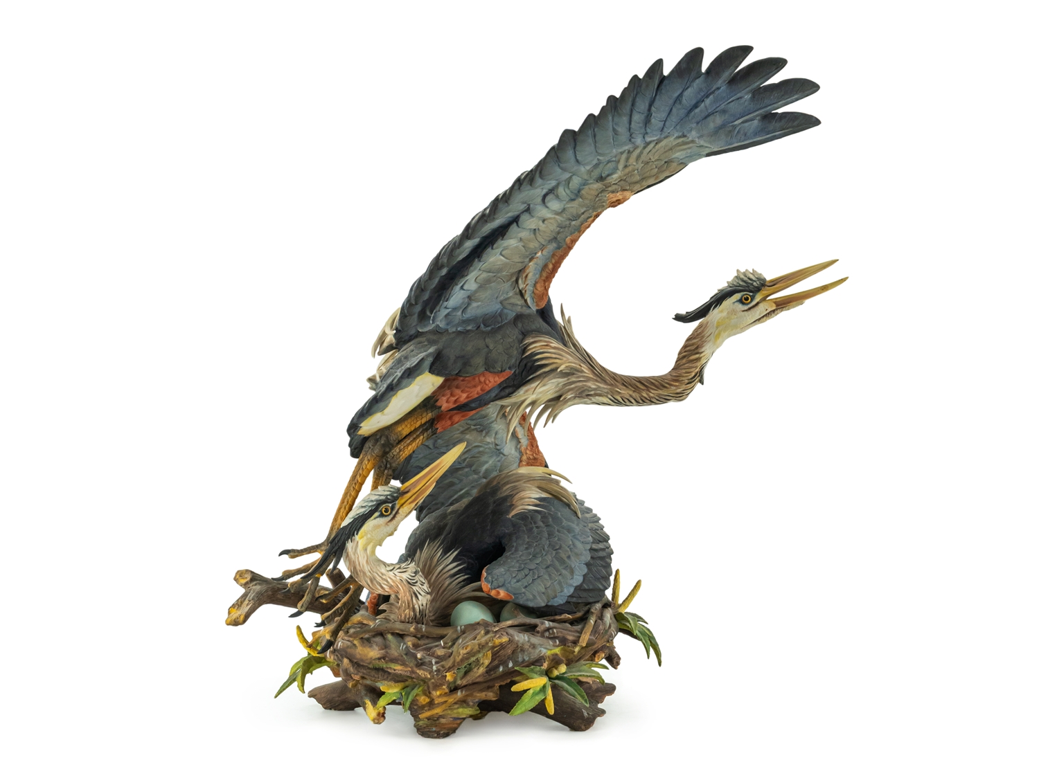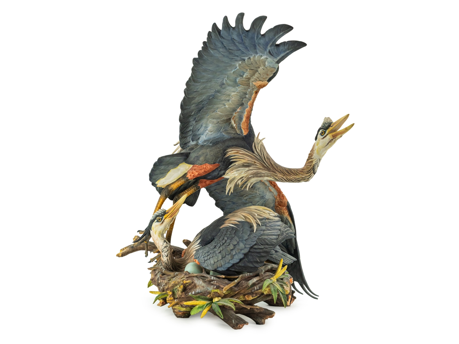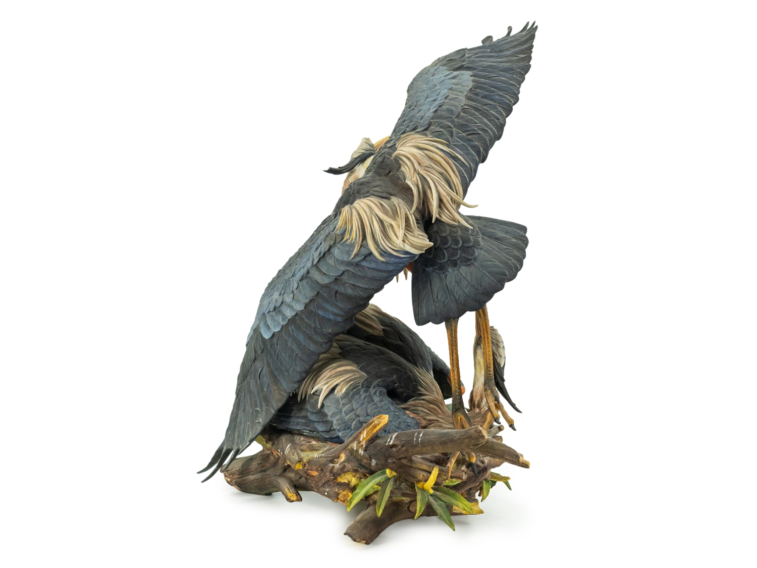 Imposante Porzellanskulptur "The Challenge" der Manufaktur Hutschenreuther. Entwurf: Gunther R. Granget. Limitierte Serie, hier Nummer 5 von 200. Höhe: ca. 49,5 cm. Polychrom bemalte, naturalistische Darstellung eines Reiherpärchens im Nest, grüne Stempelmarke Lorenz Hutschenreuther und Künstlersignet. Farne und Geäst sowie eine Federspitze bestoßen. Ansonsten sehr guter Erhaltungszustand.
