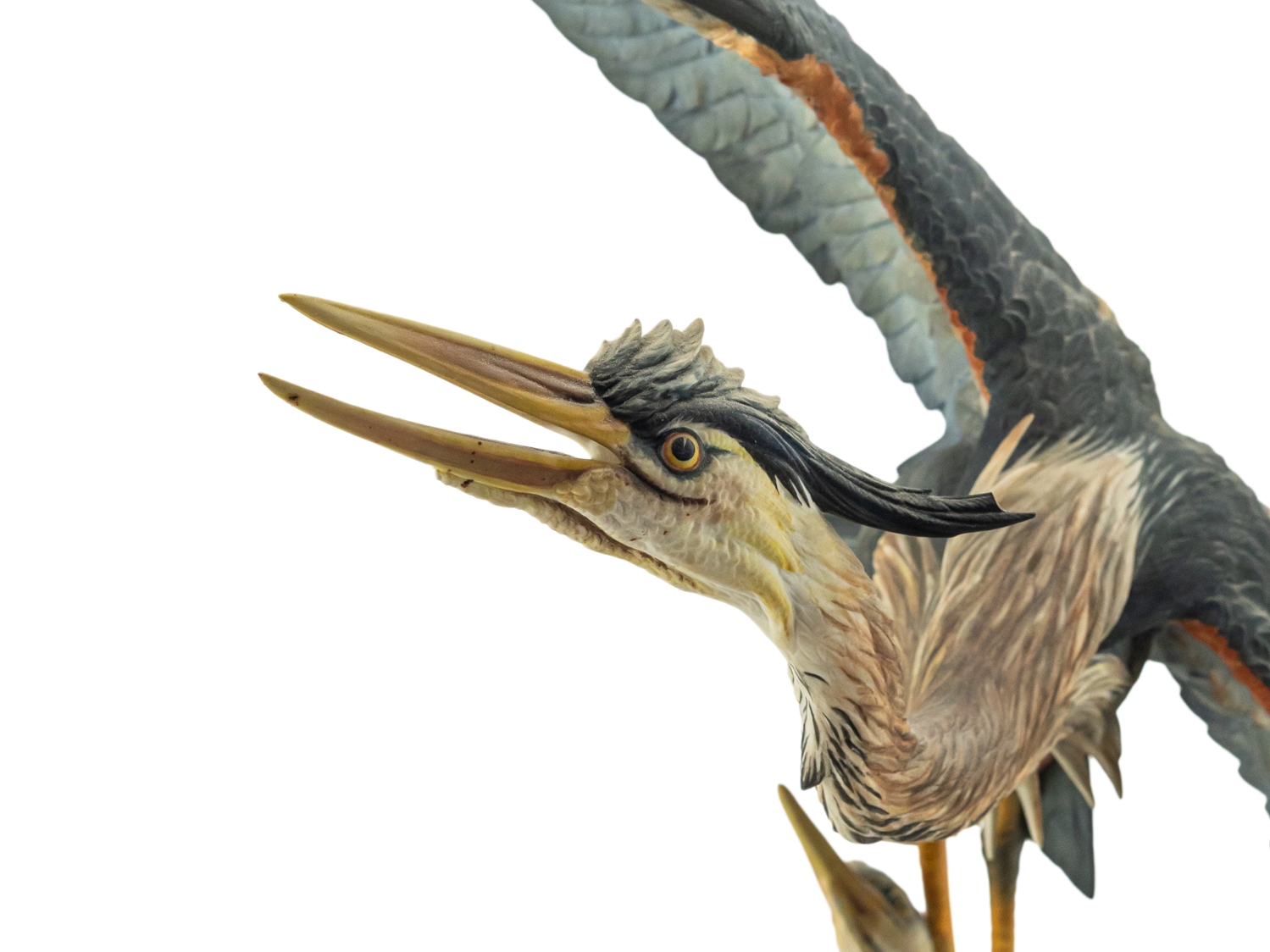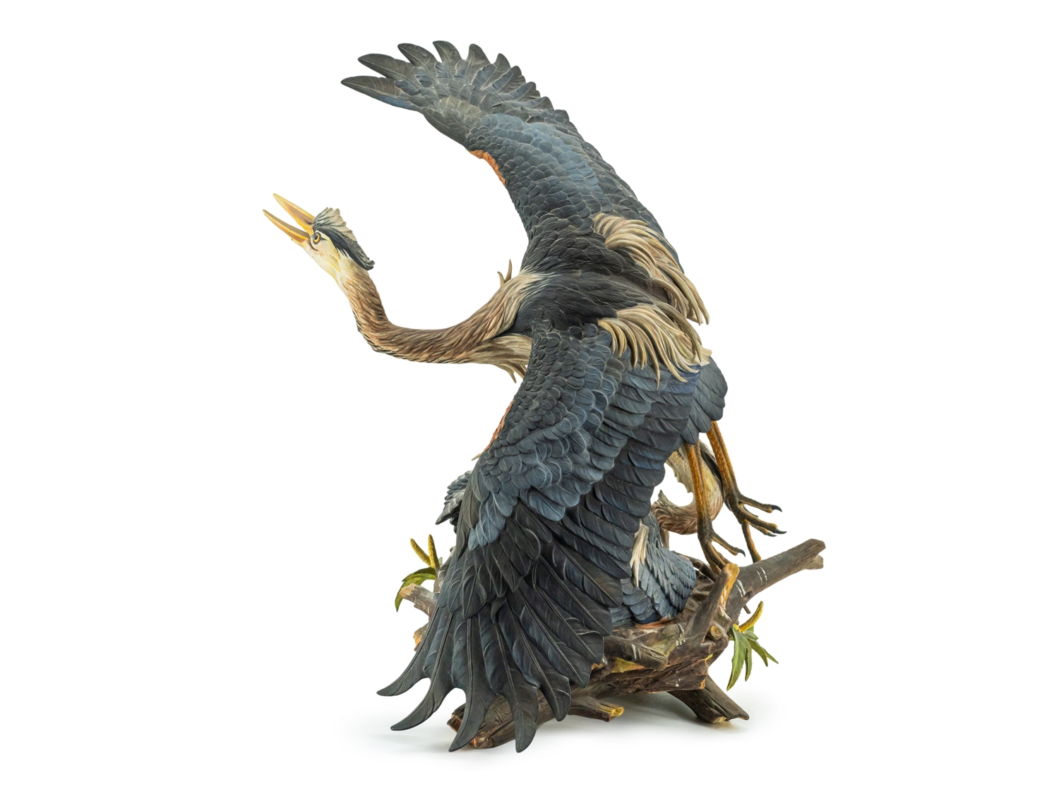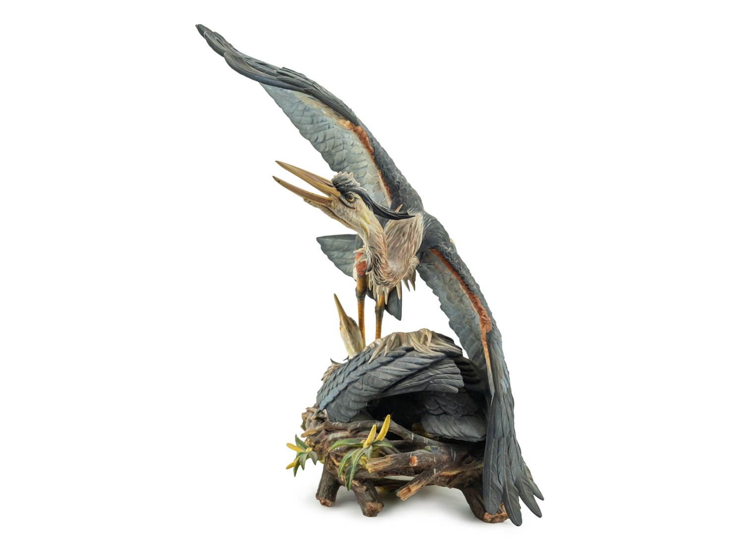 Imposante Porzellanskulptur "The Challenge" der Manufaktur Hutschenreuther. Entwurf: Gunther R. Granget. Limitierte Serie, hier Nummer 5 von 200. Höhe: ca. 49,5 cm. Polychrom bemalte, naturalistische Darstellung eines Reiherpärchens im Nest, grüne Stempelmarke Lorenz Hutschenreuther und Künstlersignet. Farne und Geäst sowie eine Federspitze bestoßen. Ansonsten sehr guter Erhaltungszustand.