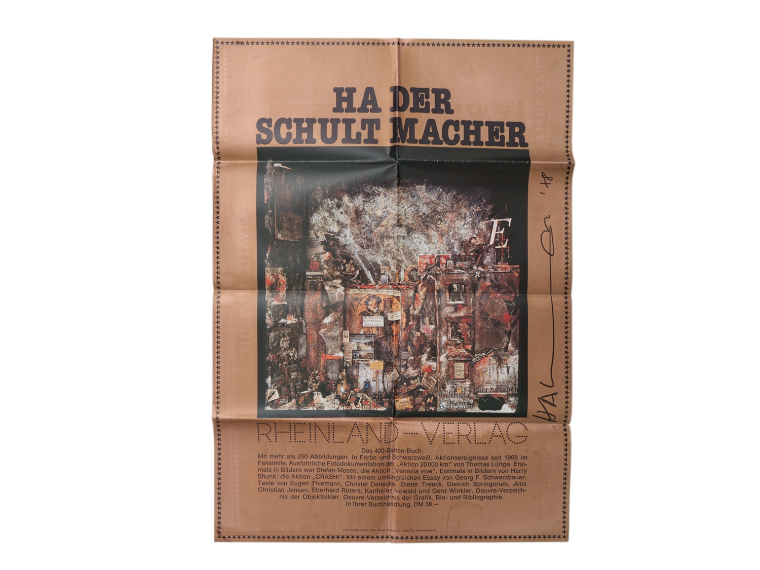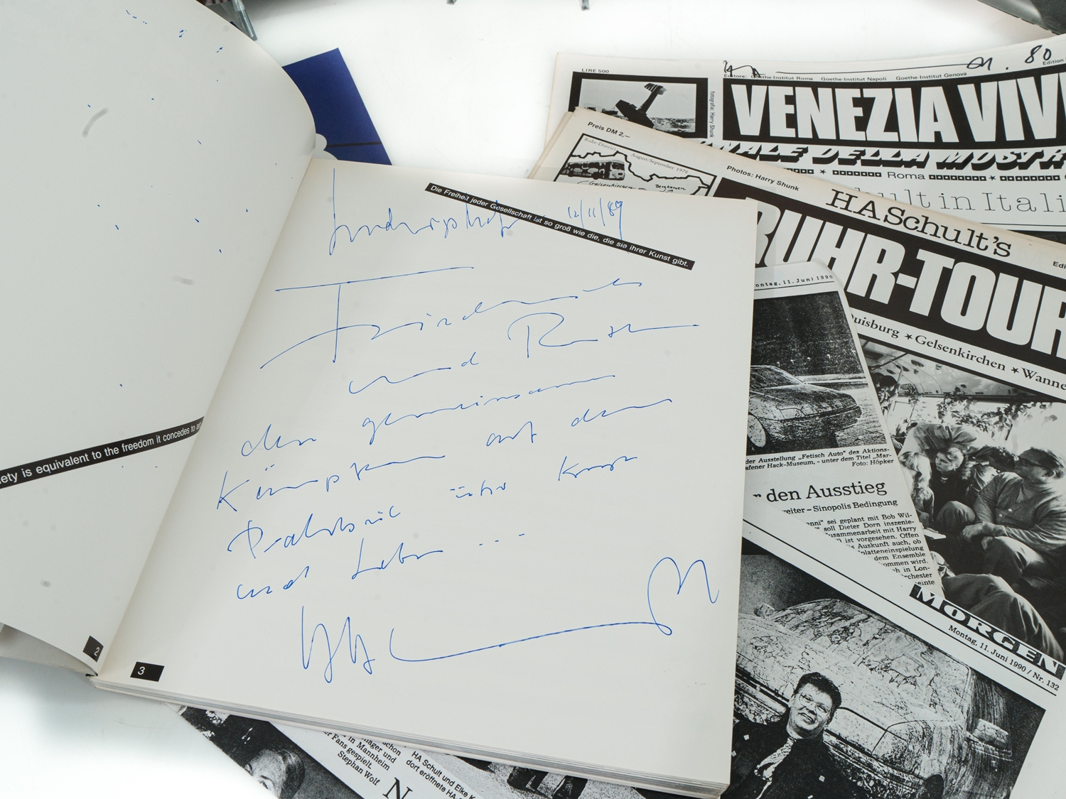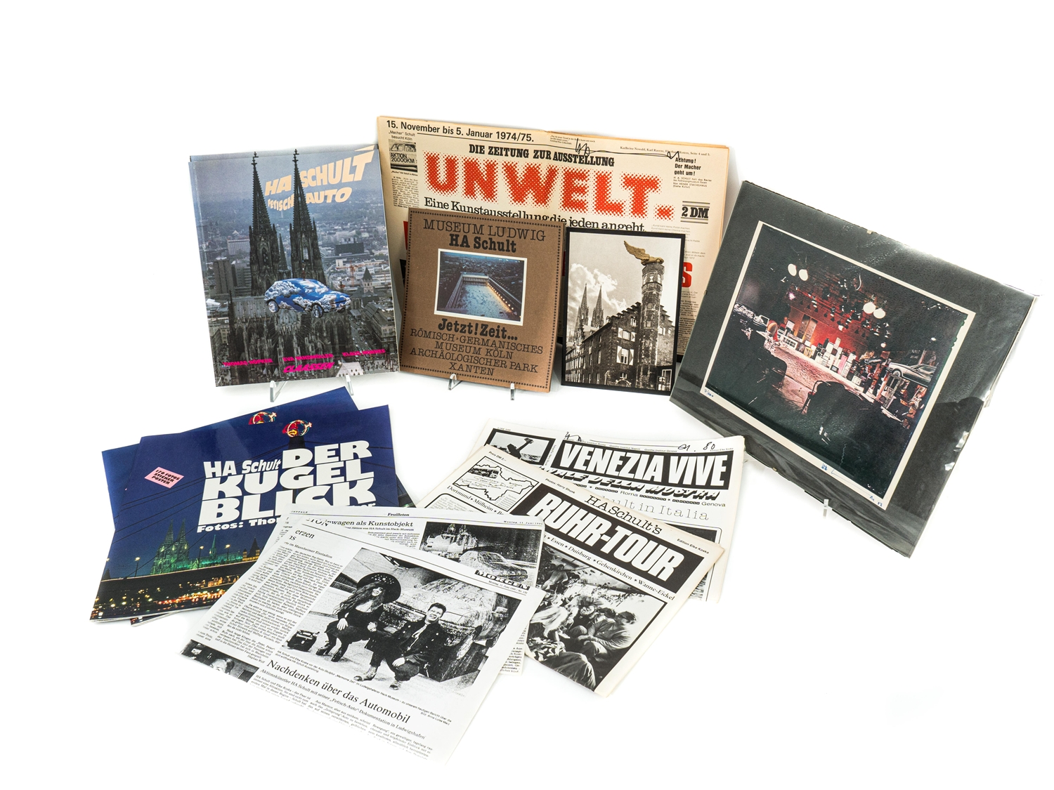 Großes Konvolut HA Schult (1939), bestehend aus sieben Fotocollagen, signiert, gerahmt. Rahmenmaße: zwischen 28 x 35 cm und 40 x 30 cm. Außerdem zwei Exemplare des Bildbandes "Fetisch Auto" und zwei Exemplare "Der Kugelblick", jeweils signiert. Dazu noch reichlich Prospekte, Zeitungsartikel etc. teilweise signiert. Insgesamt befindet sich das Konvolut in einem guten Zustand.