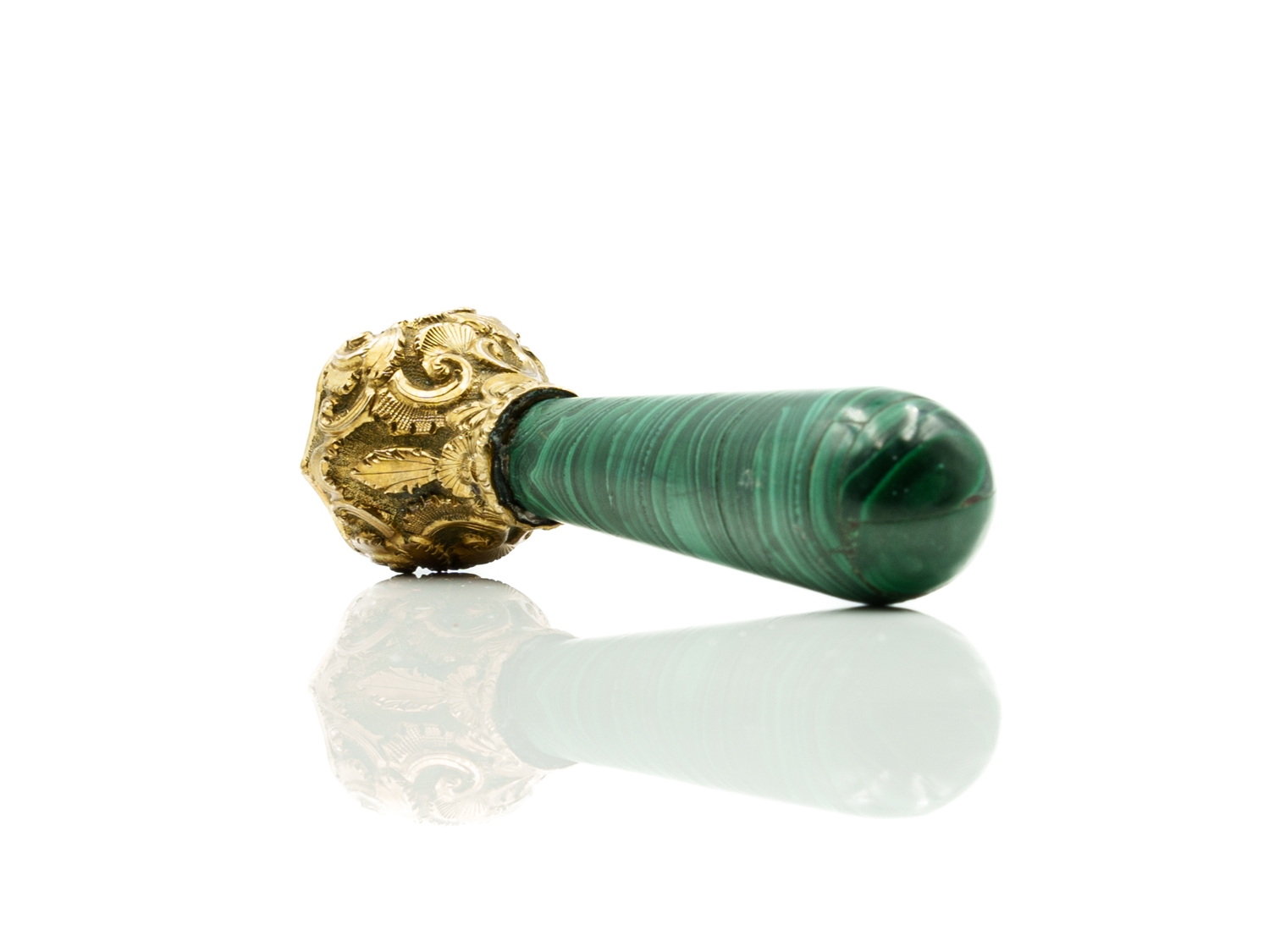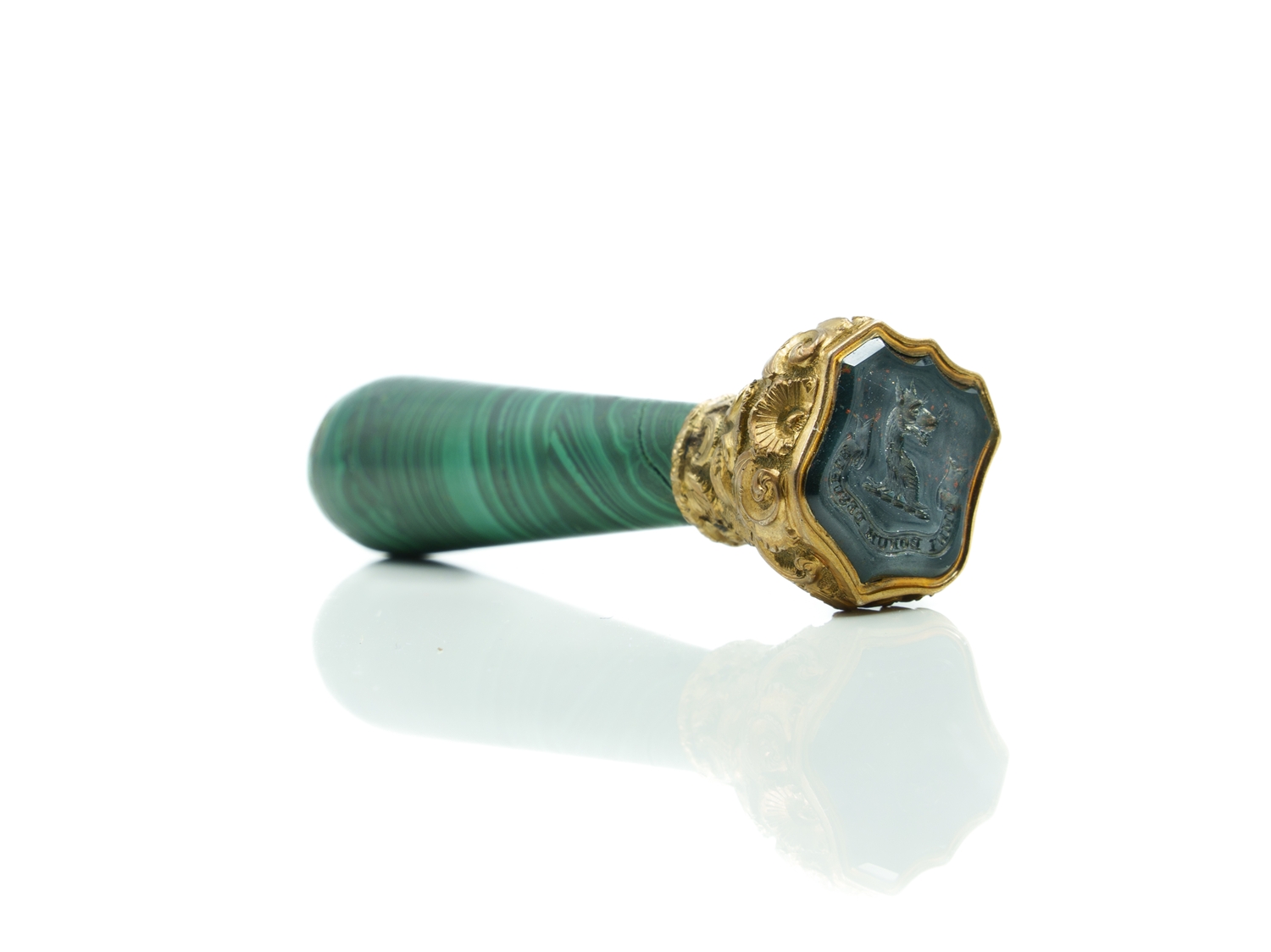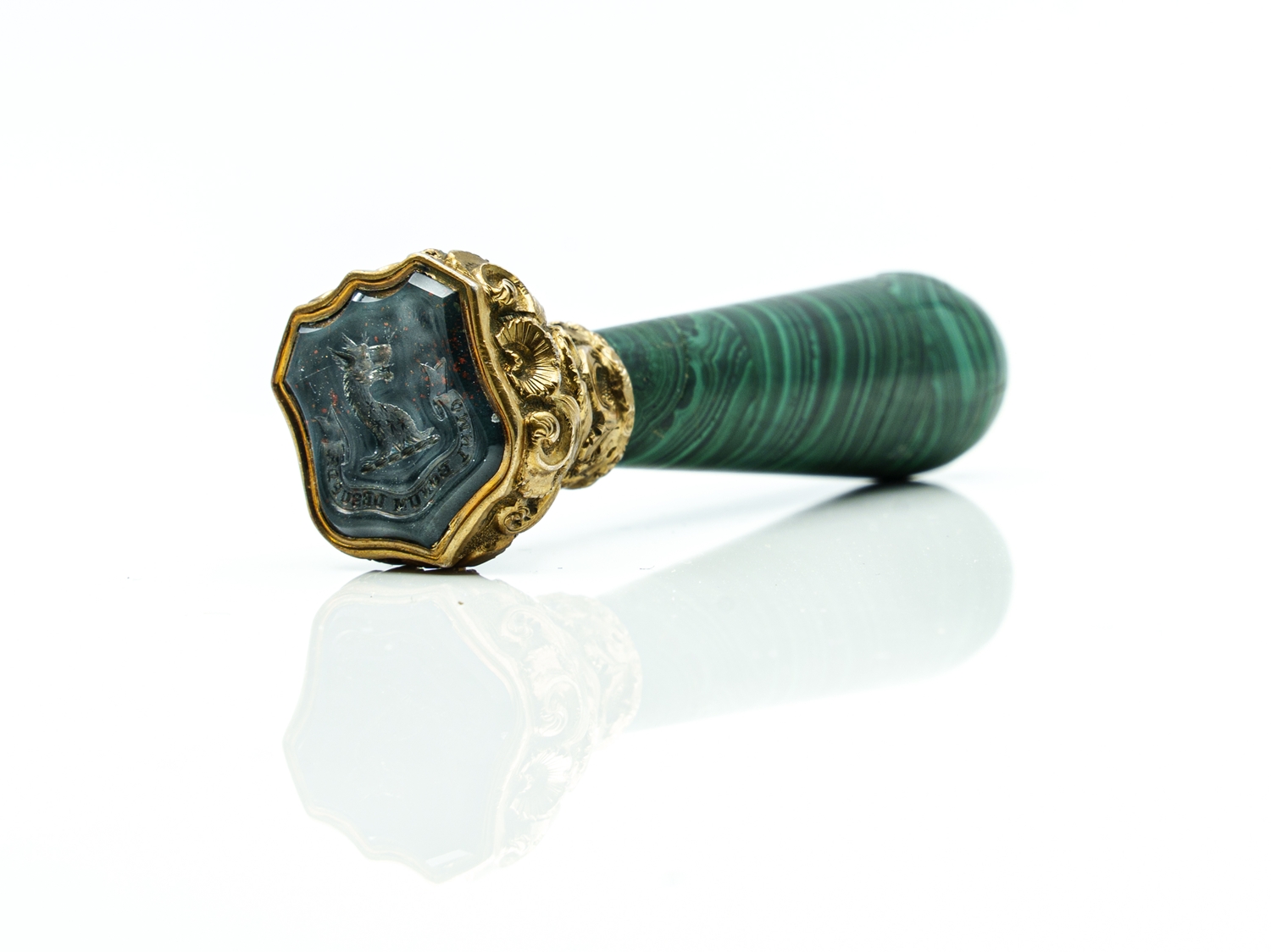 Antike Petschaft aus vergoldetem Silber mit einem Griff aus Stücken von Malachit. Die Petschaft, wohl 18/19.Jahrhundert, trägt als Siegel einen Heliotropen in Wappenform und darin - um einen Drachen graviert- die Worte OMNI BONUM DESUPER. Länge der Petschaft ca. 6,5 cm.
