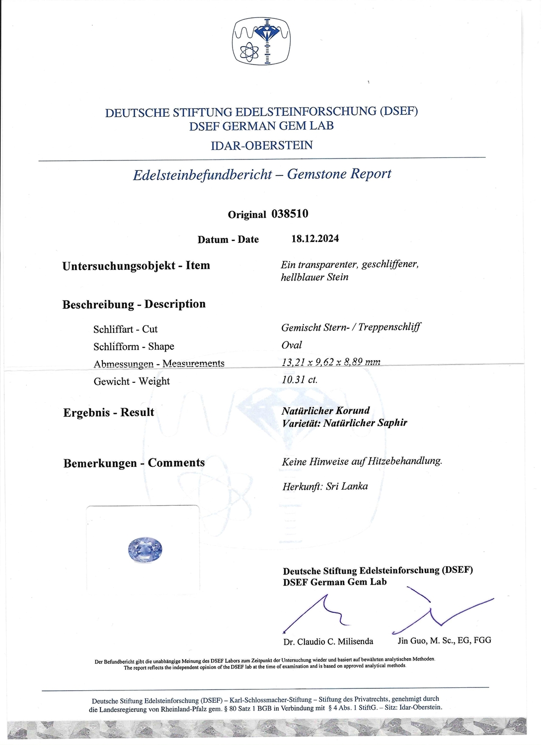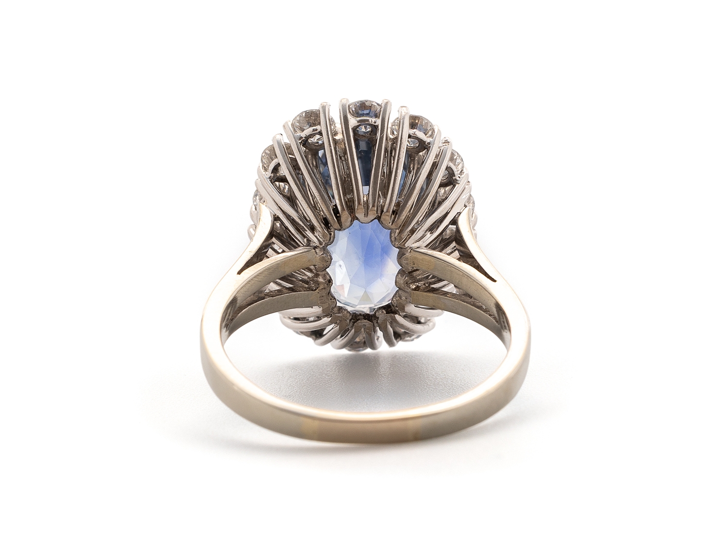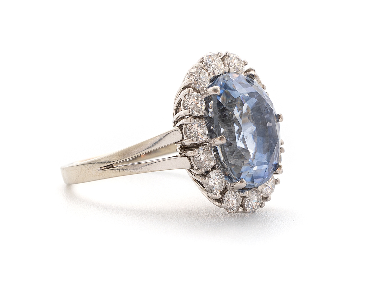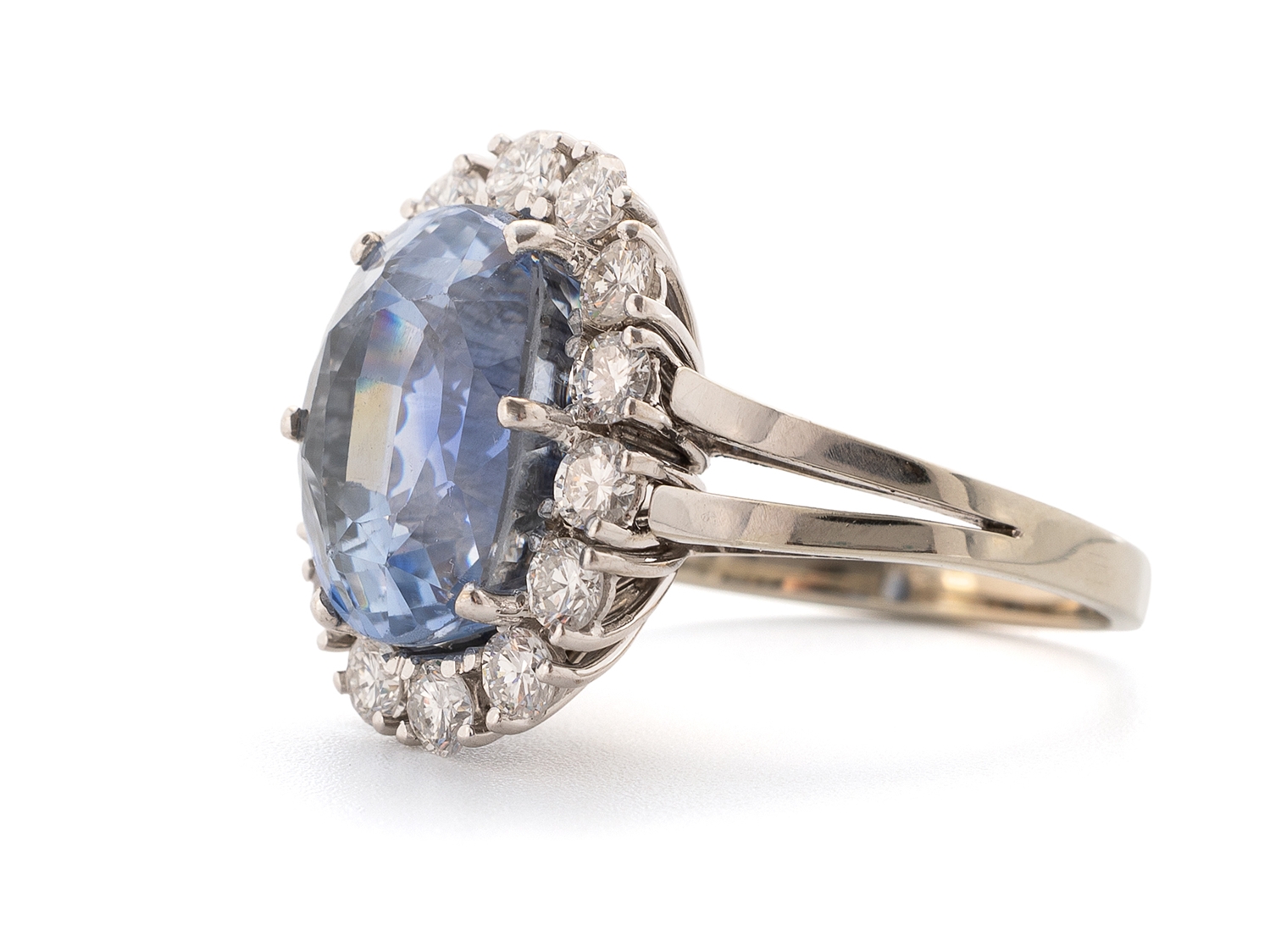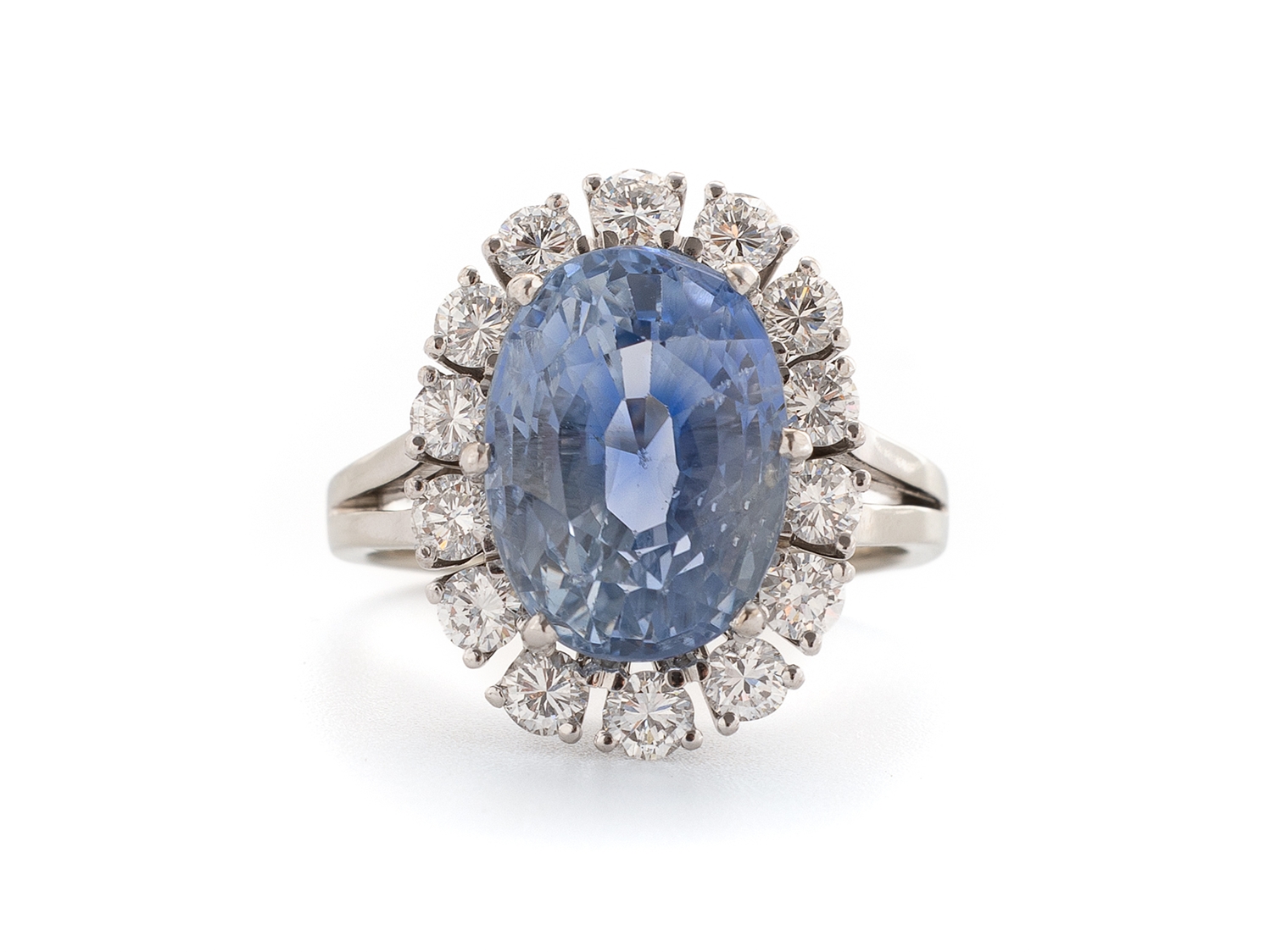 Exquisiter Ring aus Weißgold, in der Schiene mit 750 punziert. im Ring gefasst ein hellblauer, unerhitzter Saphir aus Sri Lanka (gemischter Stern-/Treppenschliff, Oval, 13,21x9,62x8,89 mm) von 10,31 Carat, sowie 14 Brillanten (hoher Farb-/hoher bis mittlerer Reinheitsgrad) von zusammen etwa 1,30 Carat. Der Ring hat einen guten gebrauchten Zustand, die Weite 55/17,5, das Gewicht beträgt 8,02 Gramm. DSEF Edelsteinbefundbericht 038510 vom 18.12.2024 anbei.