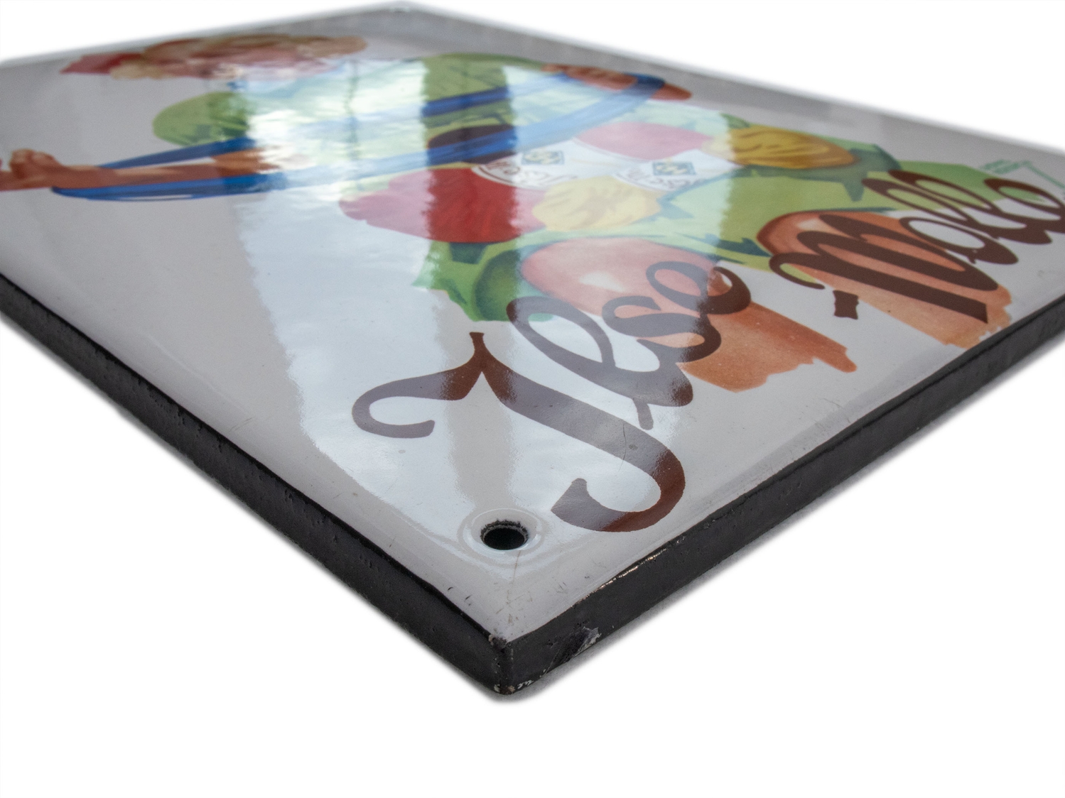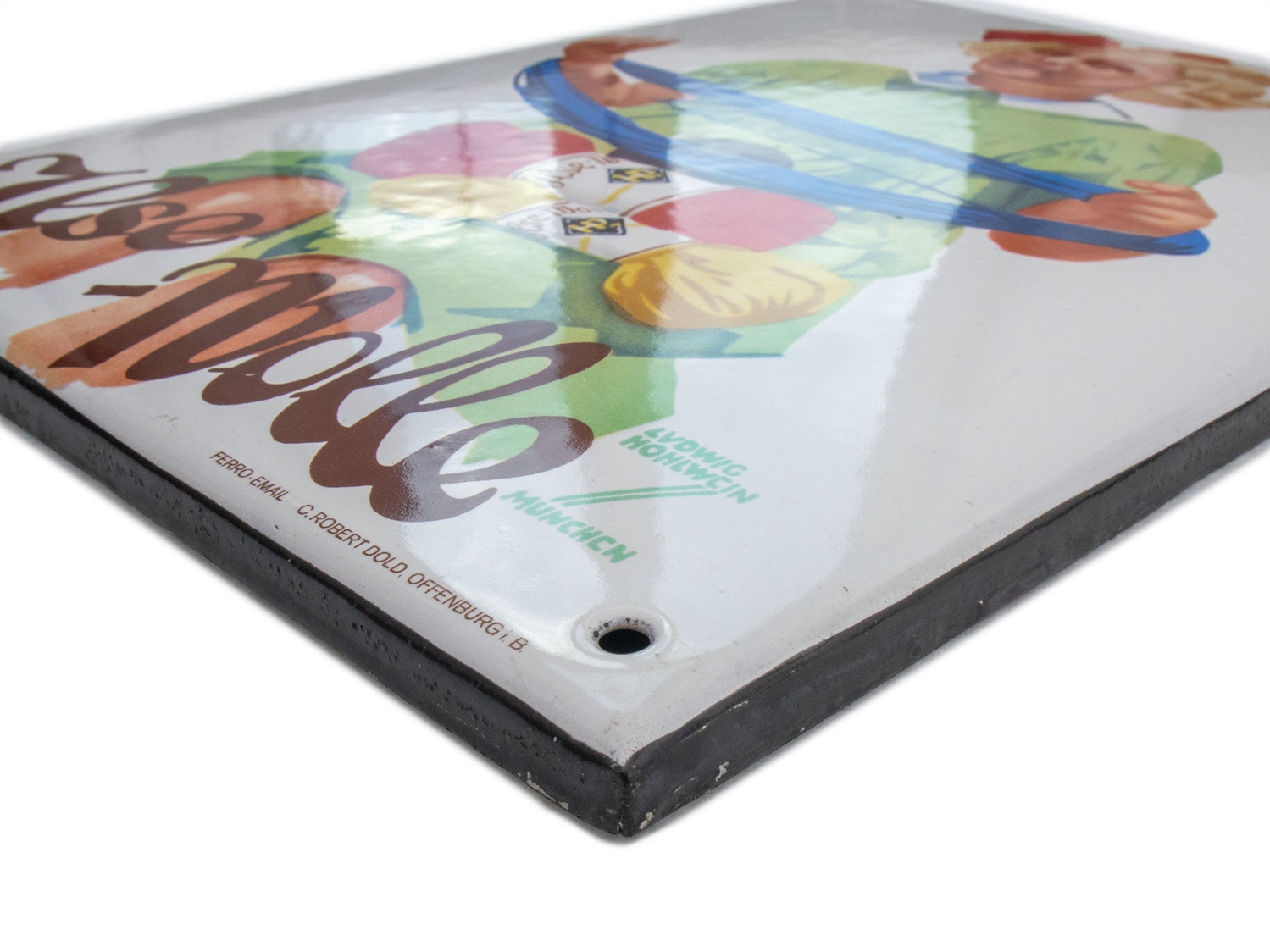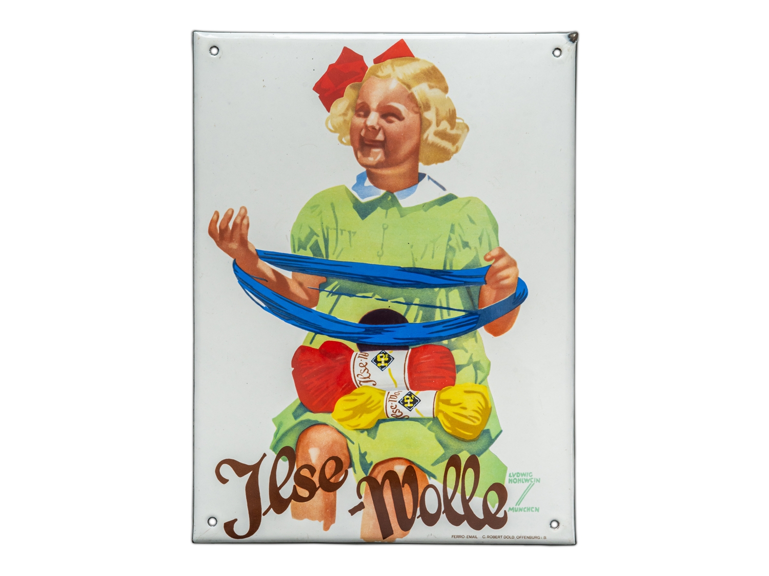 Emailschild Ilse Wolle, flach, abgekantet, Emaillierung lithographiert. Sehr schöner Hochglanz und perfekt in den Farben, partielle oberflächliche Mikrokratzer, die man kaum sehen kann. Signiert unten rechts: Hohlwein München (Ludwig Hohlwein, 1874-1949), Bezeichnet: Ferro Email C. Robert Dold, Offenburg i.B. Maße: ca. 38 x 28 cm. Keine Restaurierungen oder sonstige Verschönerungen, Zustand 1-!. In unseren Auktionen erwerben Sie garantiert nur alte Originale.