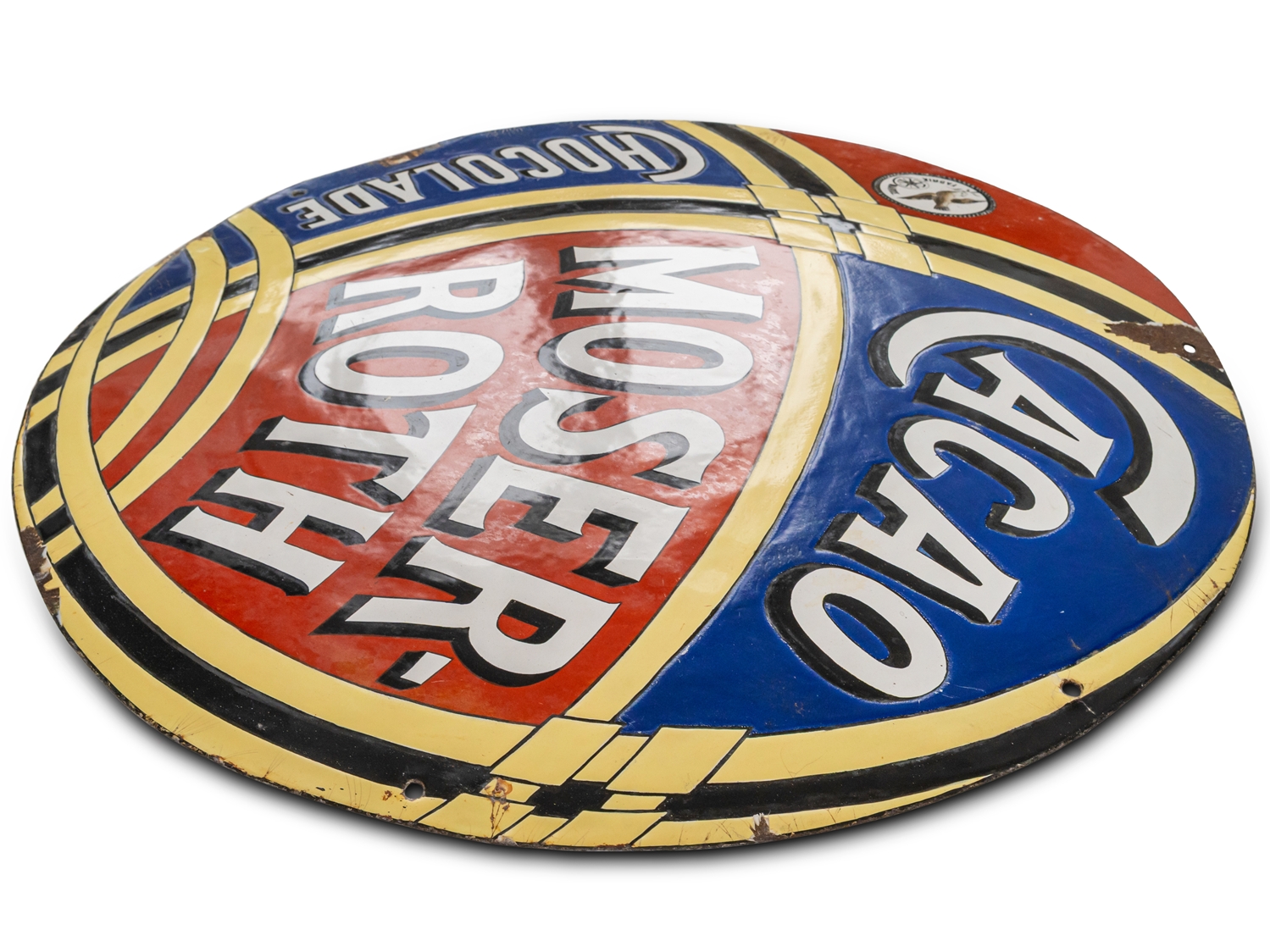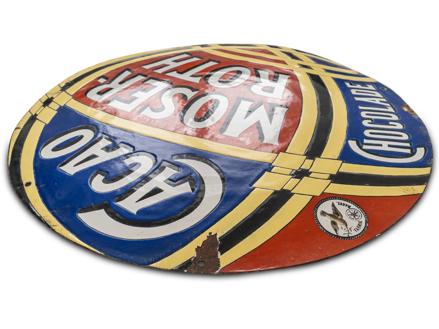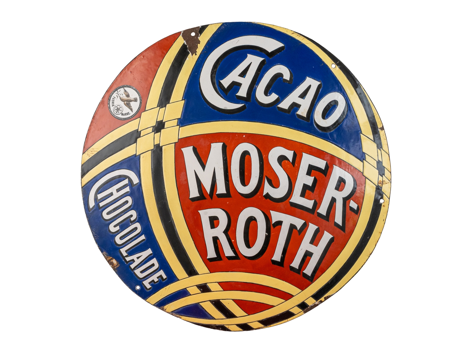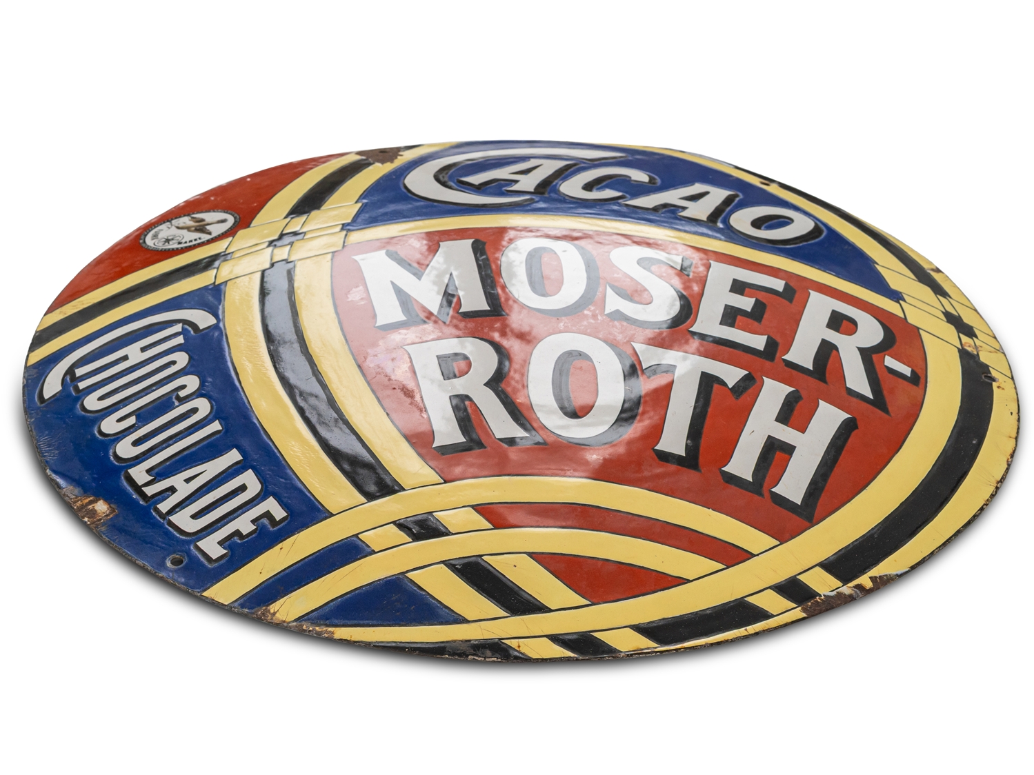 Emailschild Moser-Roth, gewölbt, Emaillierung sehr erhaben, zuckergussartig, eingefüllt und lithographiert. An diesem Schild kann man wie bei kaum einem anderen die frühe Emaillierkunst erkennen. Die Unebenheit der Emaillierung, die handgezogenen Linien, einfach nur herrlich. Sehr gut im Glanz und Farben. Oberfläche nahezu kratzerfrei, leichte Spinnenbildung im Randbereich. Durchmesser: ca. 60 cm. Nichts restauriert oder geschönt, Zustand 1-2! In unseren Auktionen erwerben Sie garantiert nur alte Originale.