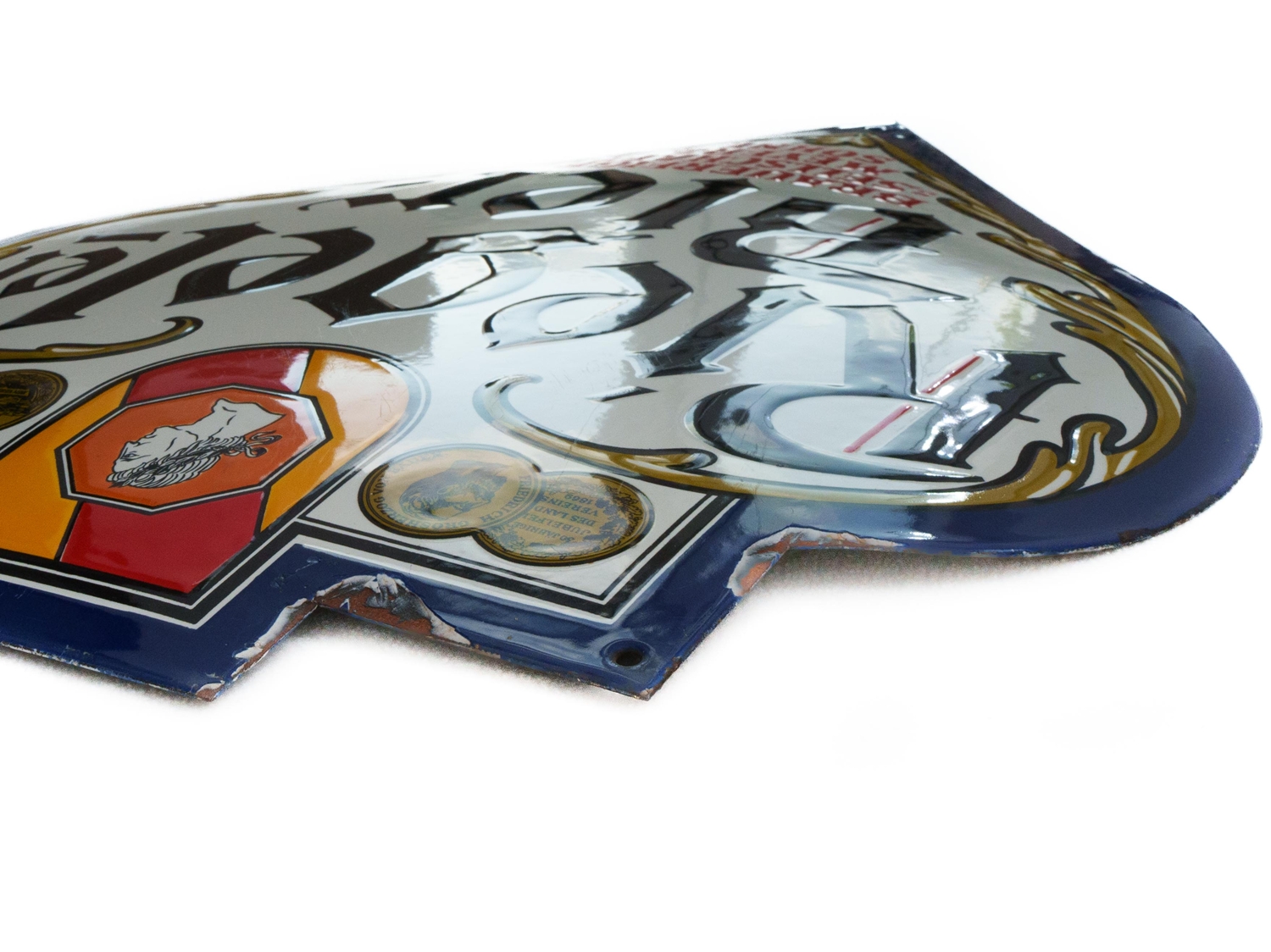Emailschild Brauerei Riegel, gewölbt, Emaillierung sehr erhaben schabloniert und lithographiert. Brennfrischer Hochglanz und leuchtende Farben, vereinzelte Mikrokratzer, die man nur in der Lichtreflektion erkennen kann. Rückseitig noch Reste des Montagehinweises. Bezeichnet: Ferro-Email, Dold Offenburg i.B. Maße: ca. 56 x 49 cm. Keine Restaurierungen oder sonstige Verschönerungen. Zustand: 1-! In unseren Auktionen erwerben Sie garantiert nur alte Originale.