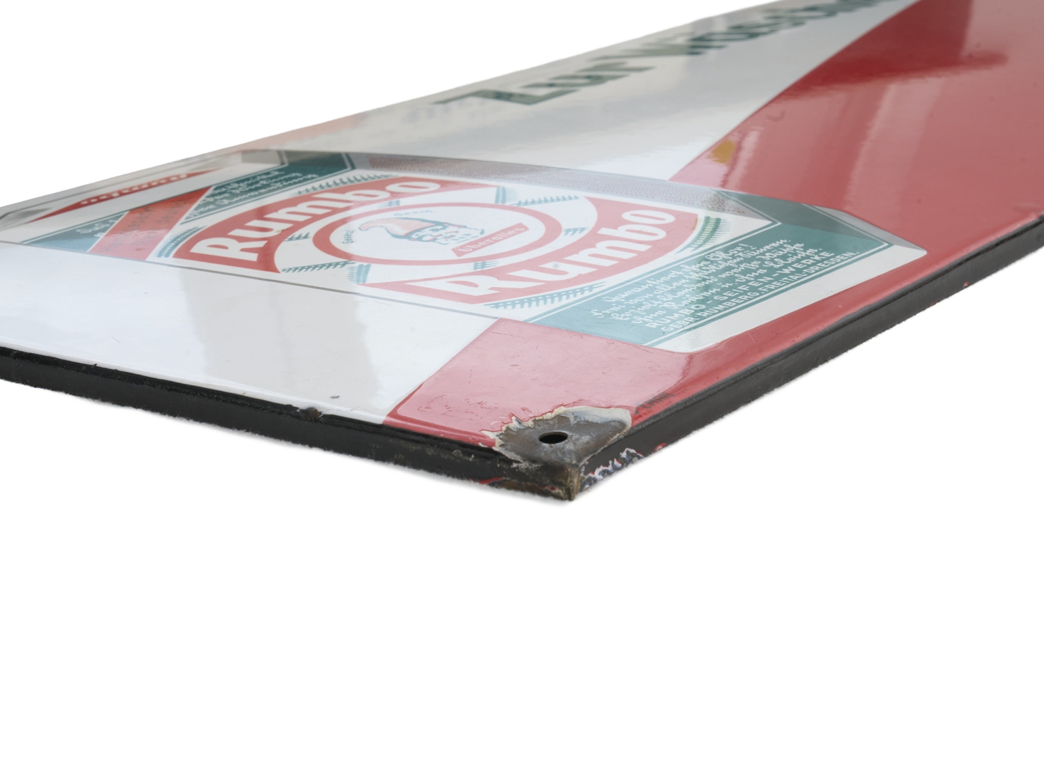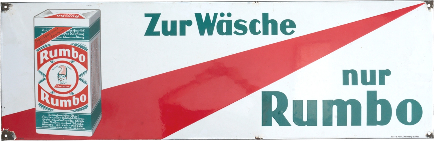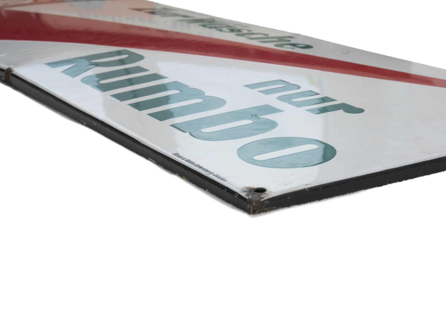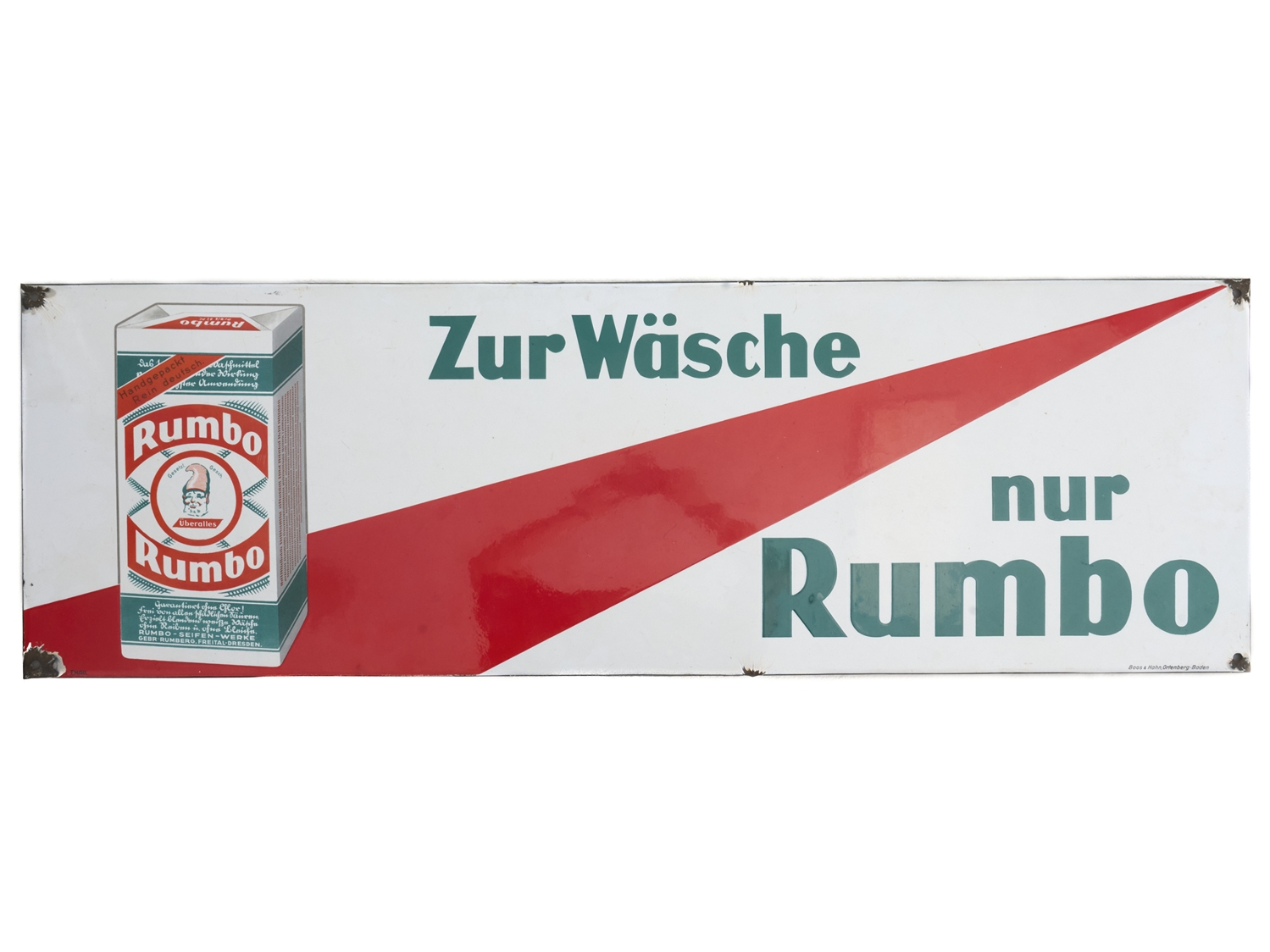 Emailschild Rumbo, flach abgekantet, Emaillierung schabloniert und umgedruckt. Dreidimensionale Darstellung der Seifenpackung, neben dem Markenzeichen, dem Zwerg, zierte auch noch eine Banderole die Packung mit der Aufschrift "handgepackt, Rhein Deutsch" Sehr gut in Glanz und Farben, leichte oberflächige Mikrokratzer. Bezeichnet: Pyro-Email, Boos & Hahn, Ortenberg-Baden. Maße: ca. 31,5 x 97,5 cm. Keine Restaurierungen oder sonstige Verschönerungen, Zustand 1-. In unseren Auktionen erwerben Sie garantiert nur alte Originale.