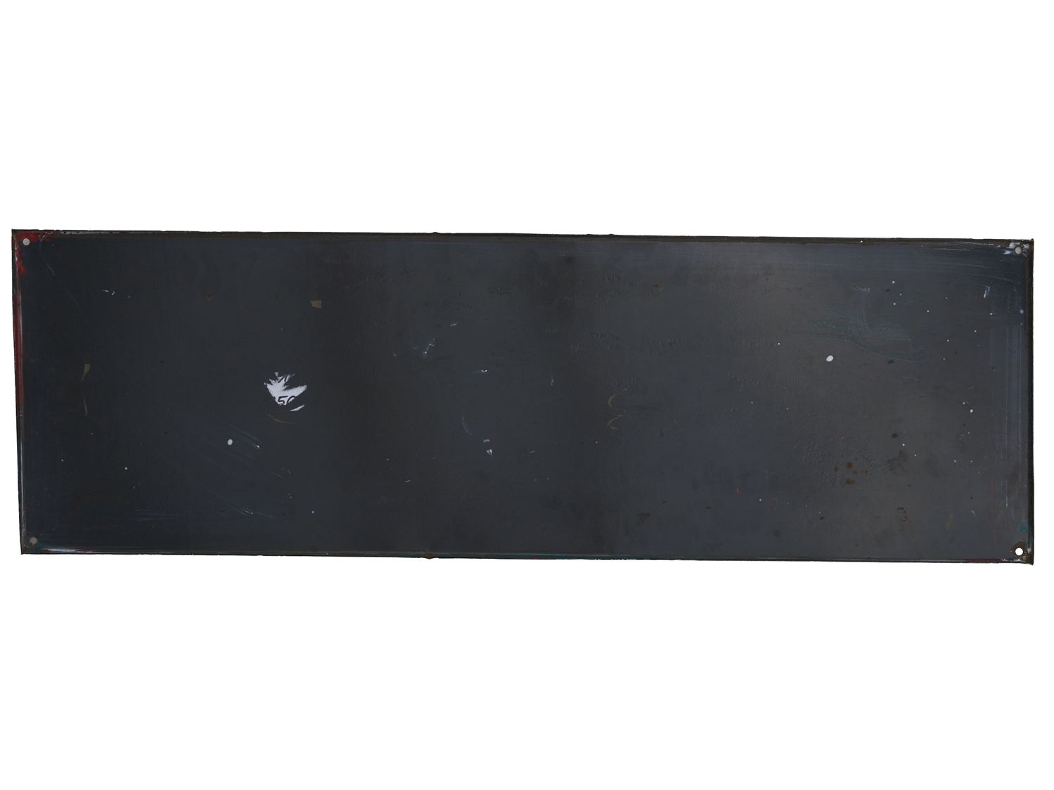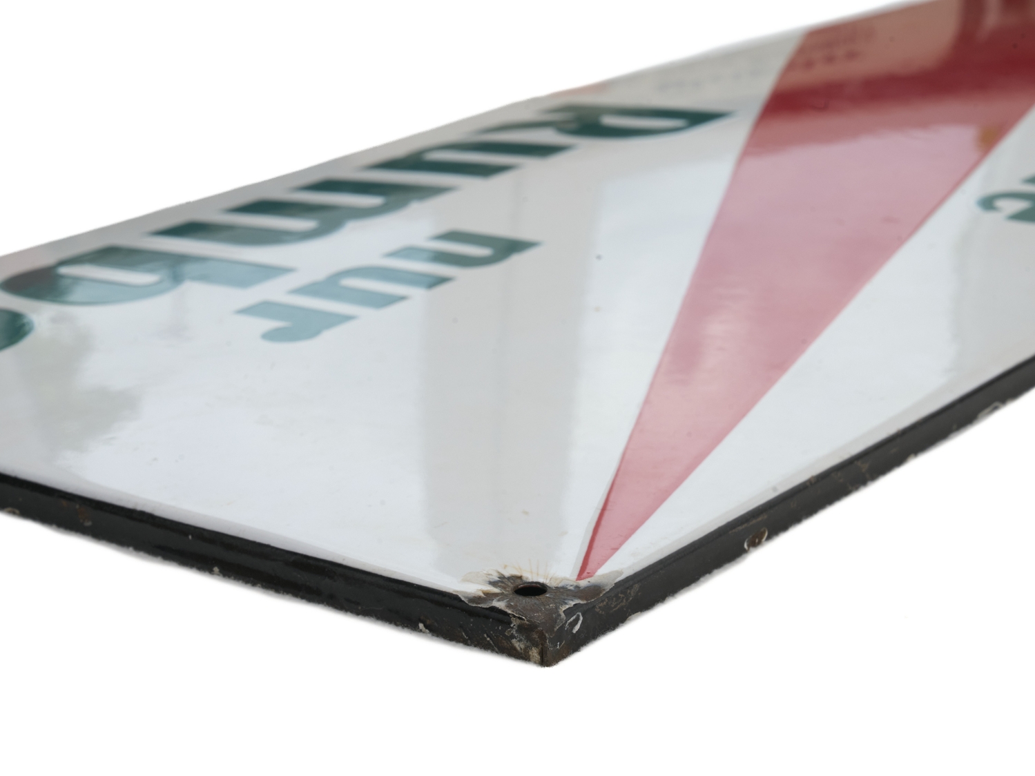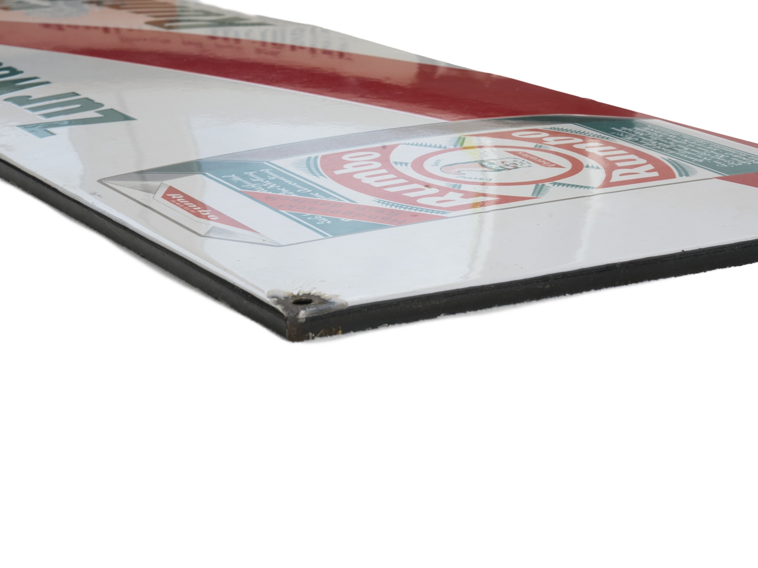 Emailschild Rumbo, flach abgekantet, Emaillierung schabloniert und umgedruckt. Dreidimensionale Darstellung der Seifenpackung, neben dem Markenzeichen, dem Zwerg, zierte auch noch eine Banderole die Packung mit der Aufschrift "handgepackt, Rhein Deutsch" Sehr gut in Glanz und Farben, leichte oberflächige Mikrokratzer. Bezeichnet: Pyro-Email, Boos & Hahn, Ortenberg-Baden. Maße: ca. 31,5 x 97,5 cm. Keine Restaurierungen oder sonstige Verschönerungen, Zustand 1-. In unseren Auktionen erwerben Sie garantiert nur alte Originale.