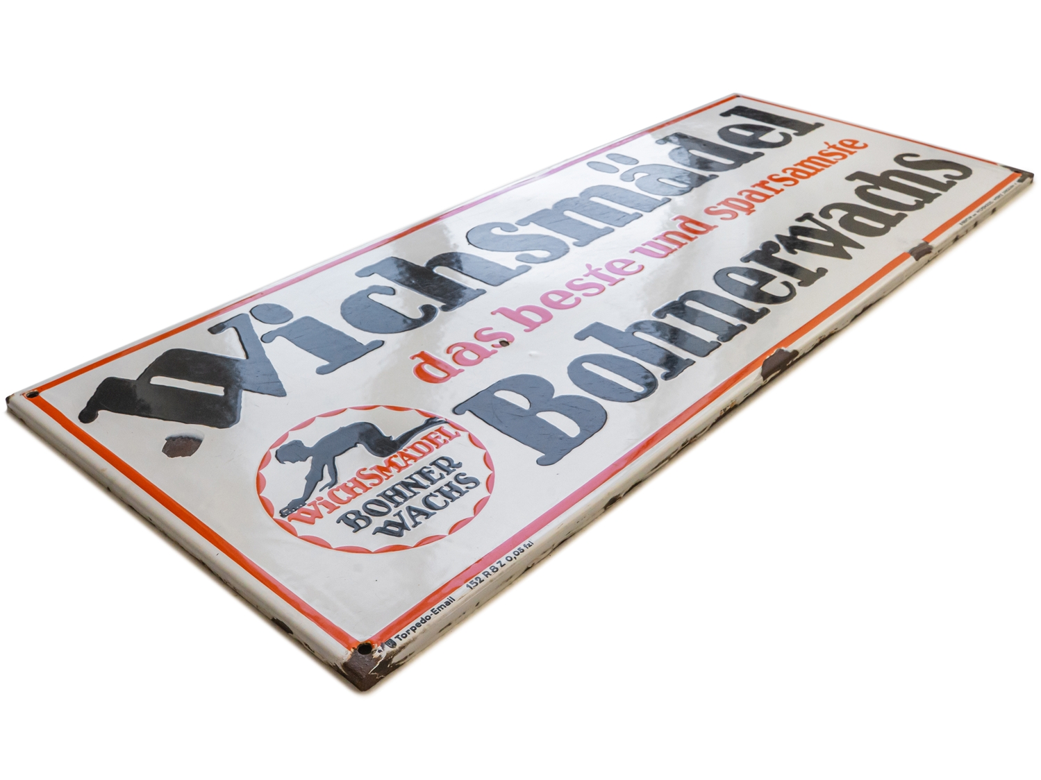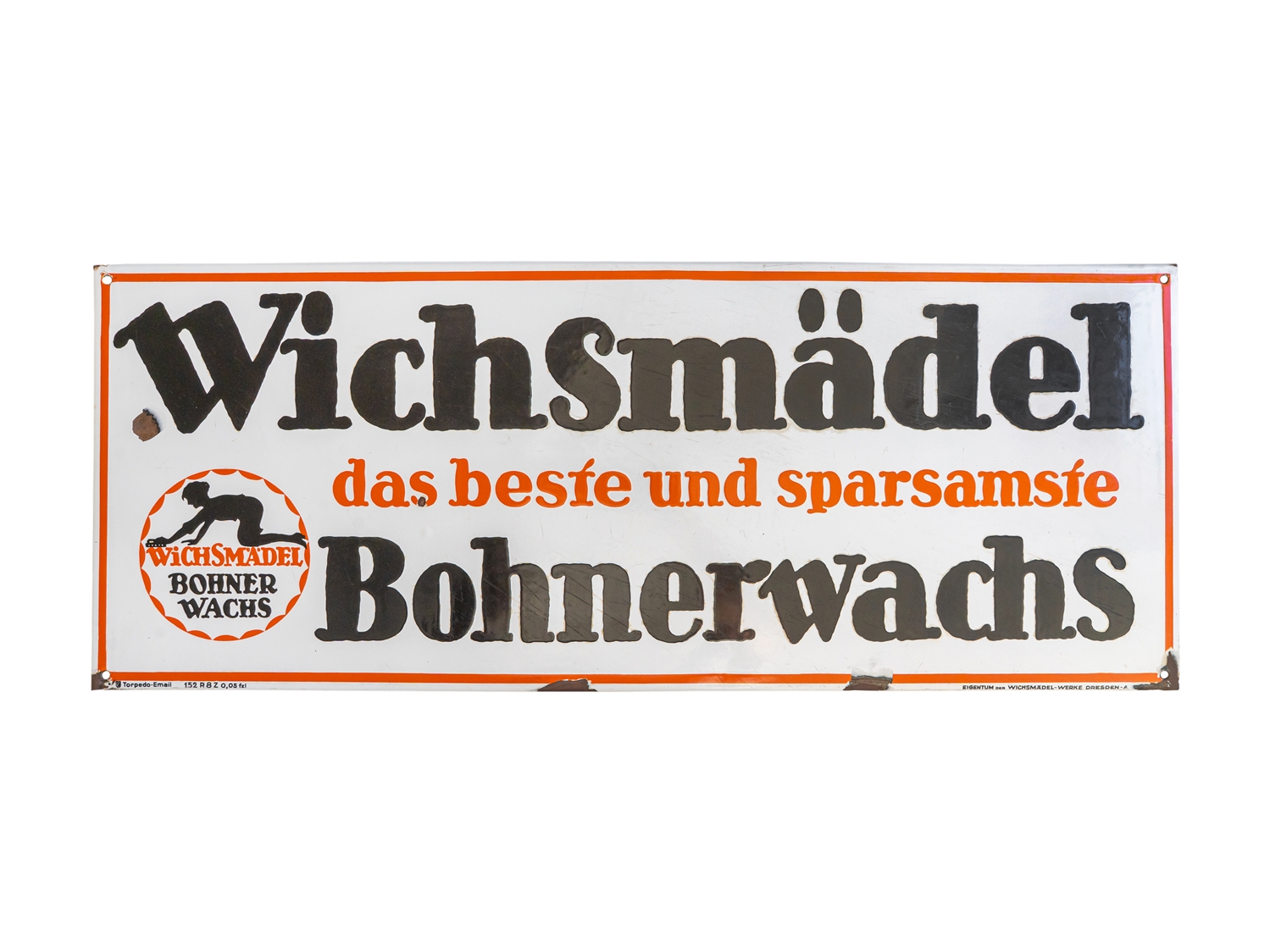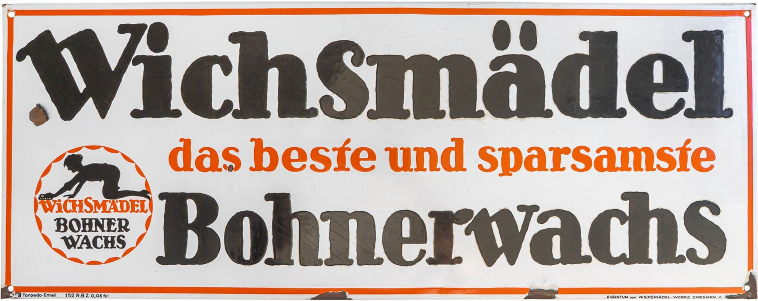 Emailschild Wichsmädel Bohnerwachs, flach, abgekantet, Emaillierung schabloniert. Extrem selten, diese großformatige Ausführung des Wichsmädels. Aus heutiger Sicht wohl eine der kuriosesten Werbeslogans überhaupt. Sehr schöner Glanz und satte Farben, Oberfläche mit Kratzern, daher die strenge Bewertungsnote. Bezeichnet: Torpedo-Email, Eigentum der Wichsmädel-Werke Dresden. Maße: ca. 38x 98 cm. Nichts geschönt oder restauriert, Zustand 3+! In unseren Auktionen erwerben Sie garantiert nur alte Originale.