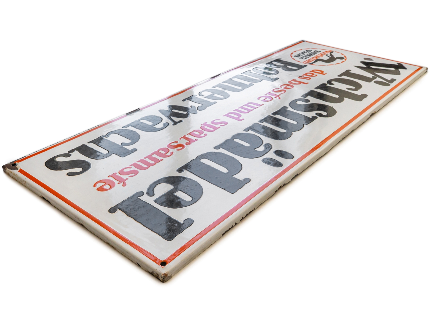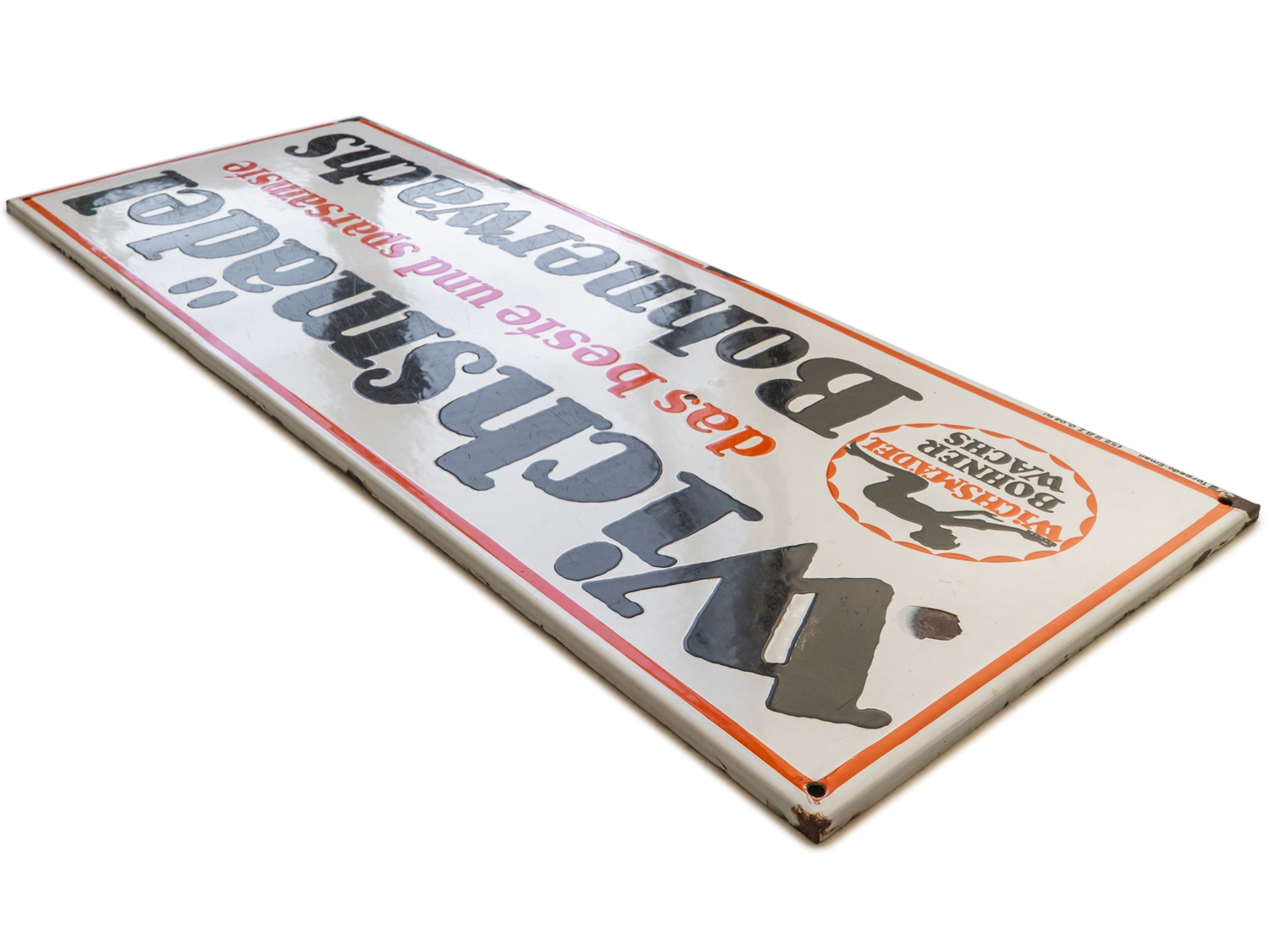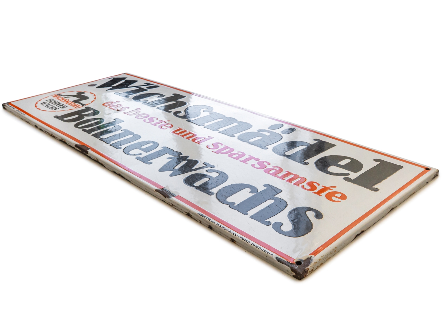 Emailschild Wichsmädel Bohnerwachs, flach, abgekantet, Emaillierung schabloniert. Extrem selten, diese großformatige Ausführung des Wichsmädels. Aus heutiger Sicht wohl eine der kuriosesten Werbeslogans überhaupt. Sehr schöner Glanz und satte Farben, Oberfläche mit Kratzern, daher die strenge Bewertungsnote. Bezeichnet: Torpedo-Email, Eigentum der Wichsmädel-Werke Dresden. Maße: ca. 38x 98 cm. Nichts geschönt oder restauriert, Zustand 3+! In unseren Auktionen erwerben Sie garantiert nur alte Originale.