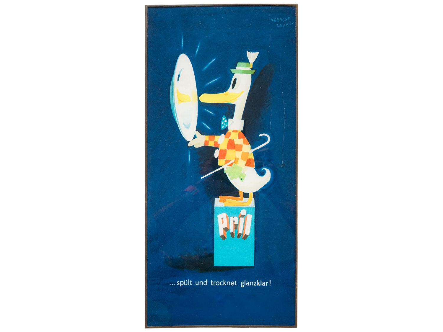 Werbeschild aus Glas, hinter Glas lithographiert, in originaler Blechumrahmung gefasst. Entwurf und Signatur: Herbert Leupin (1916 Beinwil am See - 1999 Basel). Pril wurde 1951 von der Henkel-Tochter „Böhme Fettchemie GmbH“ als Pulverlösung auf den Markt gebracht und zunächst in Packungen, wie hier dargestellt, vertrieben. Erst 1959 folgte die heute bekannte flüssige Variante. Der hier zu sehende Entwurf wurde 1952 publiziert, das Motiv zeigt die berühmte Pril-Ente, die mit sichtbarer Freude ein blitzblankes Geschirrstück präsentiert. Maße: ca. 45 × 21 cm. Farben von schöner Leuchtkraft, keinerlei Restaurierungen oder Übermalungen. Ein Kratzer im Glas, sonst sehr guter Erhaltungszustand, Zustand 1-! In unseren Auktionen erwerben Sie garantiert nur alte Originale.
