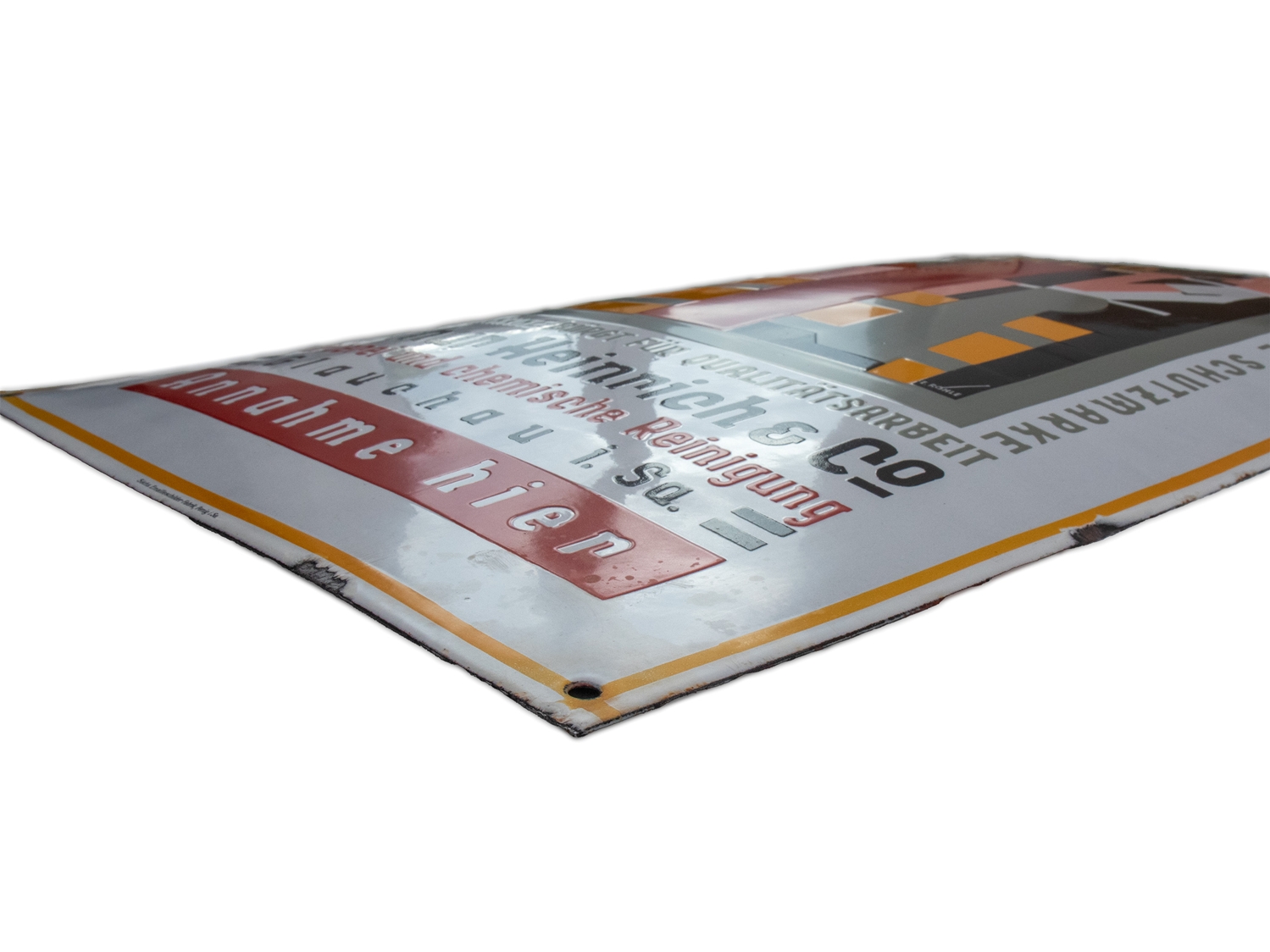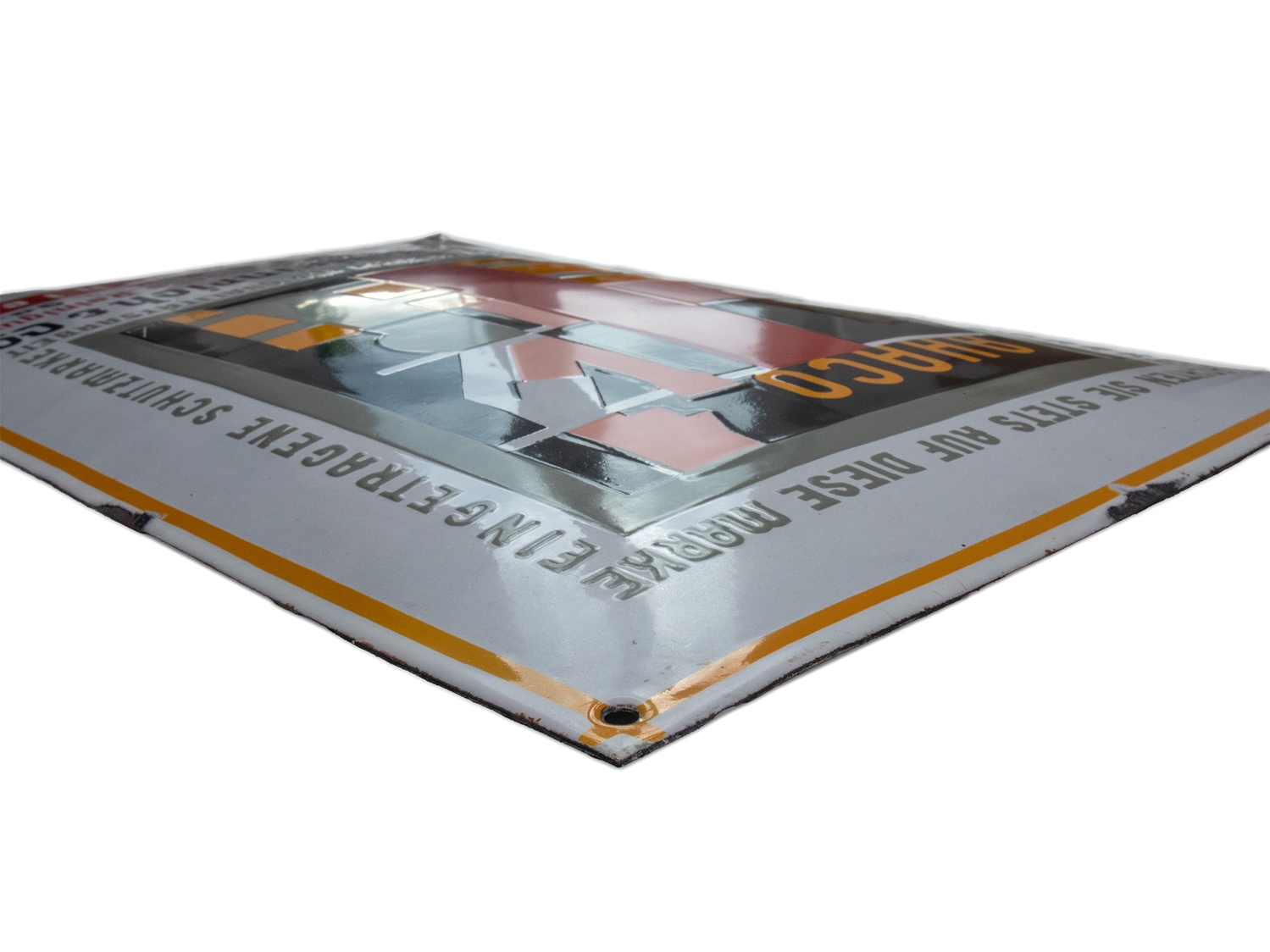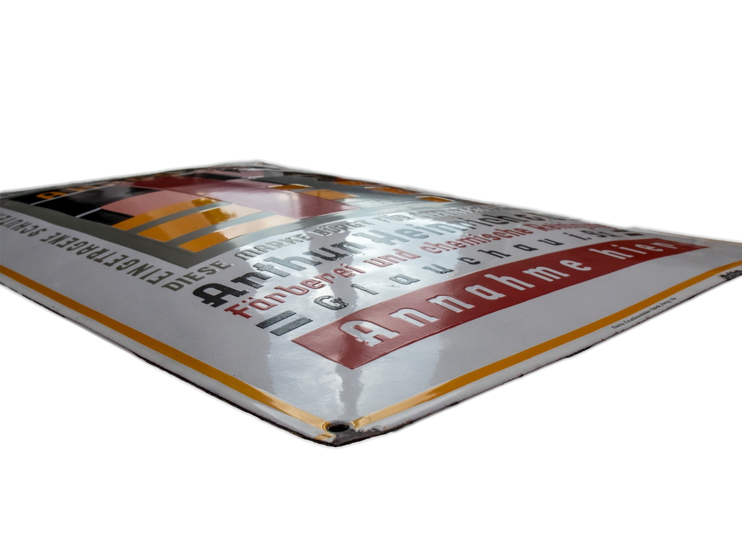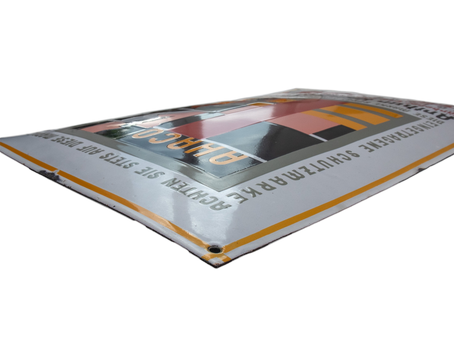 Emailschild Ahaco, Emaillierung schabloniert. Entwurf von E. Röhle (1903 Glauchau - 1991 ebenda), rechts unten signiert. Der hier gezeigte Entwurf des sächsischen Malers und Grafikers Röhle ist ein typisches Beispiel für seine streng geometrische, vom Bauhaus inspirierte Formensprache, die er in den späten 1920er- und frühen 1930er-Jahren entwickelte. Röhles Ansatz steht damit in der Tradition der konstruktivistischen Grafikgestaltung jener Zeit, wie sie in der klassischen Moderne, russischer Avantgarde oder der „Neuen Typografie“ eines Jan Tschichold zu finden ist. Perfekt in Farben und Glanz, Oberfläche kratzerfrei, kleine Stellen um das rechte untere Schraubloch im Seidenglanz. Bezeichnet: Sächs. Emailschilder-Fabrik, Penig i. Sa. Maße: ca. 60 cm x 40 cm. Keine Restaurierungen oder sonstige Verschönerungen, Zustand: 1-! In unseren Auktionen erwerben Sie garantiert nur alte Originale.