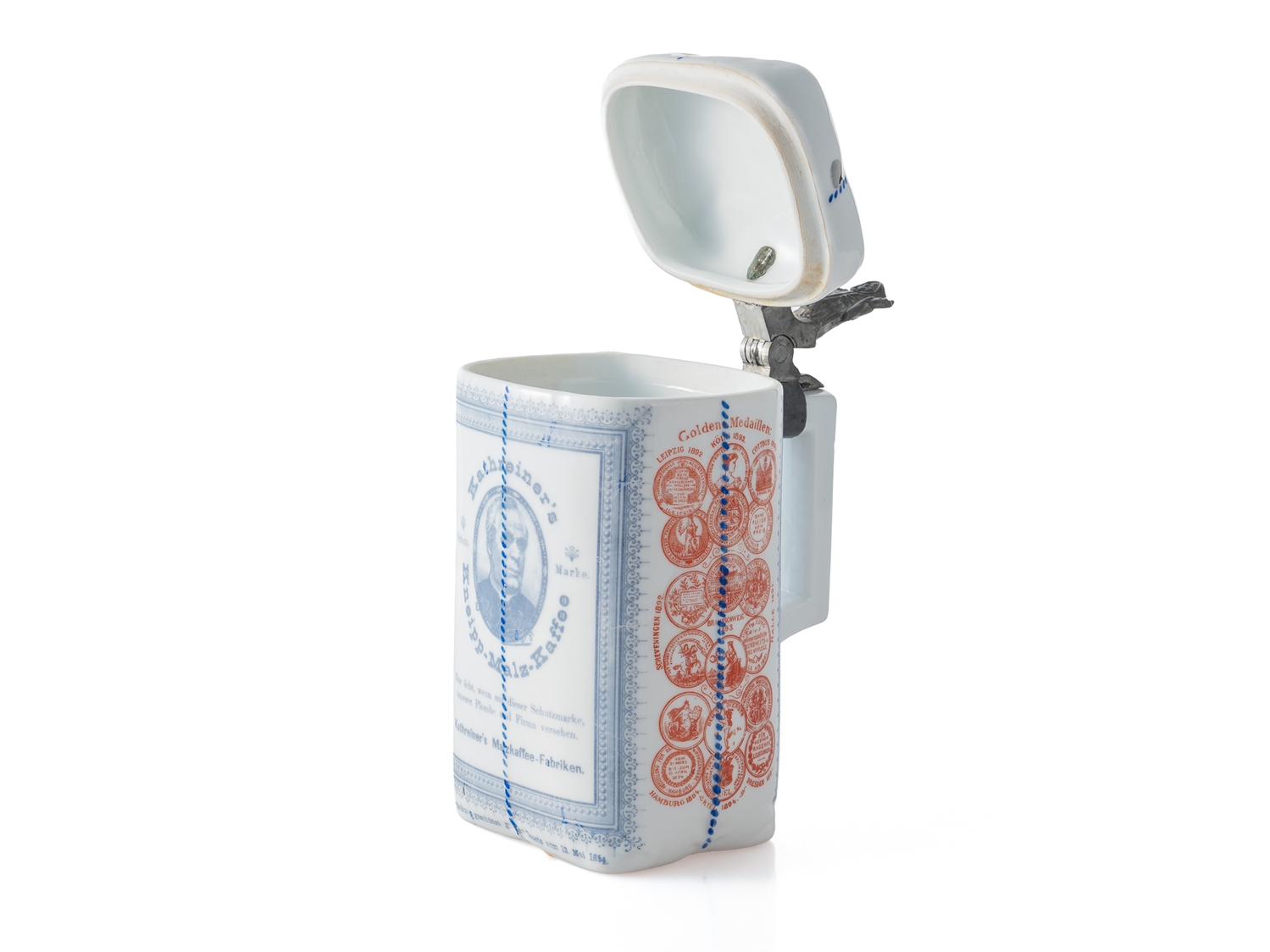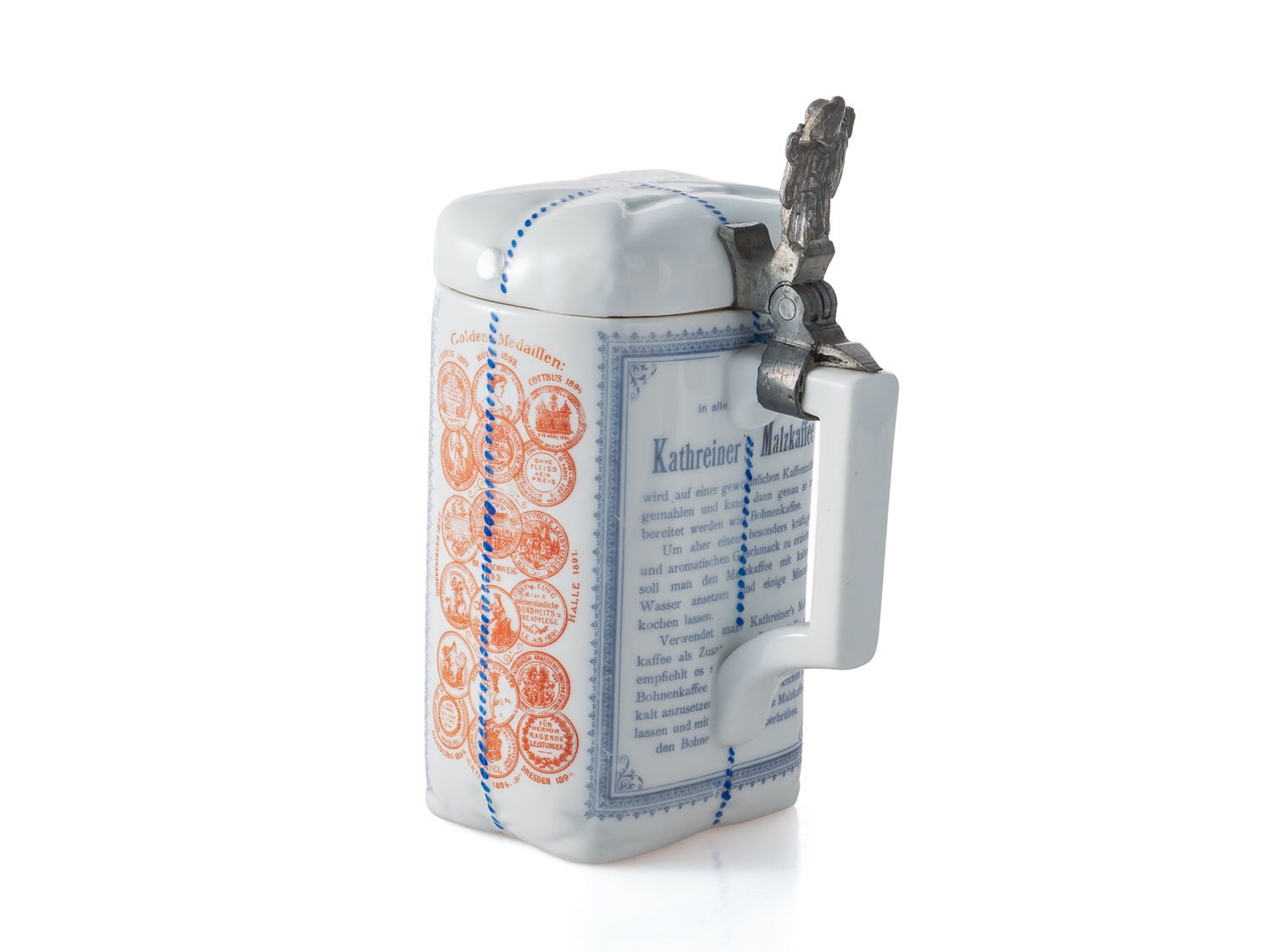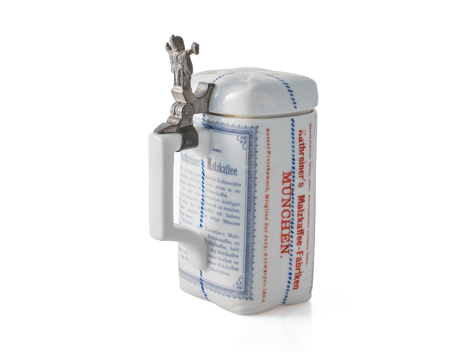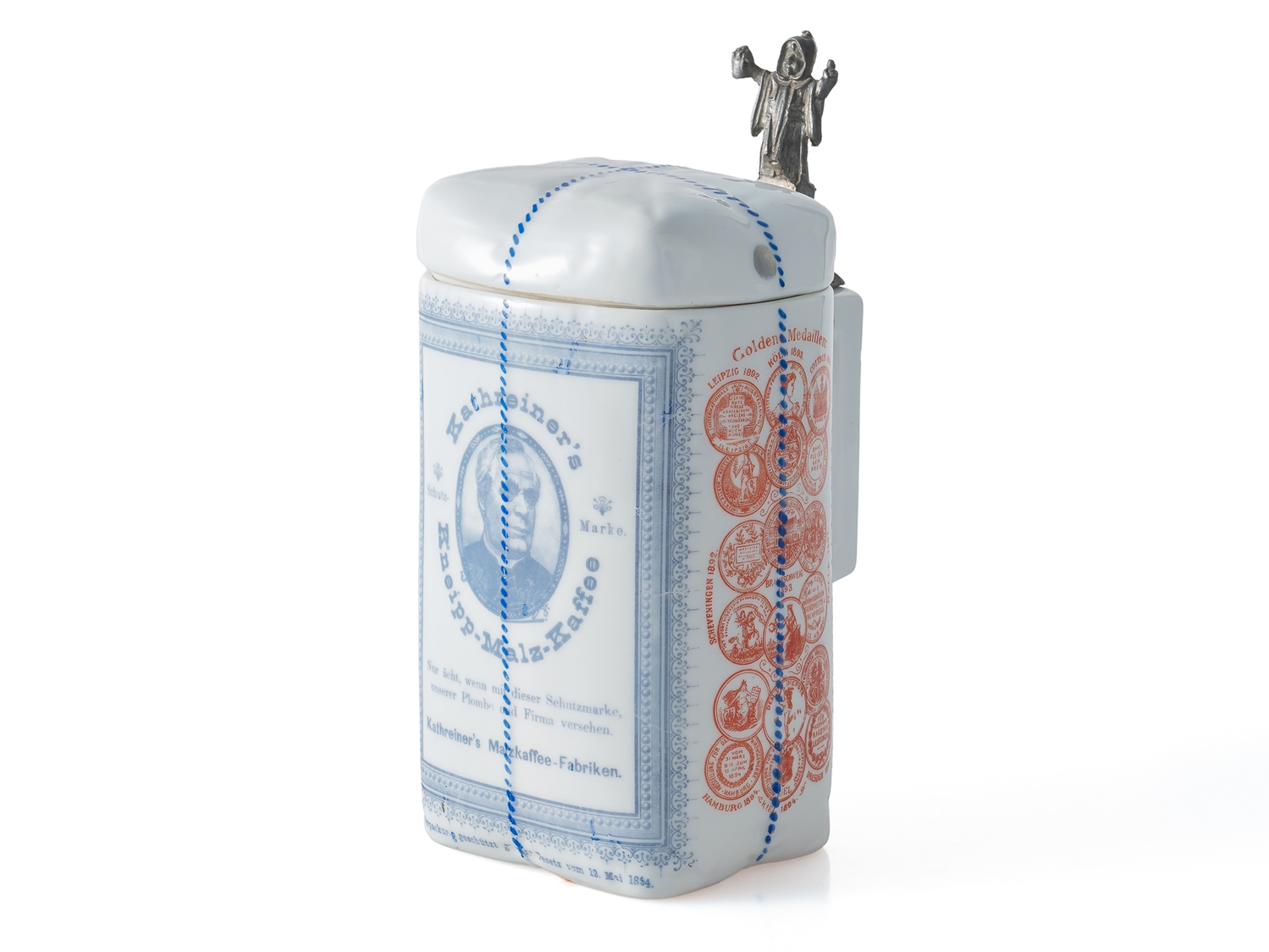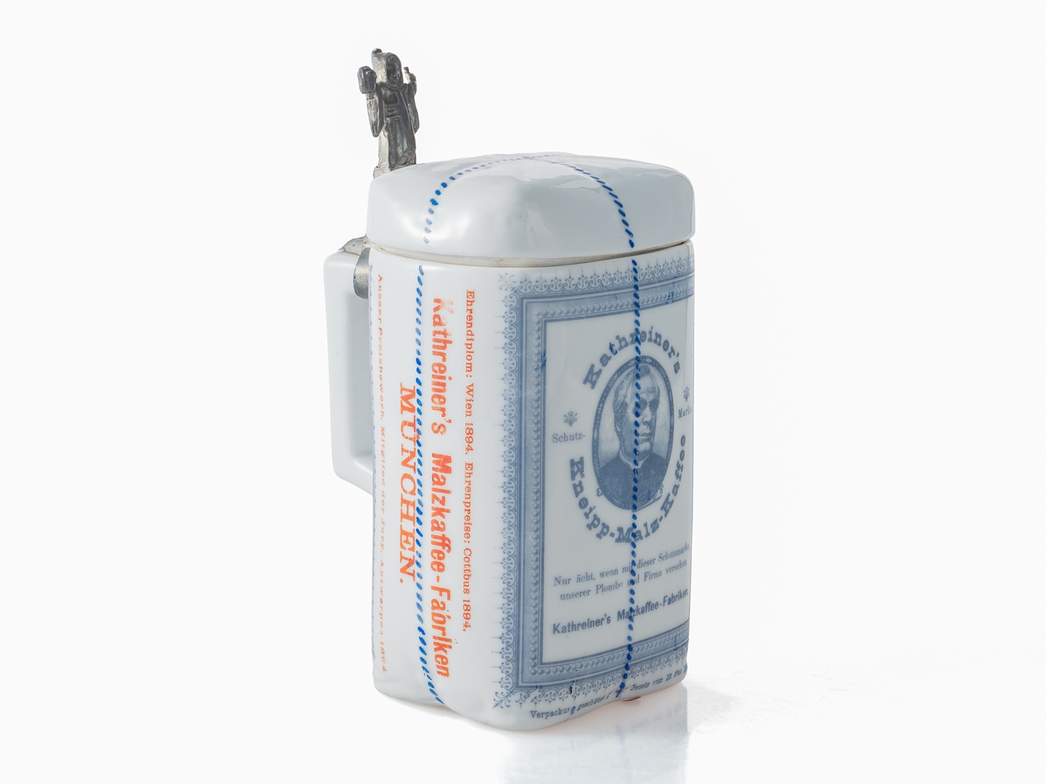Seltener Krug in Form einer originalen Kathreiner’s Kaffee-Ersatz-Packung, um 1910. Porzellan in detailreicher Ausführung, mit blauem Firmenaufdruck sowie roten Medaillendekoren in kräftigen Farben. Die Daumenrast bekrönt von einer vollplastischen Münchner Kindl Figur. In dieser nahezu makellosen Erhaltung äußerst selten. Höhe: ca. 19 cm. Keine Restaurierungen oder sonstige Verschönerungen. In unseren Auktionen erwerben Sie garantiert nur alte Originale.