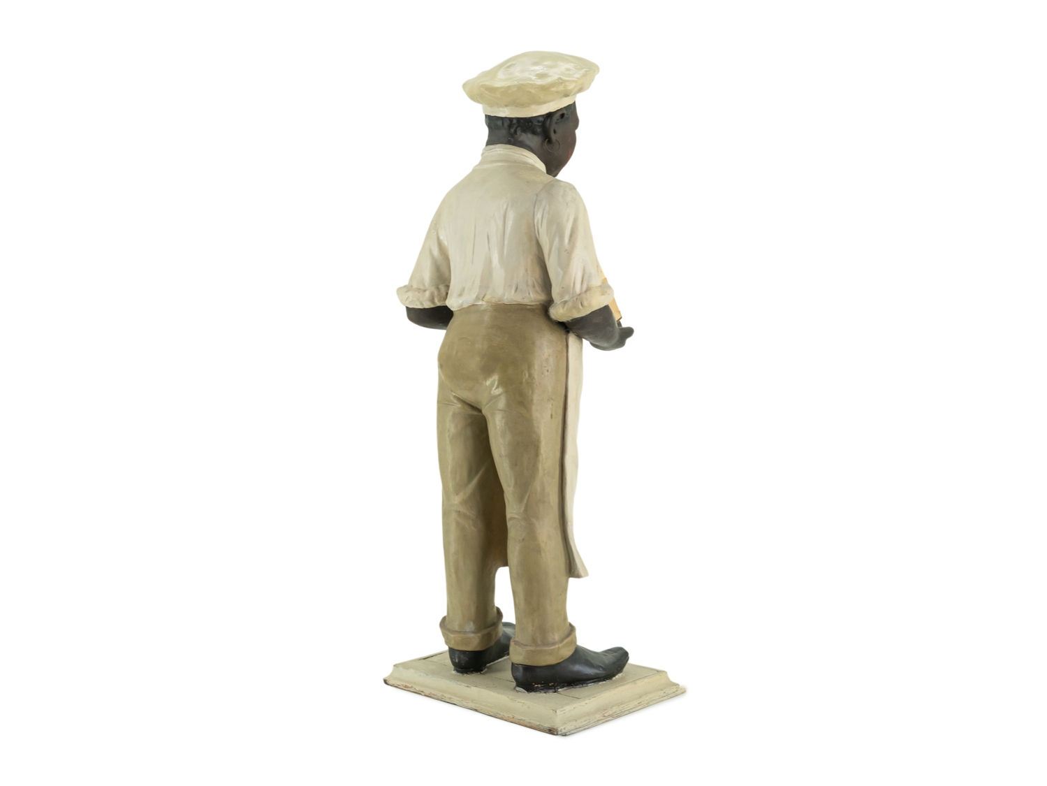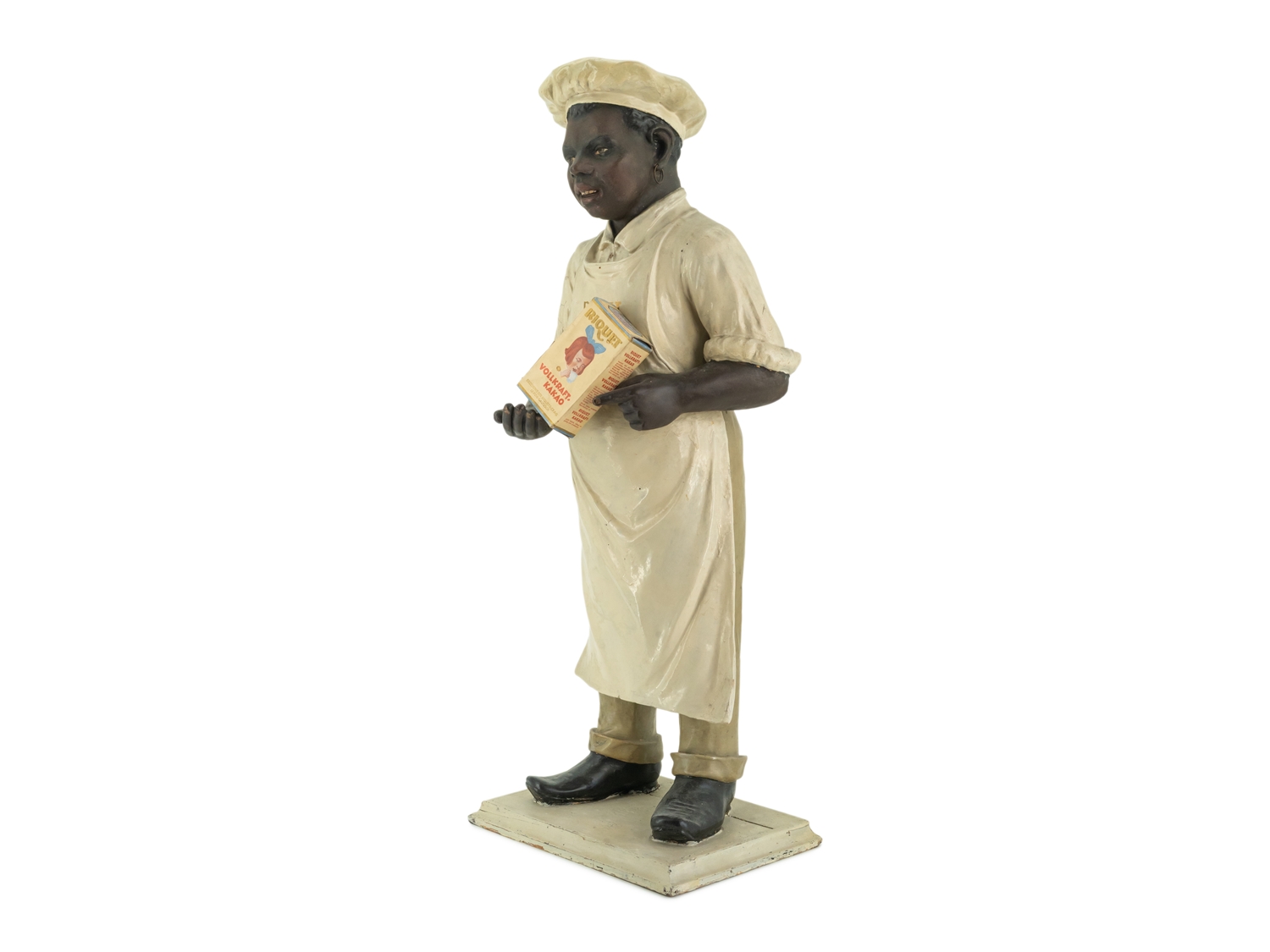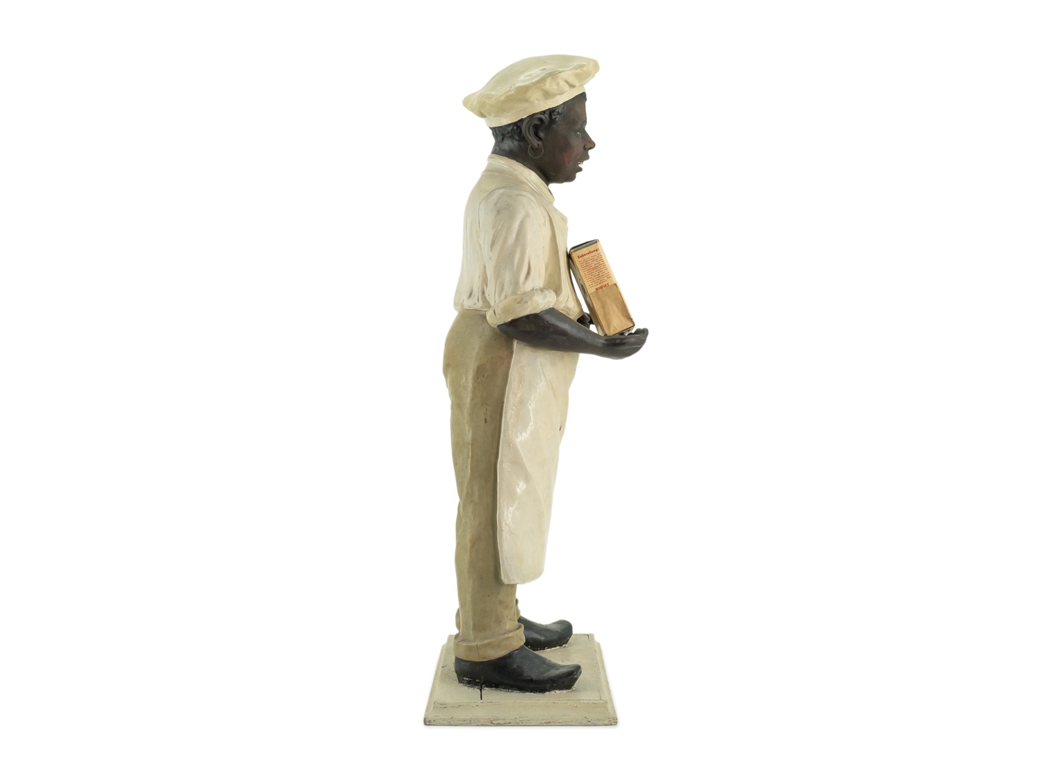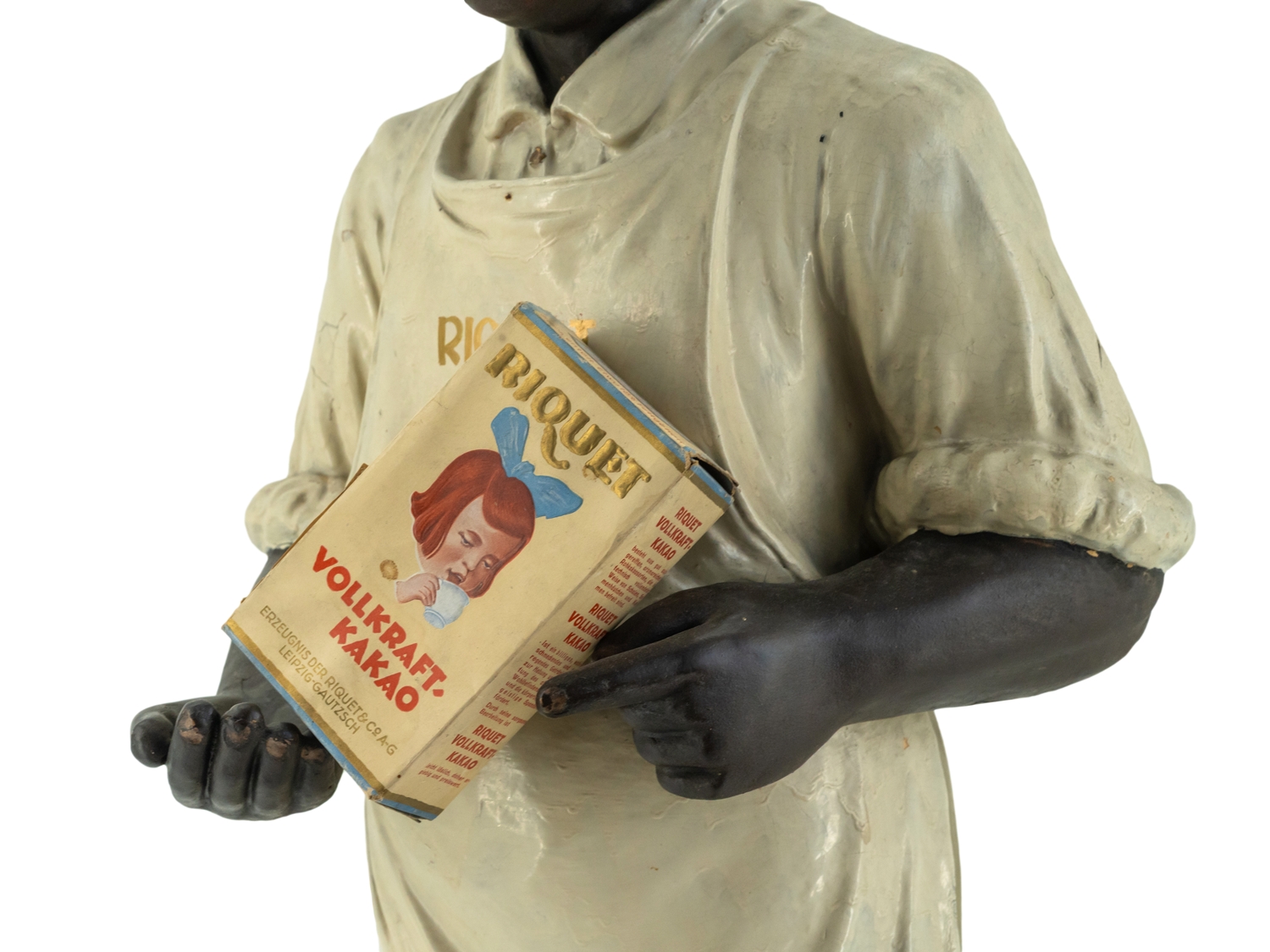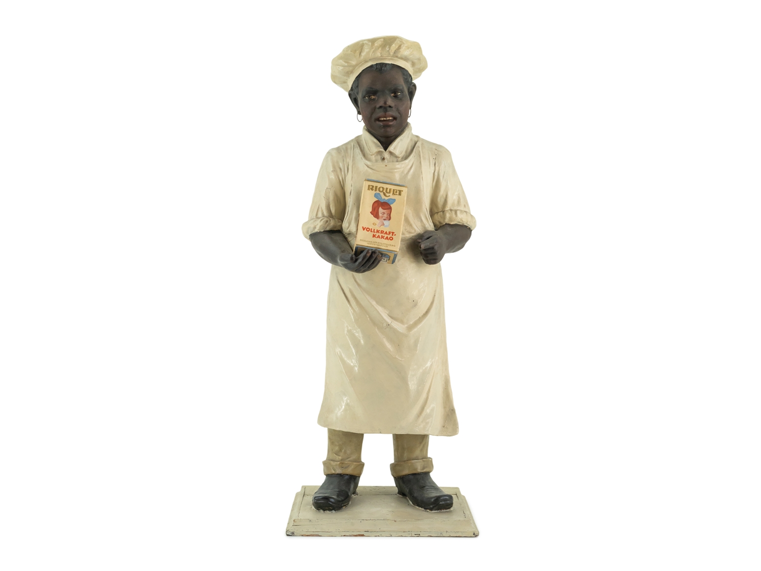 Ausgefallene Werbefigur der Firma Riquet in vollplastischer Ausformung. Material Pappmachè, mit originalem Verpackungskarton in den Händen. Sehr schöner Erhaltungszustand. Höhe: ca. 80 cm, nichts geschönt oder restauriert, Zustand 1! In unseren Auktionen erwerben Sie garantiert nur alte Originale.