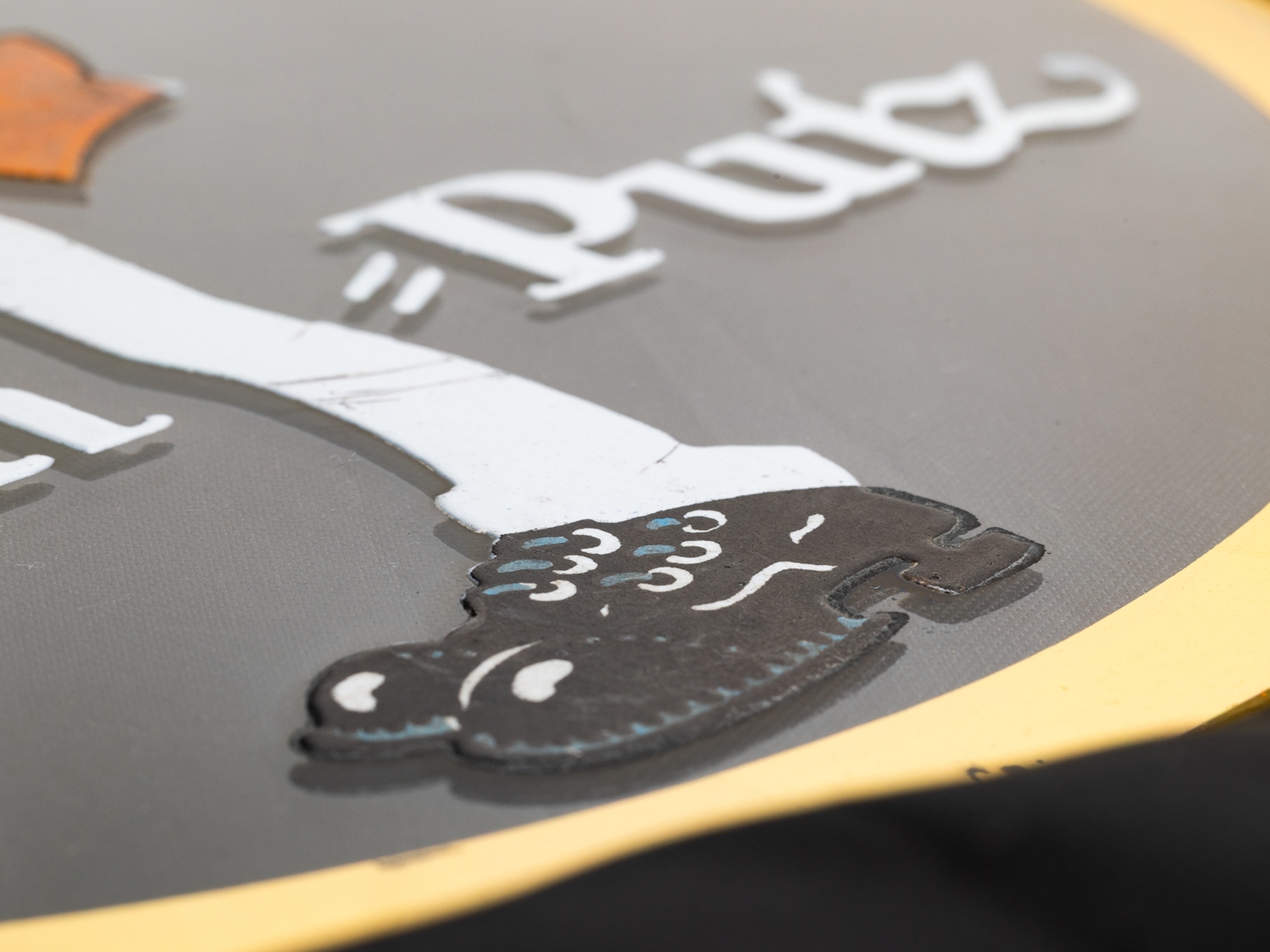 Glasschild Nuos Schuhputz, flach mit Goldrand-Motiv und emaillierter Schrift. Wunderbare Darstellung, die vermutlich aus dem Atelier Leroi stammt. Hierbei handelt es sich um das einzig uns bekannte Exemplar. Durchmesser: ca. 25 cm. Nichts restauriert oder geschönt, sehr schöner Zustand, keine Schäden oder Chips. Goldrand partiell berieben, daher Zustand 1- ! In unseren Auktionen erwerben Sie garantiert nur alte Originale.
