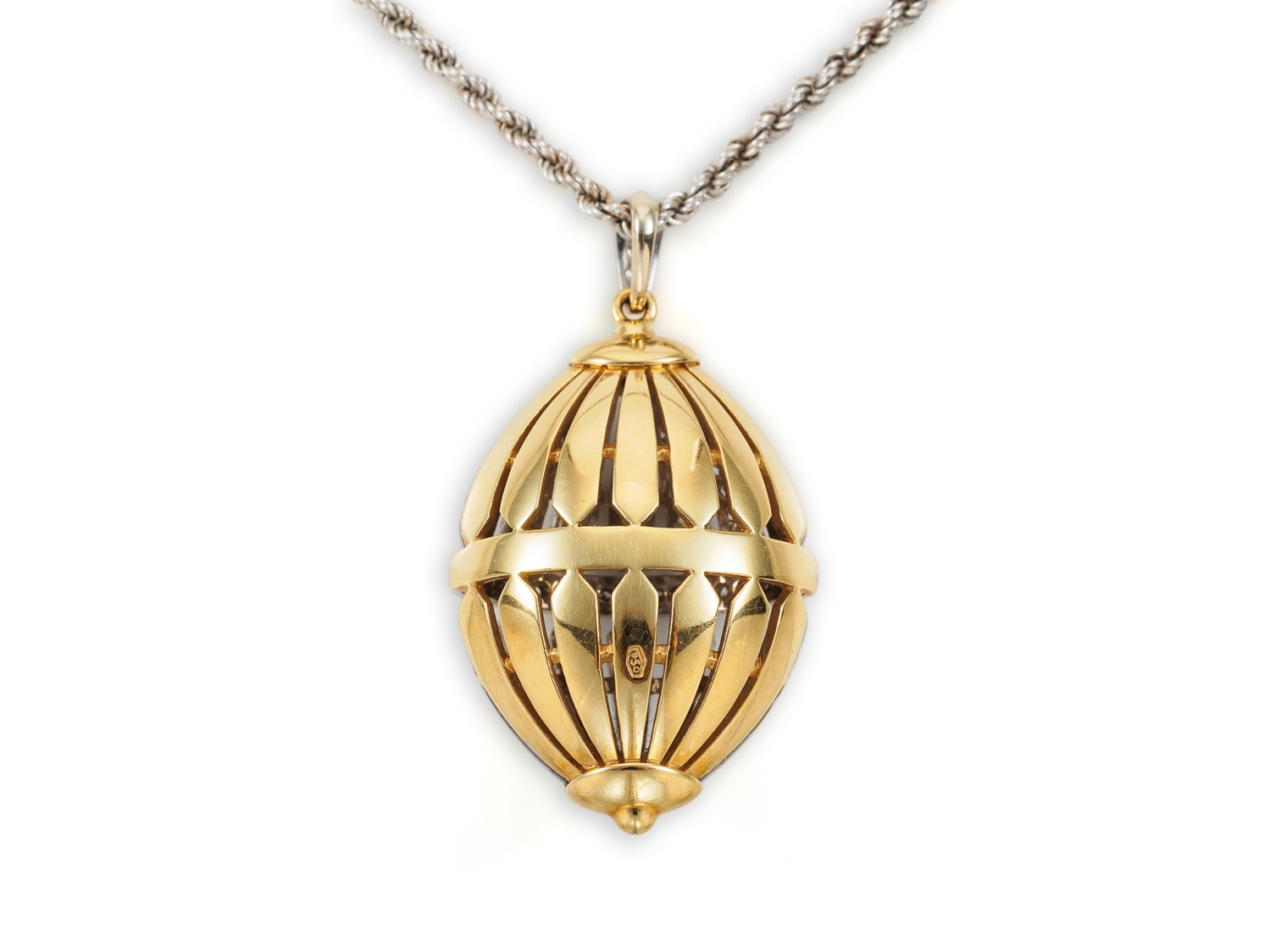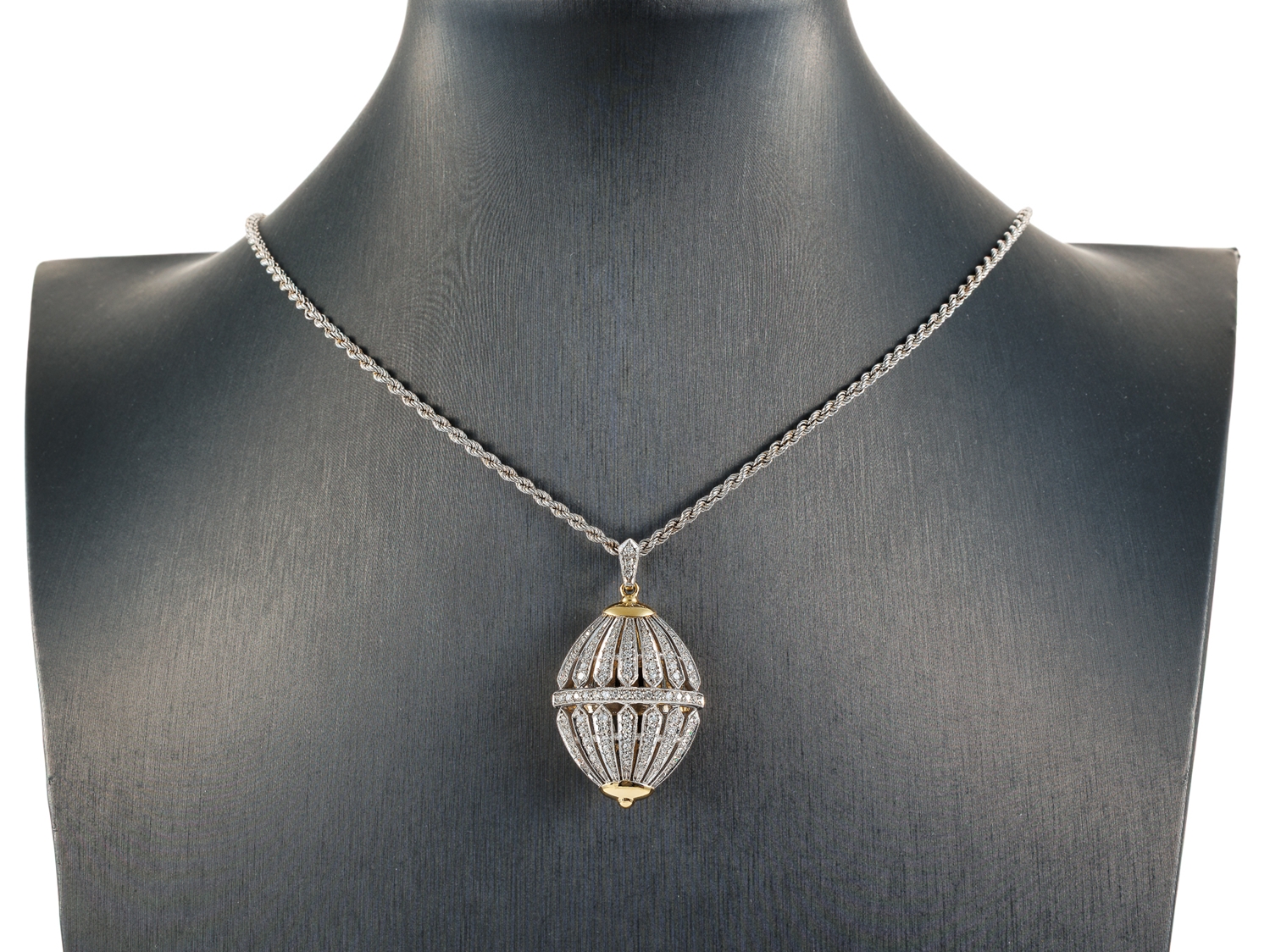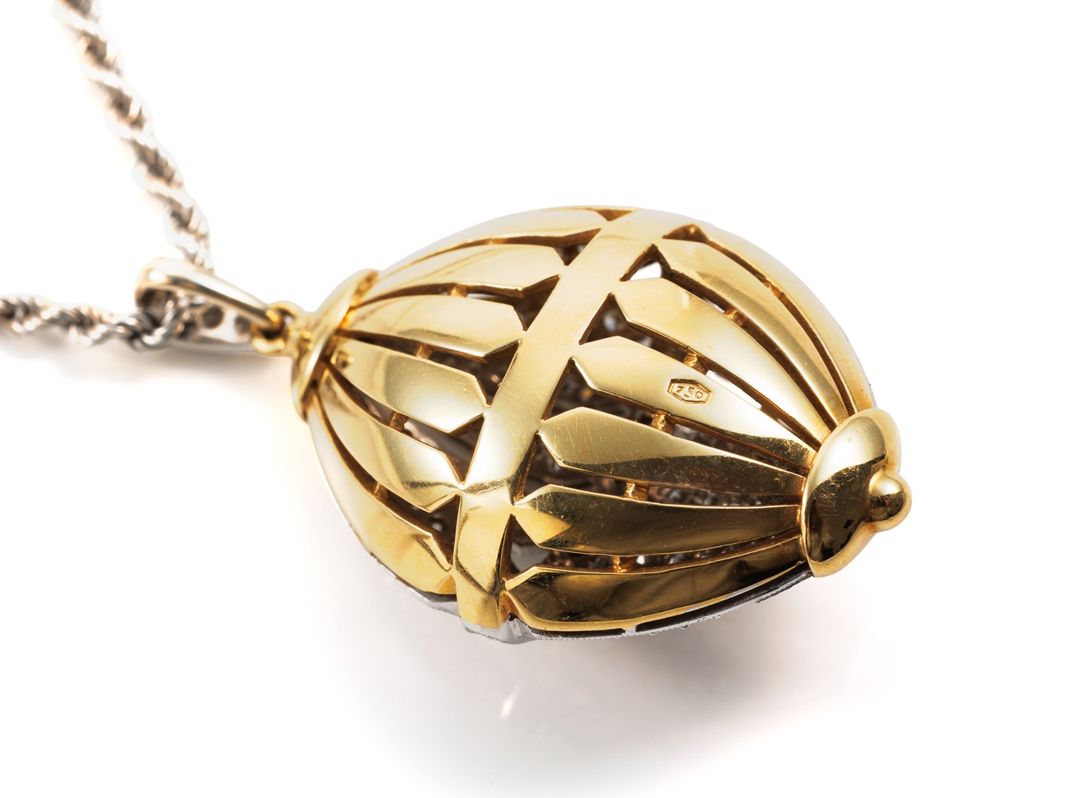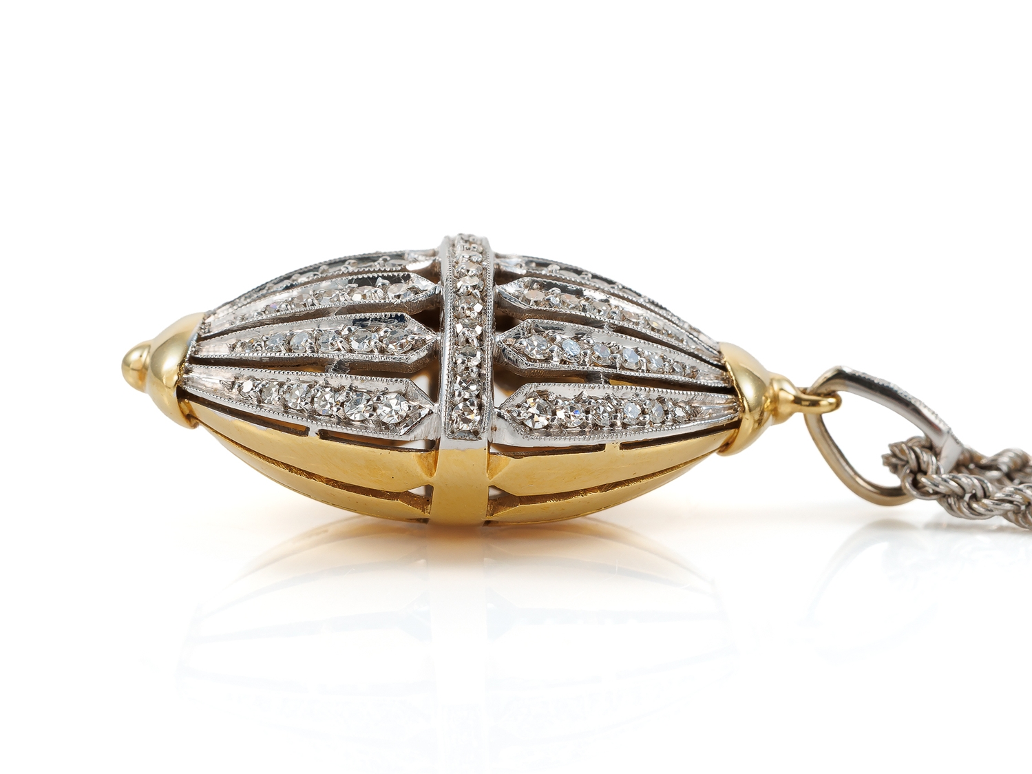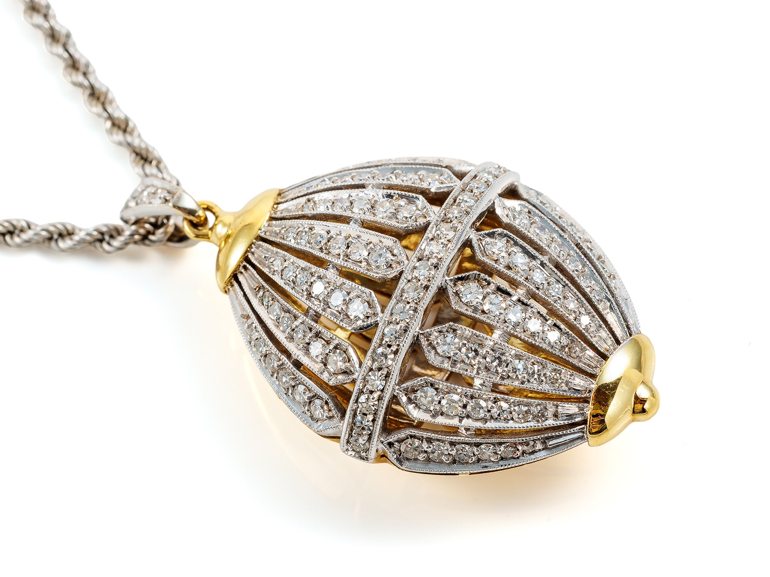Hochfeiner Anhänger aus Gelbgold und Weißgold, punziert 750, besetzt mit 104 Diamanten im Achtkantschliff (lt. Zertifikat 0,97 Carat, Top Wesselton G, vvsi). Am Anhänger, nicht abnehmbar, eine 51 cm lange Kordelkette, Stärke 2,3 mm, aus 750 Weißgold. Gepflegter Zustand, Format Anhänger mit Öse 41 x 23 x 13,7 mm, Gewicht zusammen 24,26 Gramm. Zertifikat und Rechnung vom 01.06.1992 über DM 8570,00 anbei.