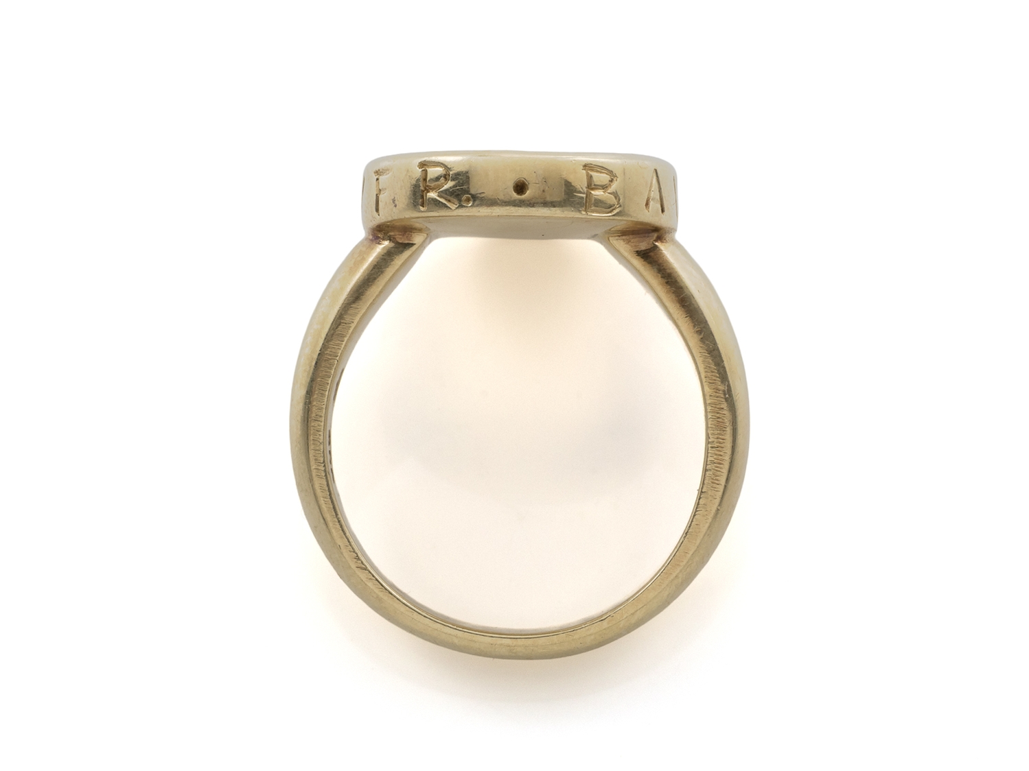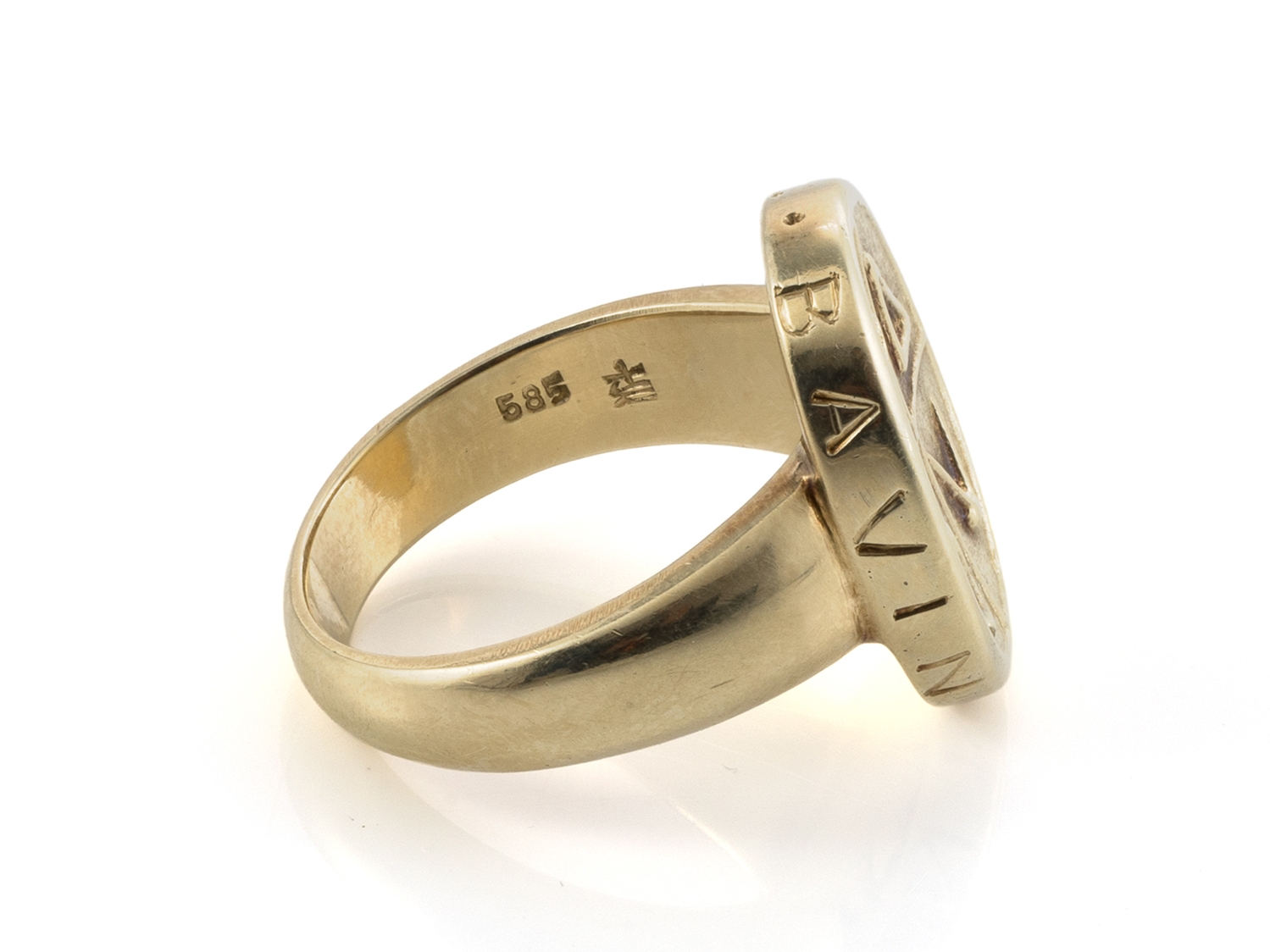 Schwerer Freimaurer-Goldring, punziert 585, mit ovalem Ringkopf, umlaufend beschrieben "B A V I N N V N G V F R". Auf der Fläche eingearbeitet die Symbole Winkelmaß, Hammer, Zirkel und Kelle. Ringgröße: 20/60. Gewicht: ca. 19,98 Gramm. Lediglich leichte Tragespuren.