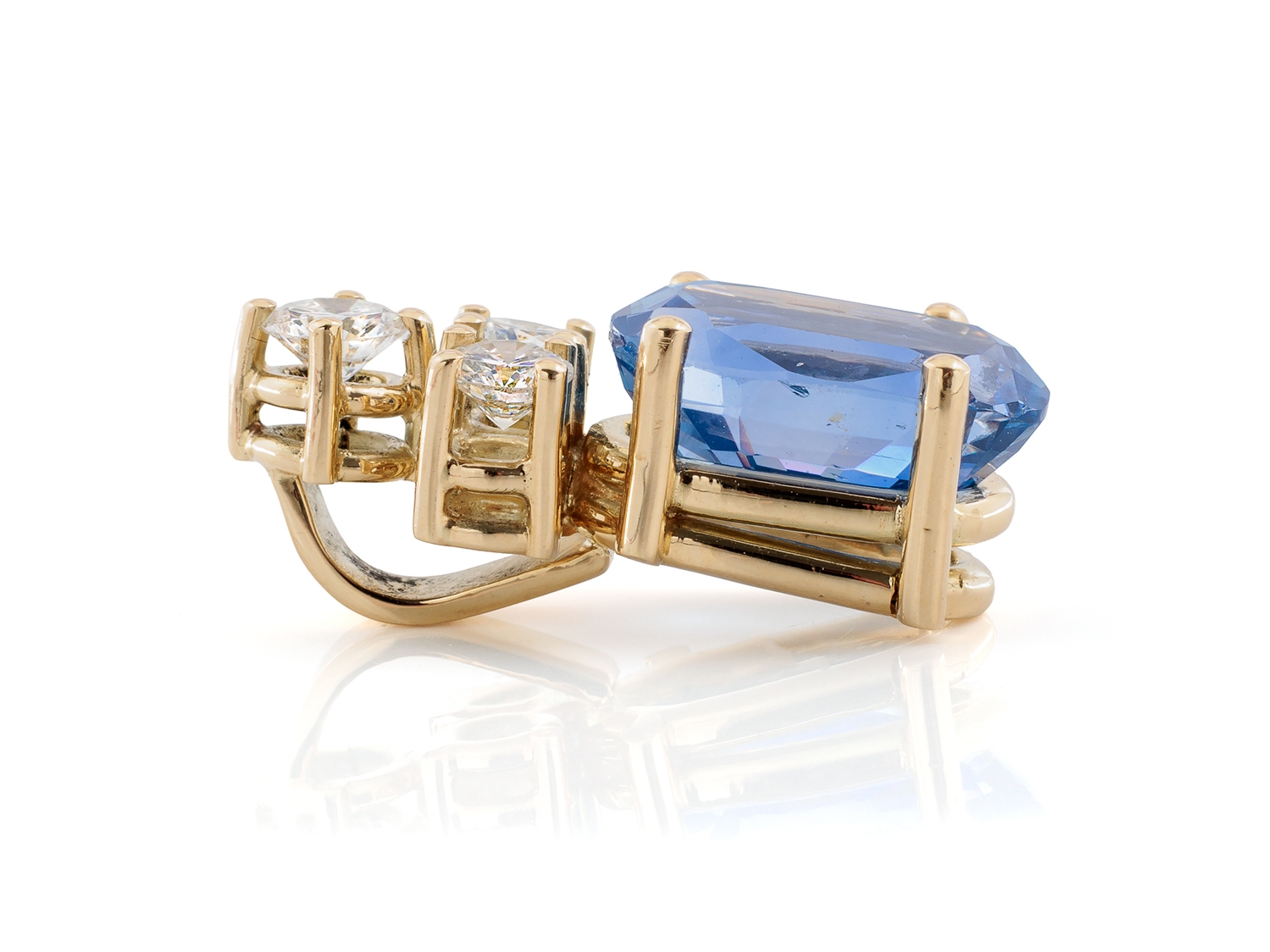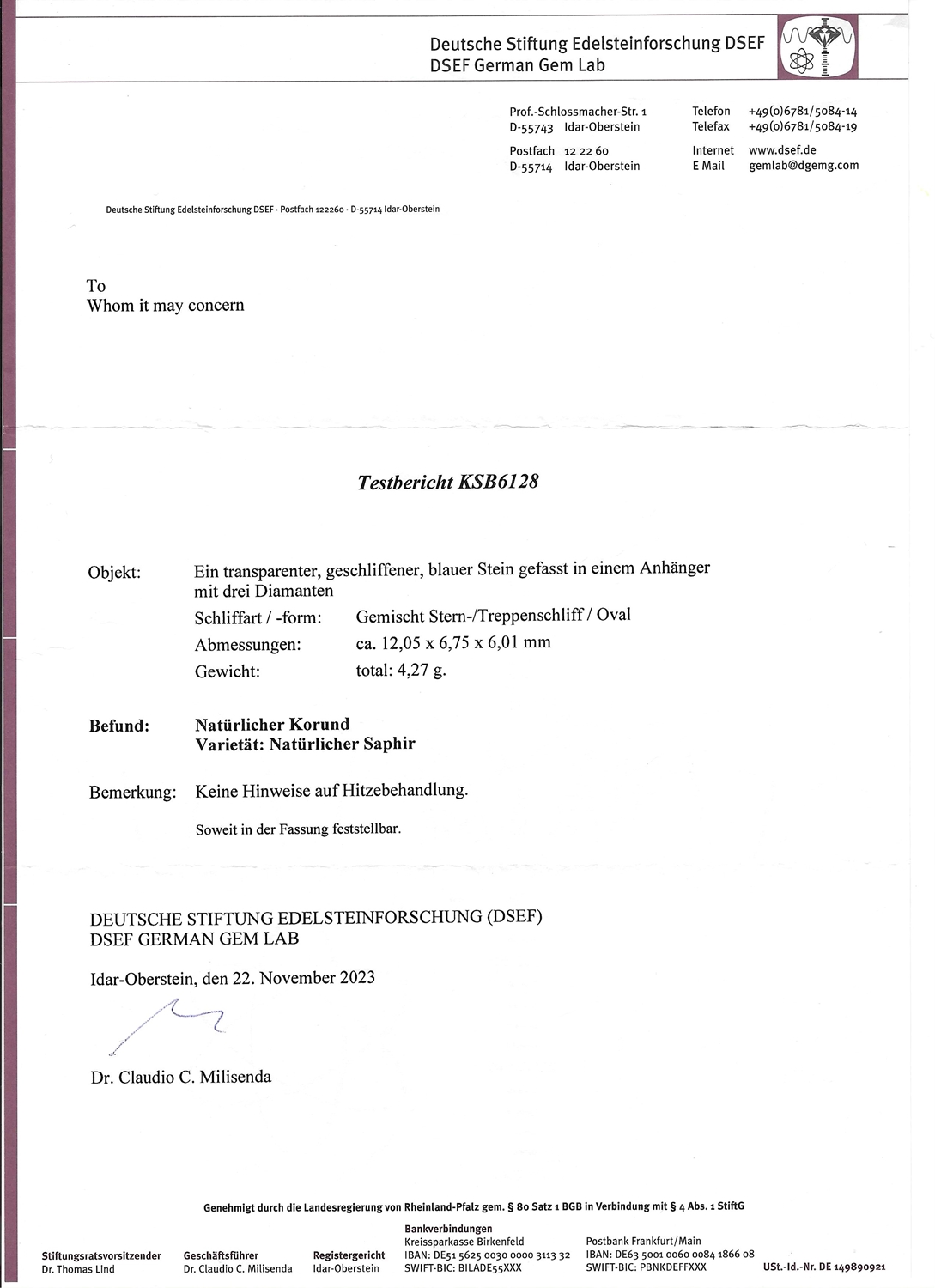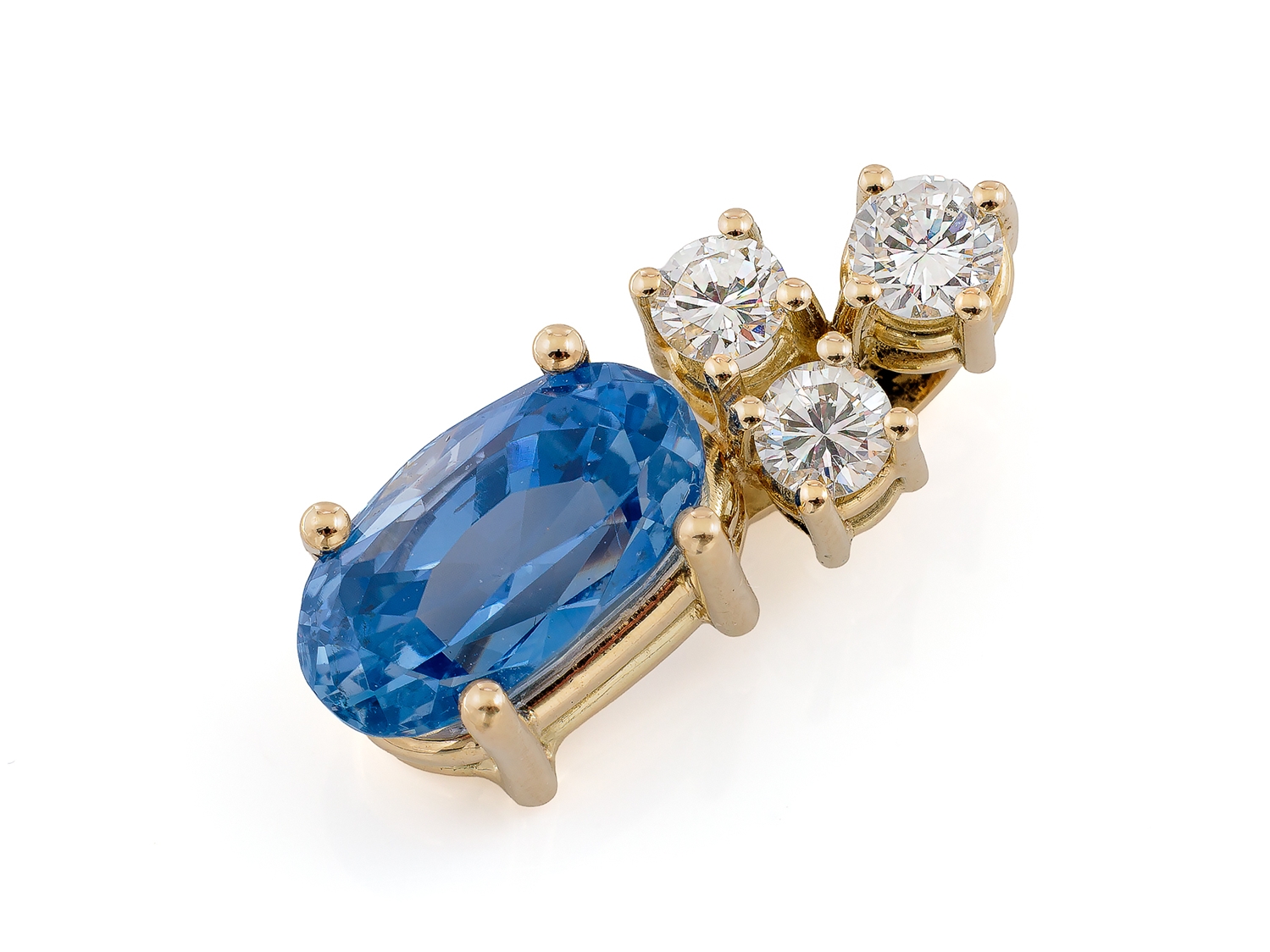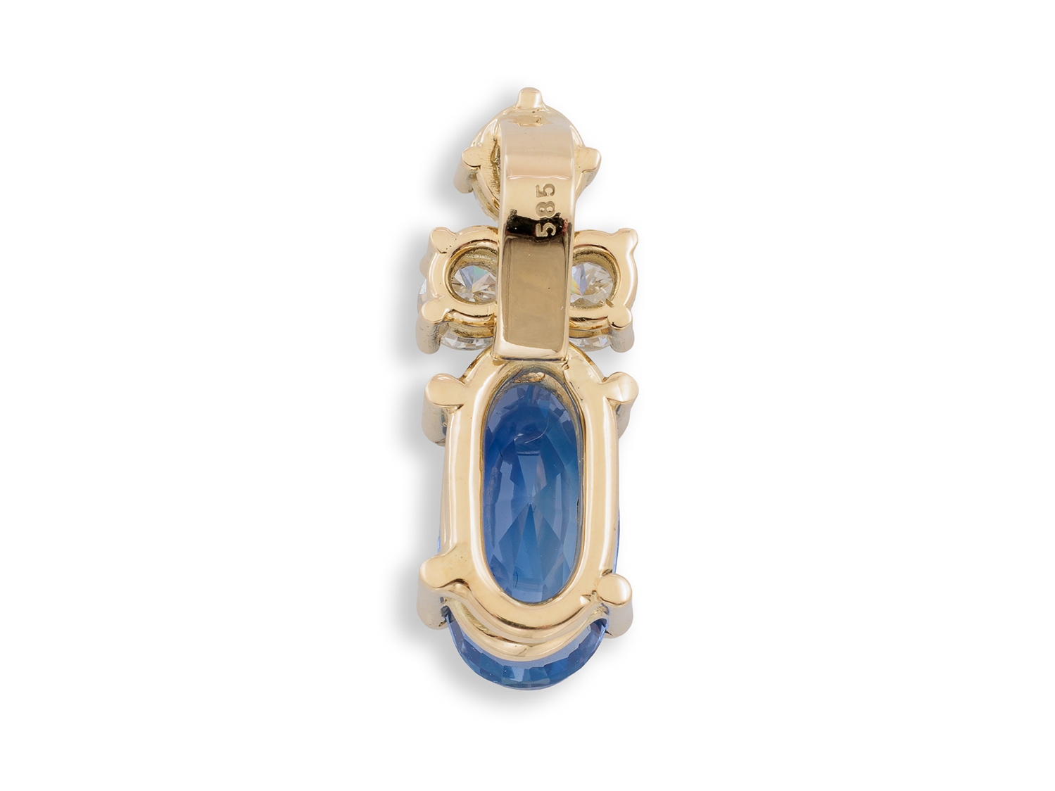 Handgearbeiteter Anhänger aus Gelbgold, punziert 585. Im Anhänger gefasst ein ovaler, facettierter Saphir (12,05 x 6,75 x 6,01mm ) von 4,663 Carat sowie in mittlerer Farb- und mittlerer bis hoher Reinheit 1 Brillant 0,224 Carat und zwei Brillanten von zusammen 0,35 Carat. Sehr guter, neuwertiger Zustand, Format 22,2 x 8,2 mm, Gewicht 4,27 Gramm. Deutsche Stiftung Edelsteinforschung DSEF Testbericht KSB6128 vom 22.11 2023 anbei.