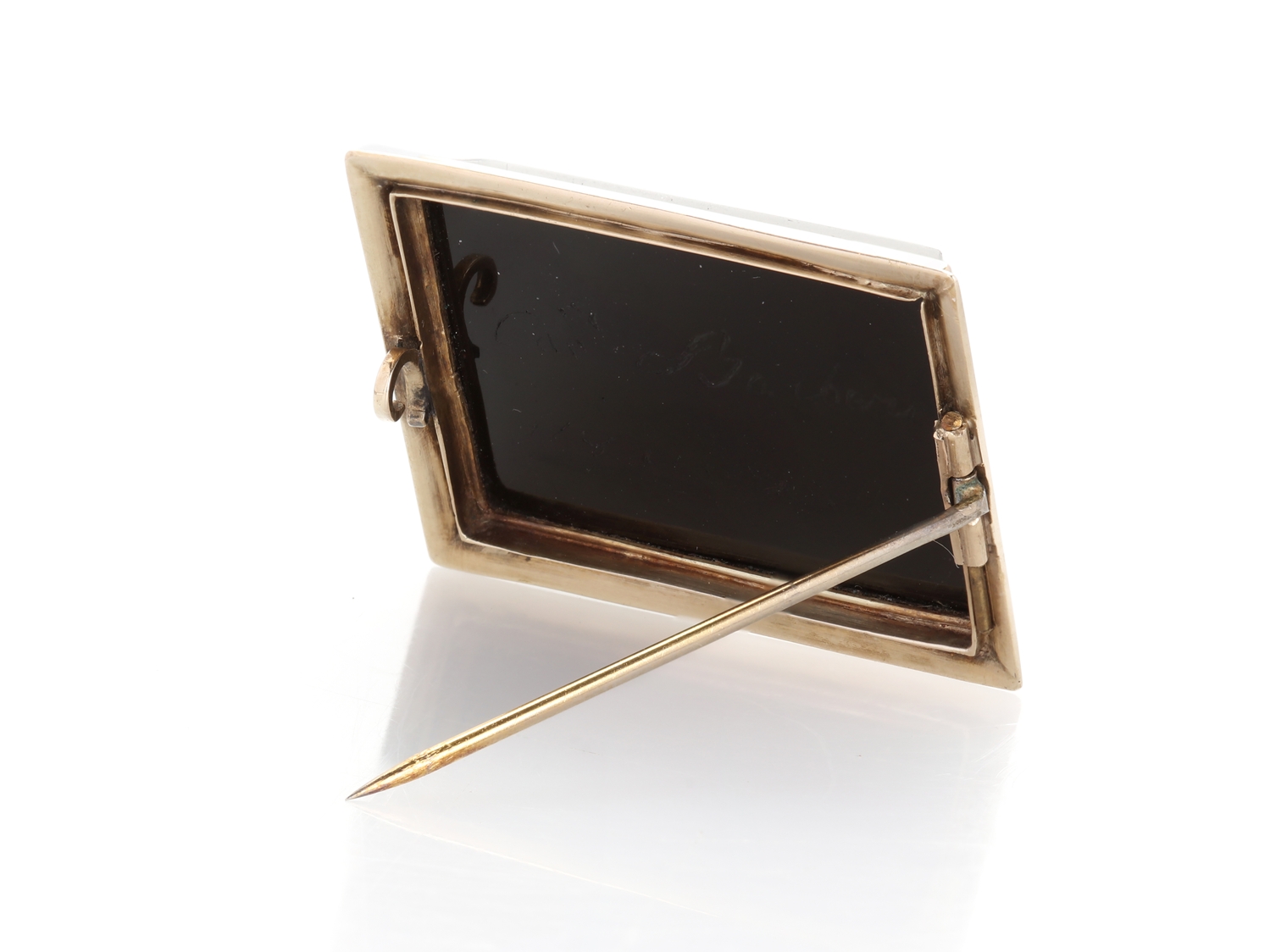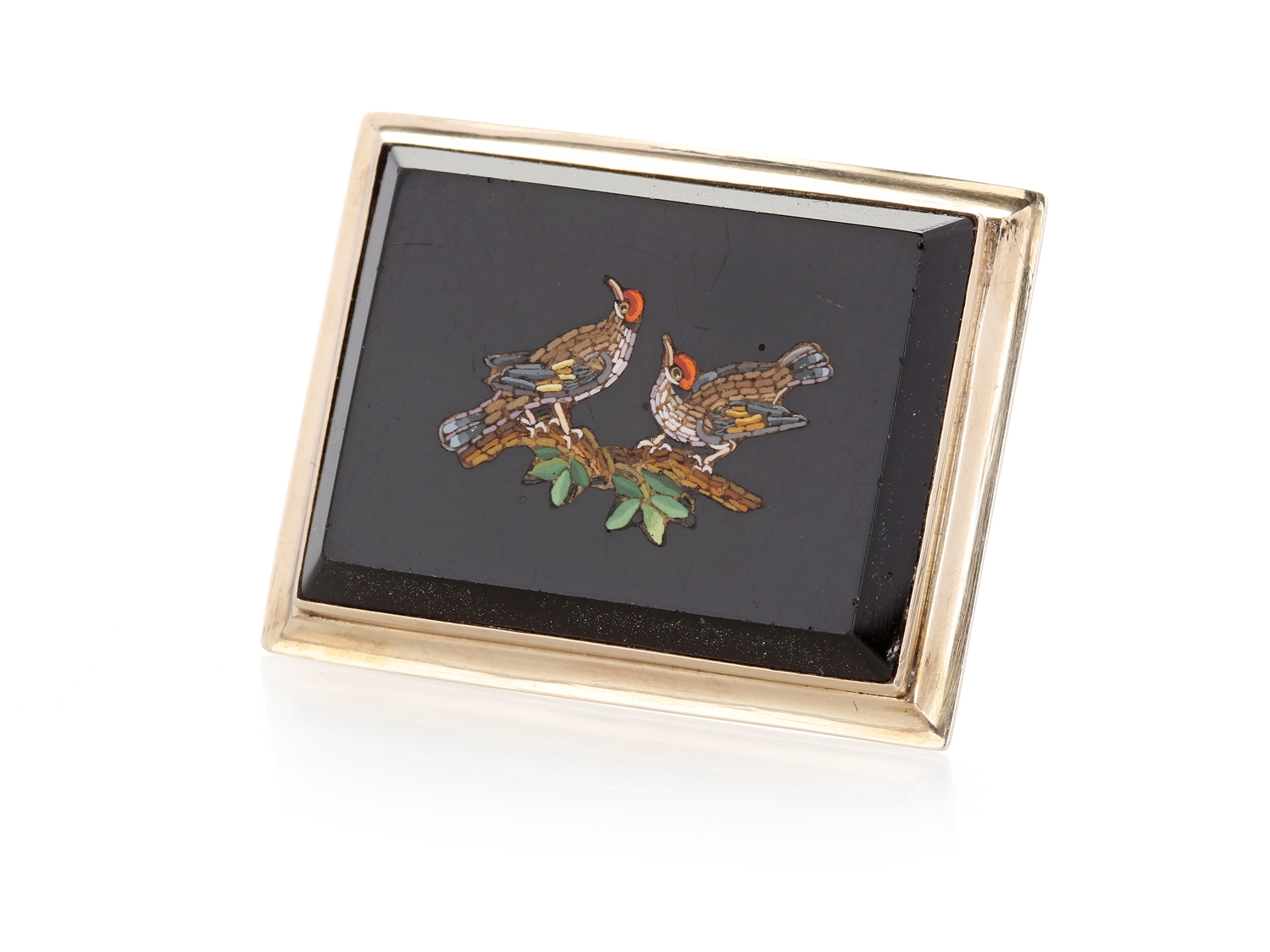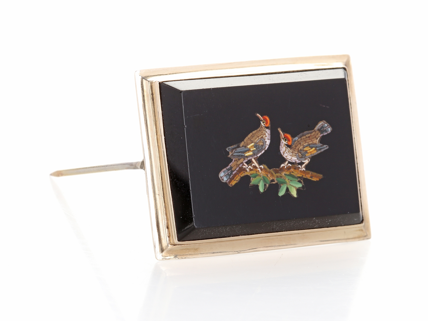 Antike Brosche des 19. Jahrhunderts, aus Gelbgold, nicht punziert, Feingehalt auf 585 geprüft. In der Brosche gefasst ein feines italienisches Mikromosaik eines Vogelpaares auf einem Ast sitzend, rückseitig graviert "Cav Baberu 148 Via Casella". Die Brosche hat einen guten gepflegten Zustand, einfacher Hakenverschluss, das Format 3,4x2,6 cm, das Gewicht beträgt 9,96 Gramm.