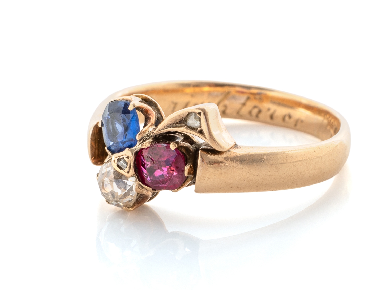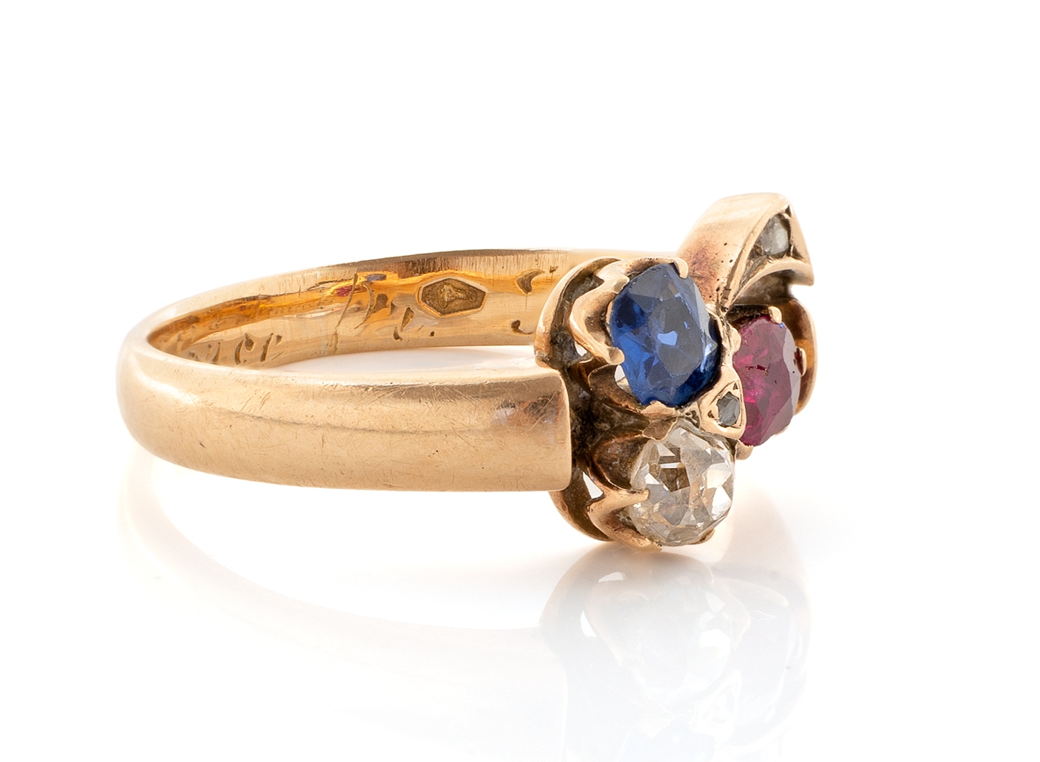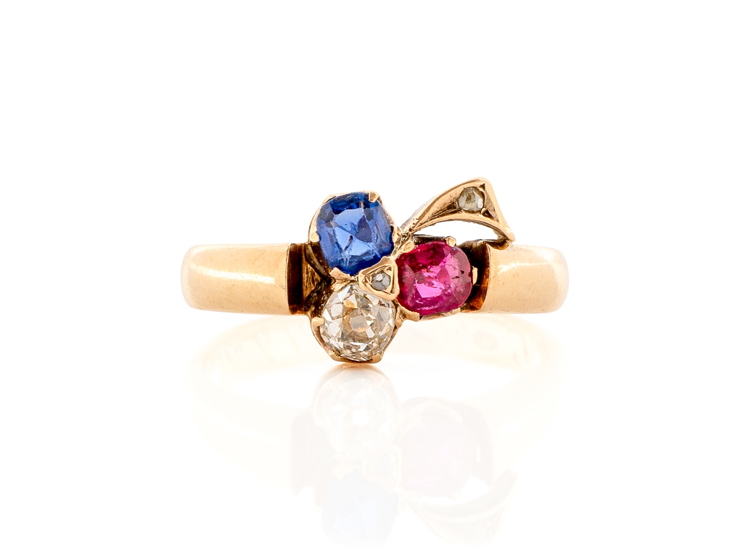 Antiker Rotgold-Ring mit Altschliff-Diamant, Rubin und Saphir, um 1900