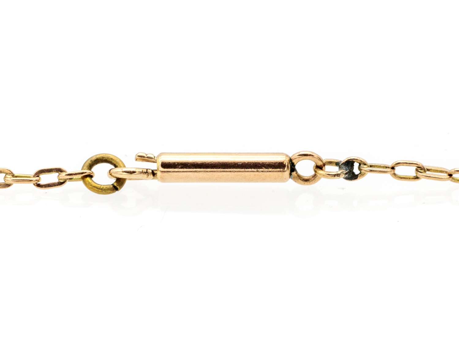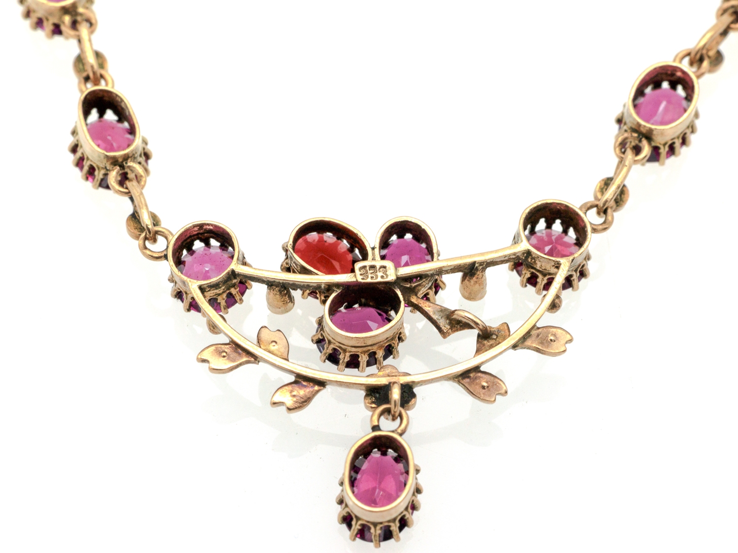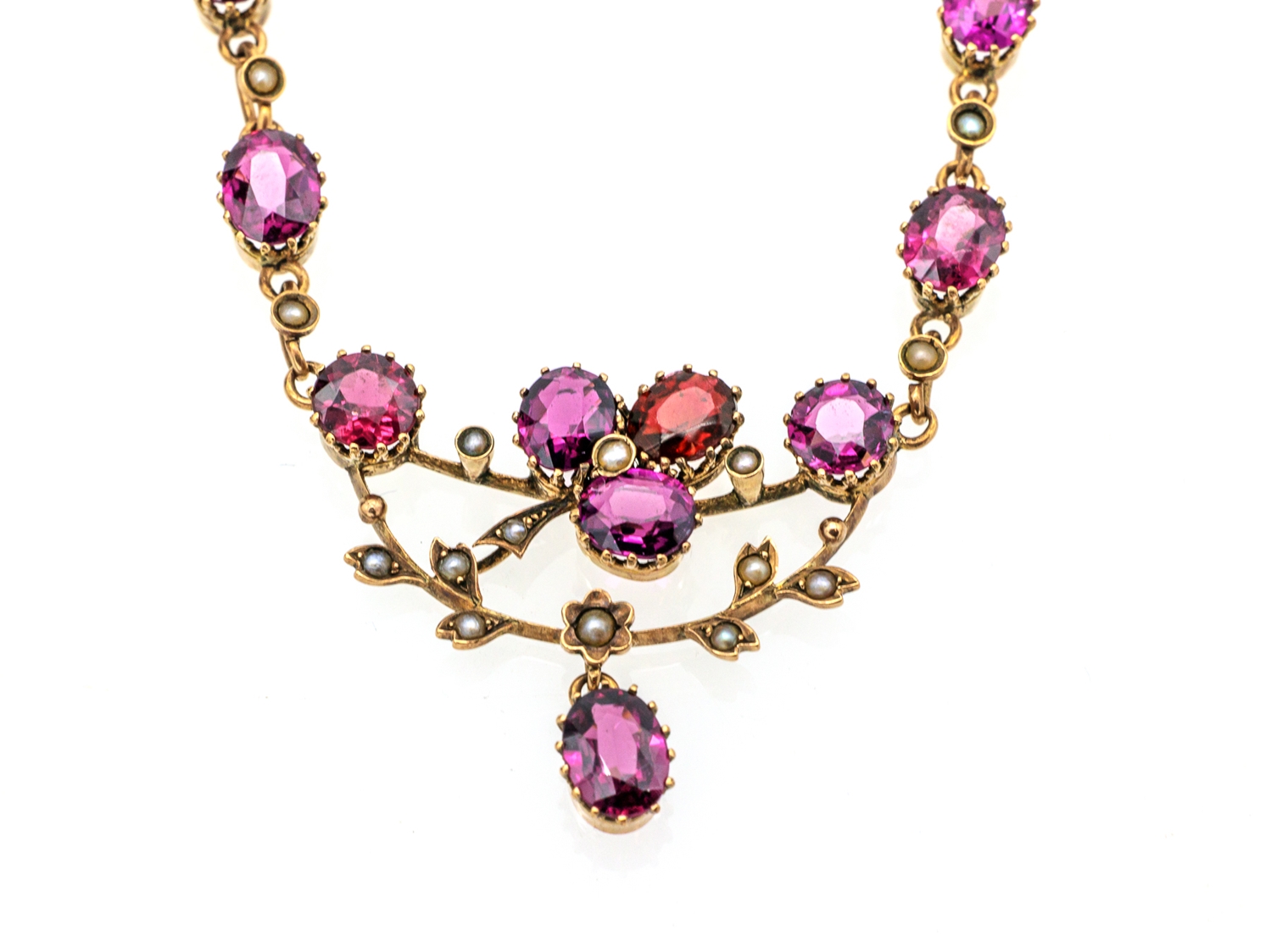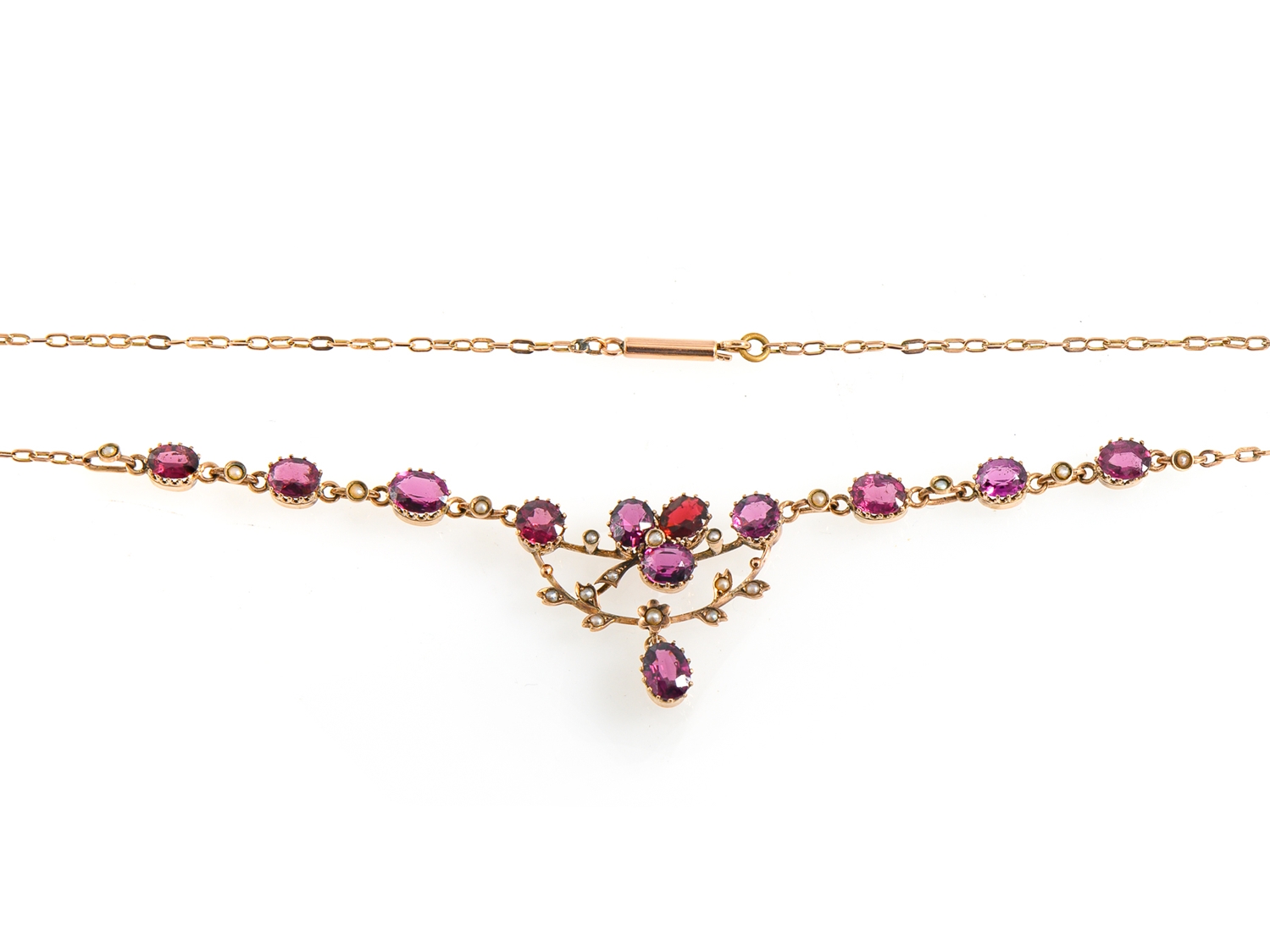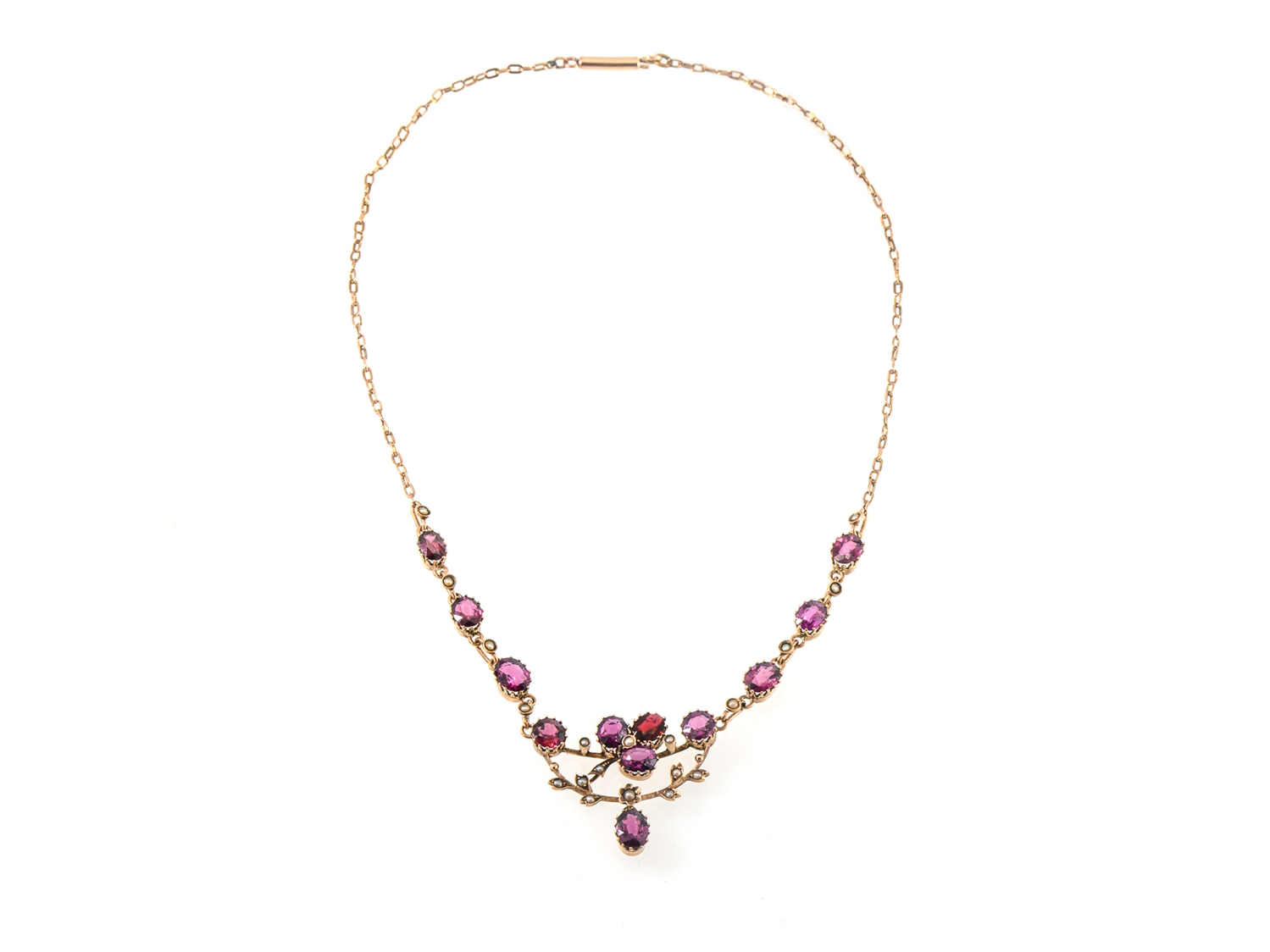 Dekoratives antikes, wohl um 1890/1900 entstandenes Collier aus Rotgold, punziert 333. Im Collier verarbeitet sind 12 Granate (wohl Rhodolith) sowie 19 kleine Saatperlen. Das Collier befindet sich im gebrauchten Zustand, Länge: ca. 39,5 cm, Gewicht: ca. 9.23 Gramm.