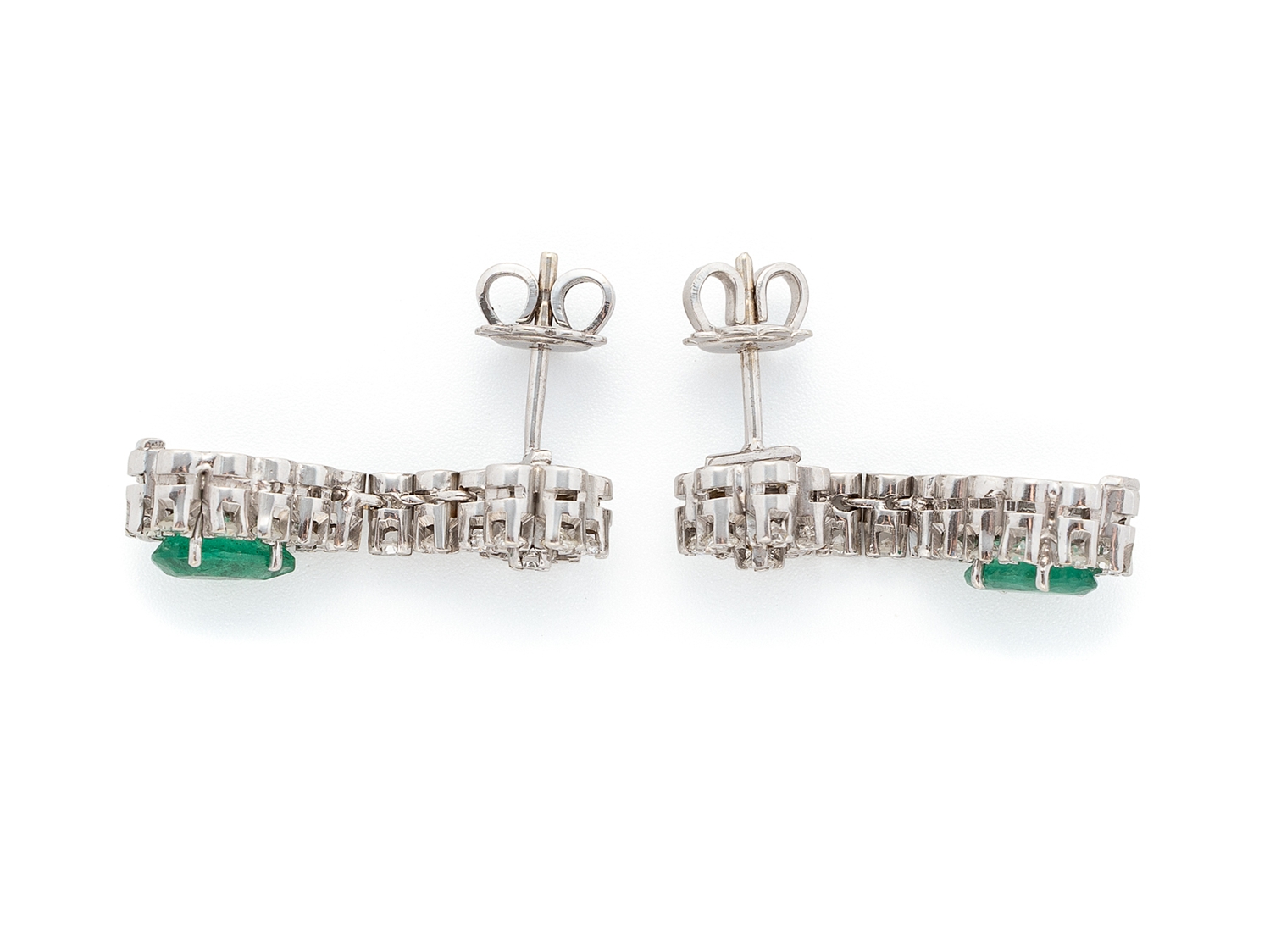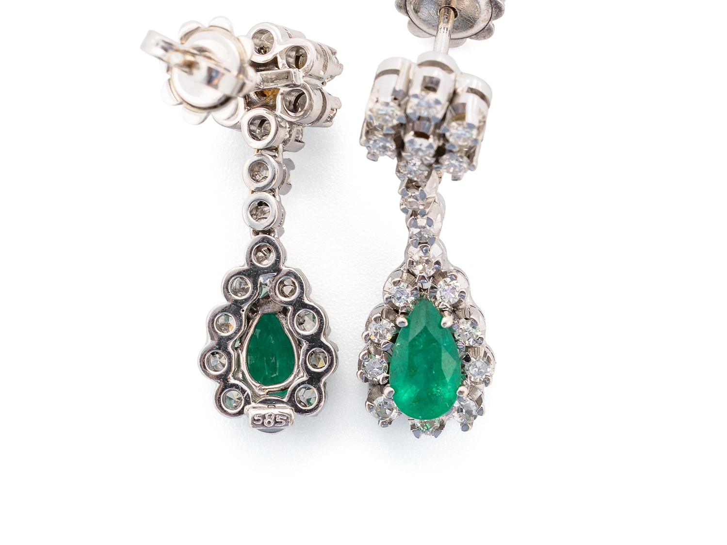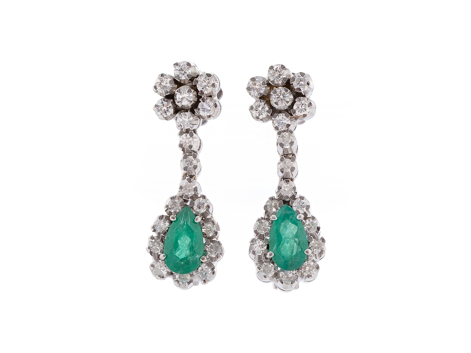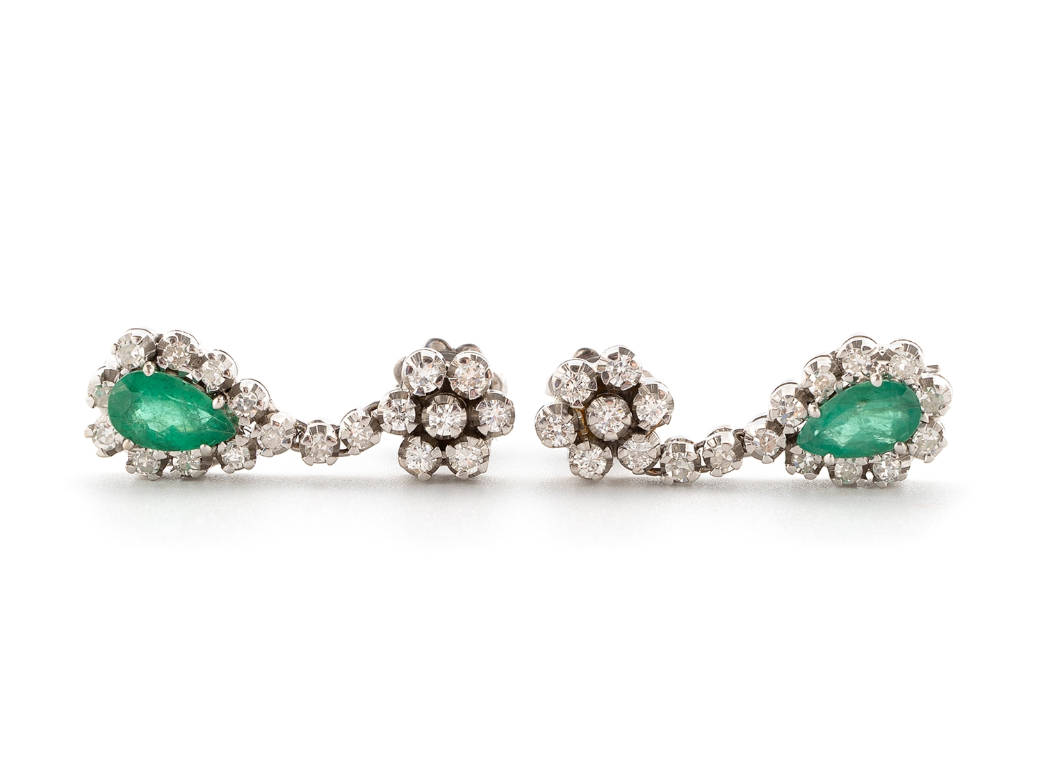 Aparte Ohrstecker, Hänger aus Weißgold, punziert 585. In den Hängern gefasst sind zwei facettierte Smaragde in Tropfenform (ca. 8 x 4,5 mm) von zusammen etwa 1,10 Carat sowie 14 Brillanten und 24 Achtkant-Diamanten (hoher Farb-/hoher bis mittlerer Reinheitsgrad) von zusammen etwa 0,88 Carat. Die Ohrstecker haben einen gepflegten Zustand, das Format 26 x 9 mm, das Gewicht beträgt zusammen 7,53 Gramm.