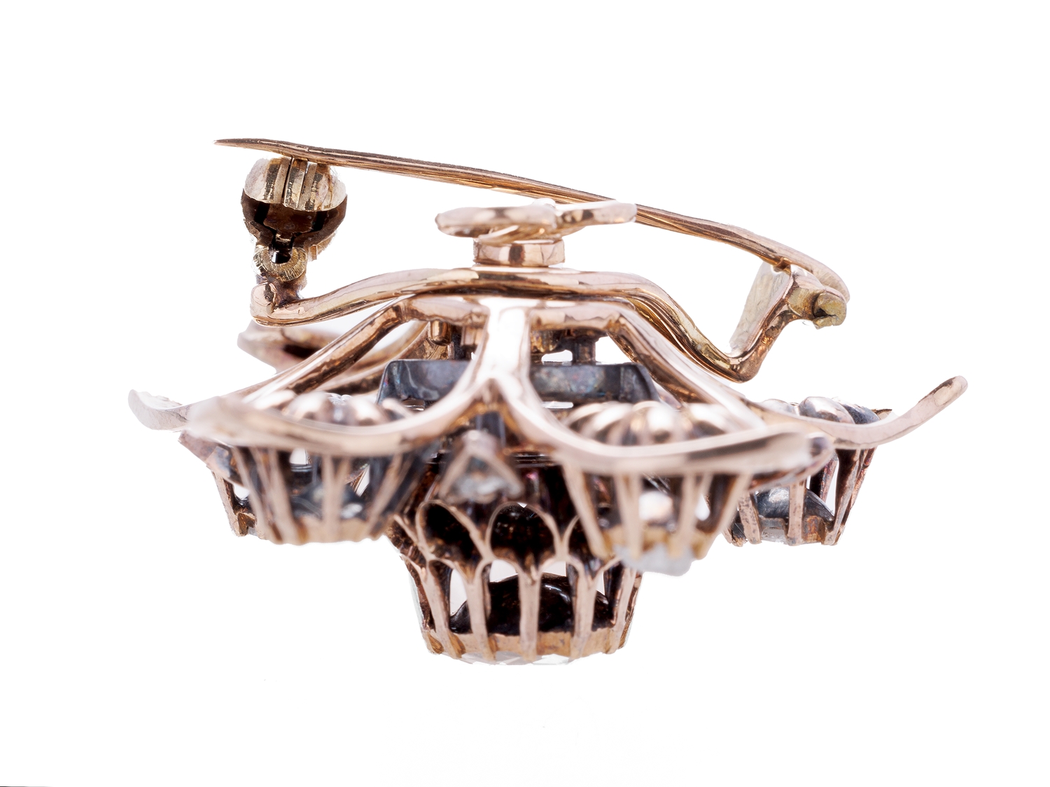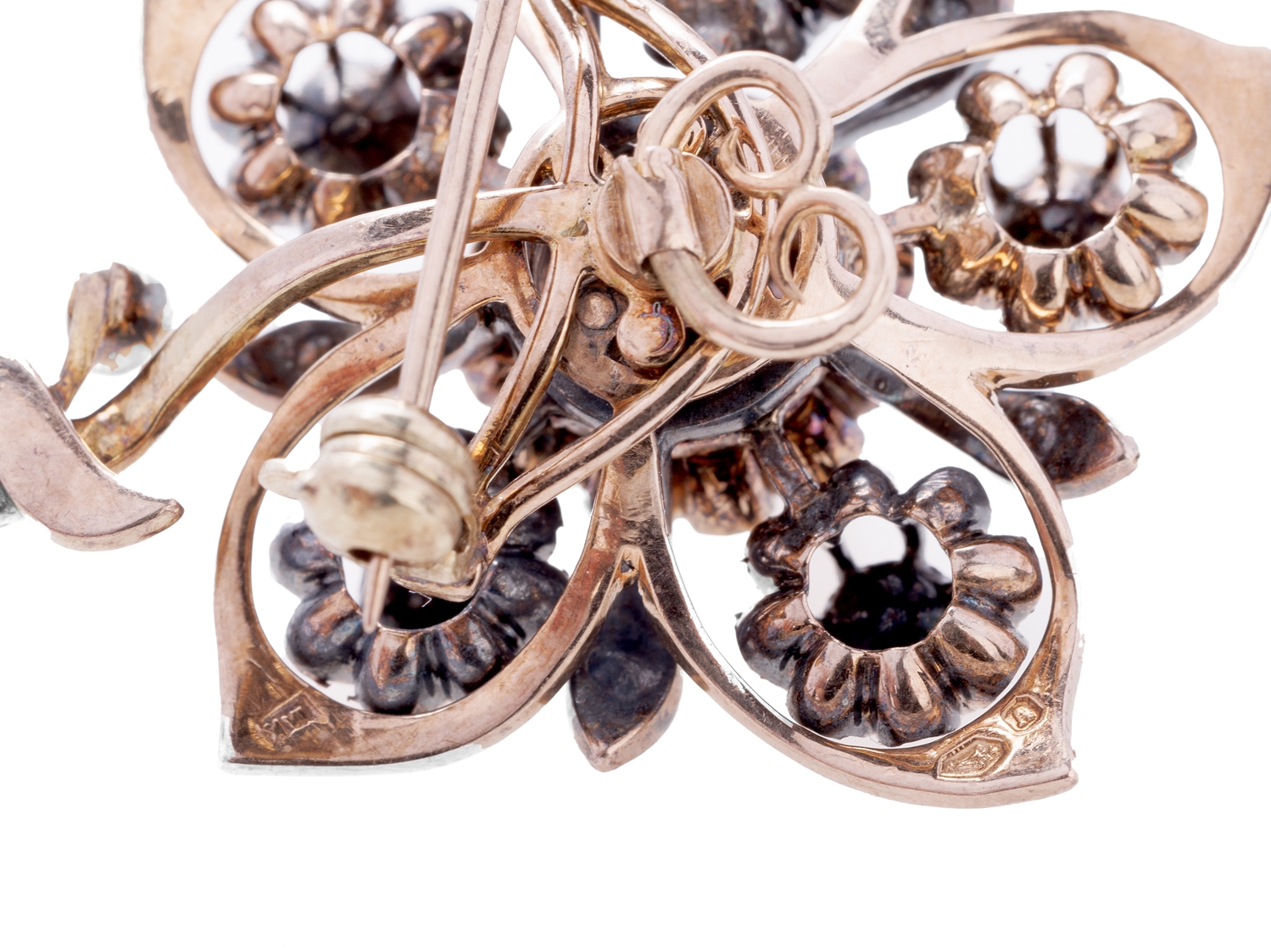 Diamantbrosche mit Diamantrosen aus 585er Gold. Mittlerer Stein ca. 0,7 ct. Maße: ca. 6 cm x 3 cm; Gewicht: ca. 10,68 Gramm. Die Nadel des Schmuckstückes ist abnehmbar um das Schmuckstück als Anhänger zu tragen. Feine Goldschmiedeausführung um 1850 in schöner Erhaltung.