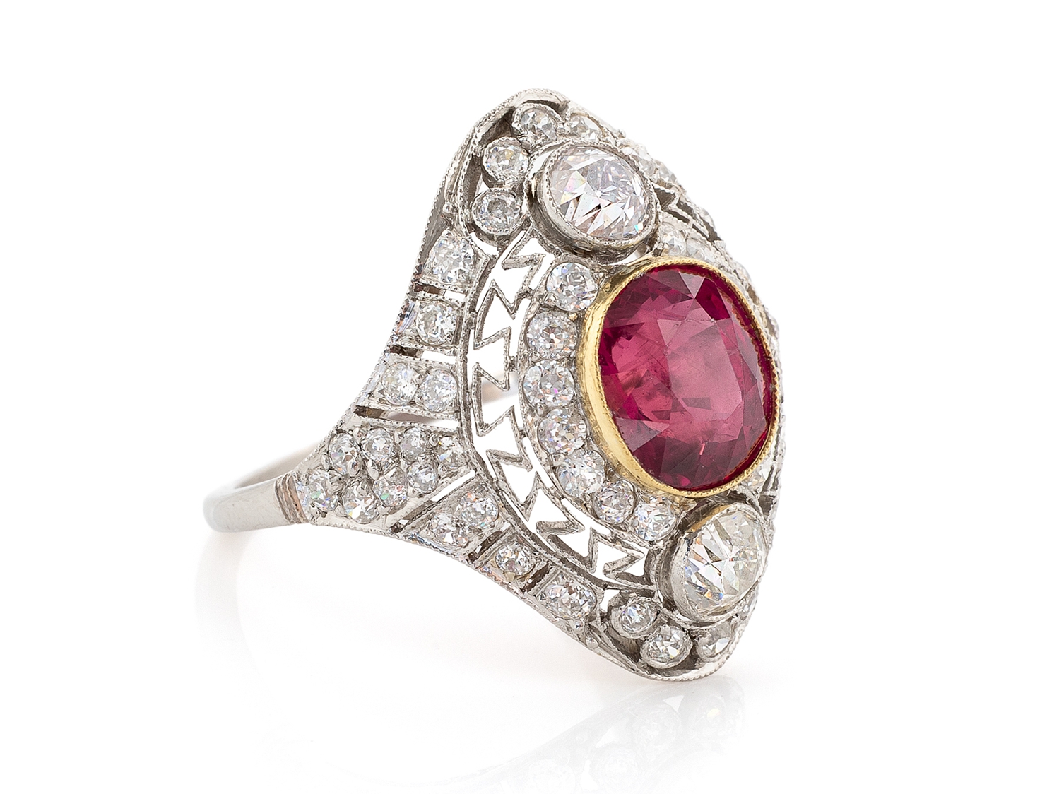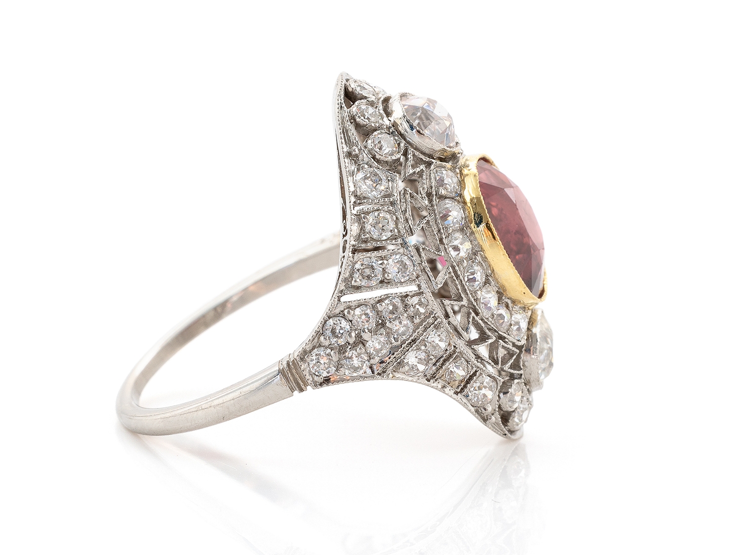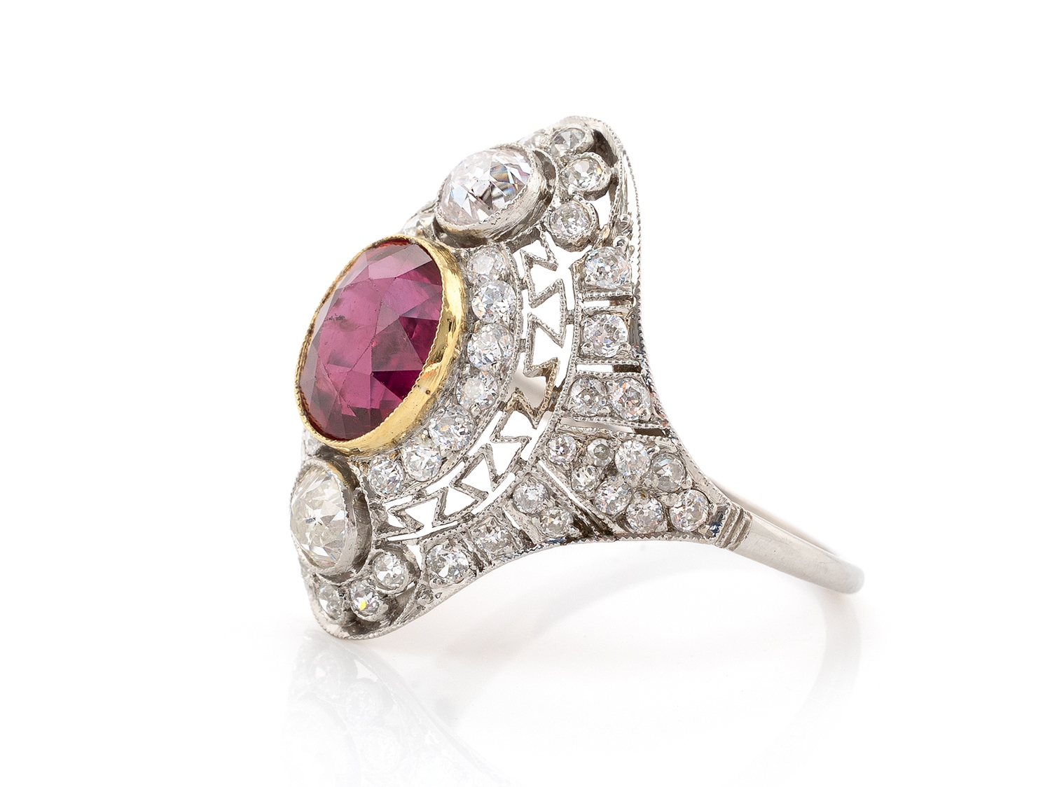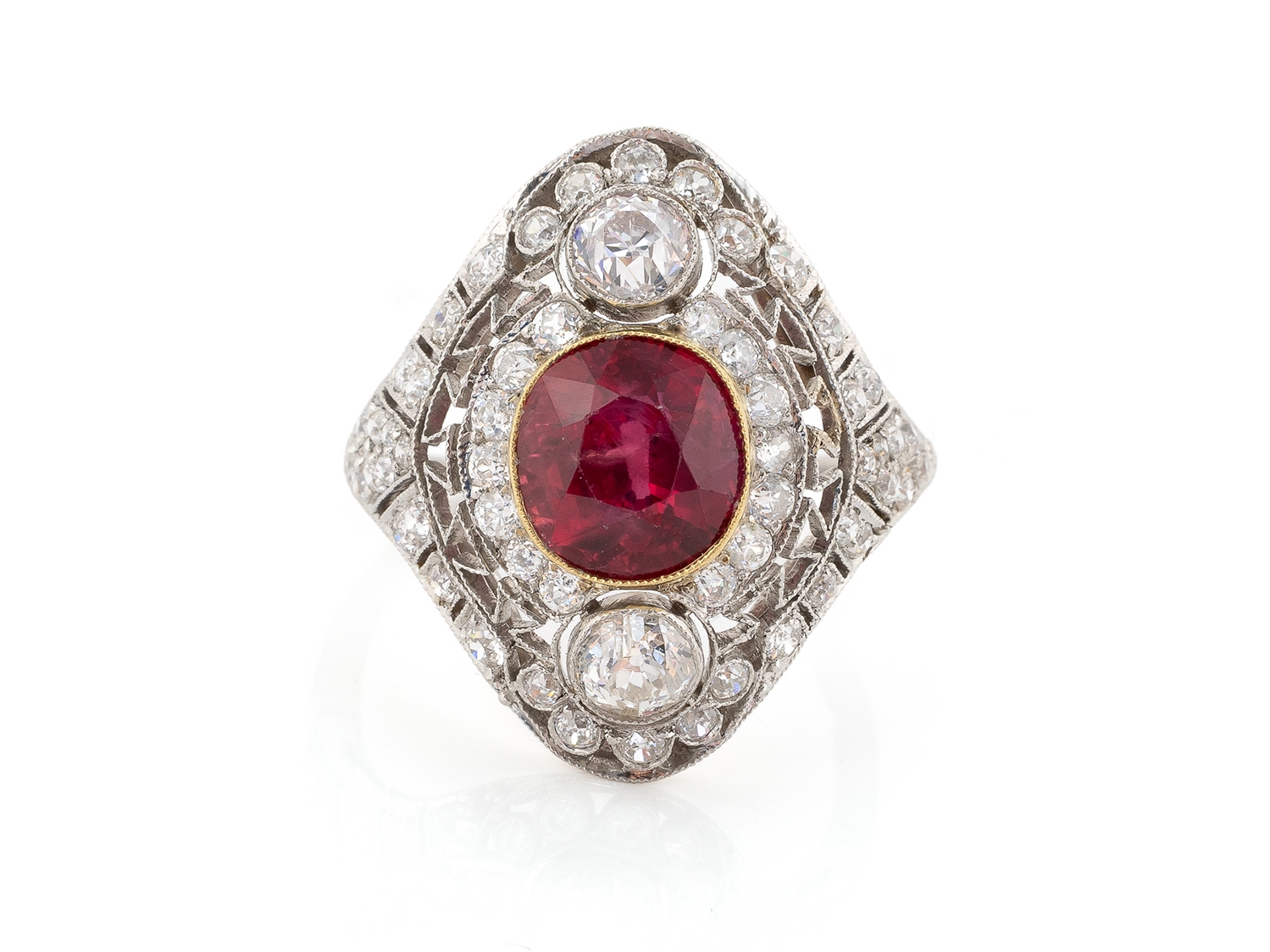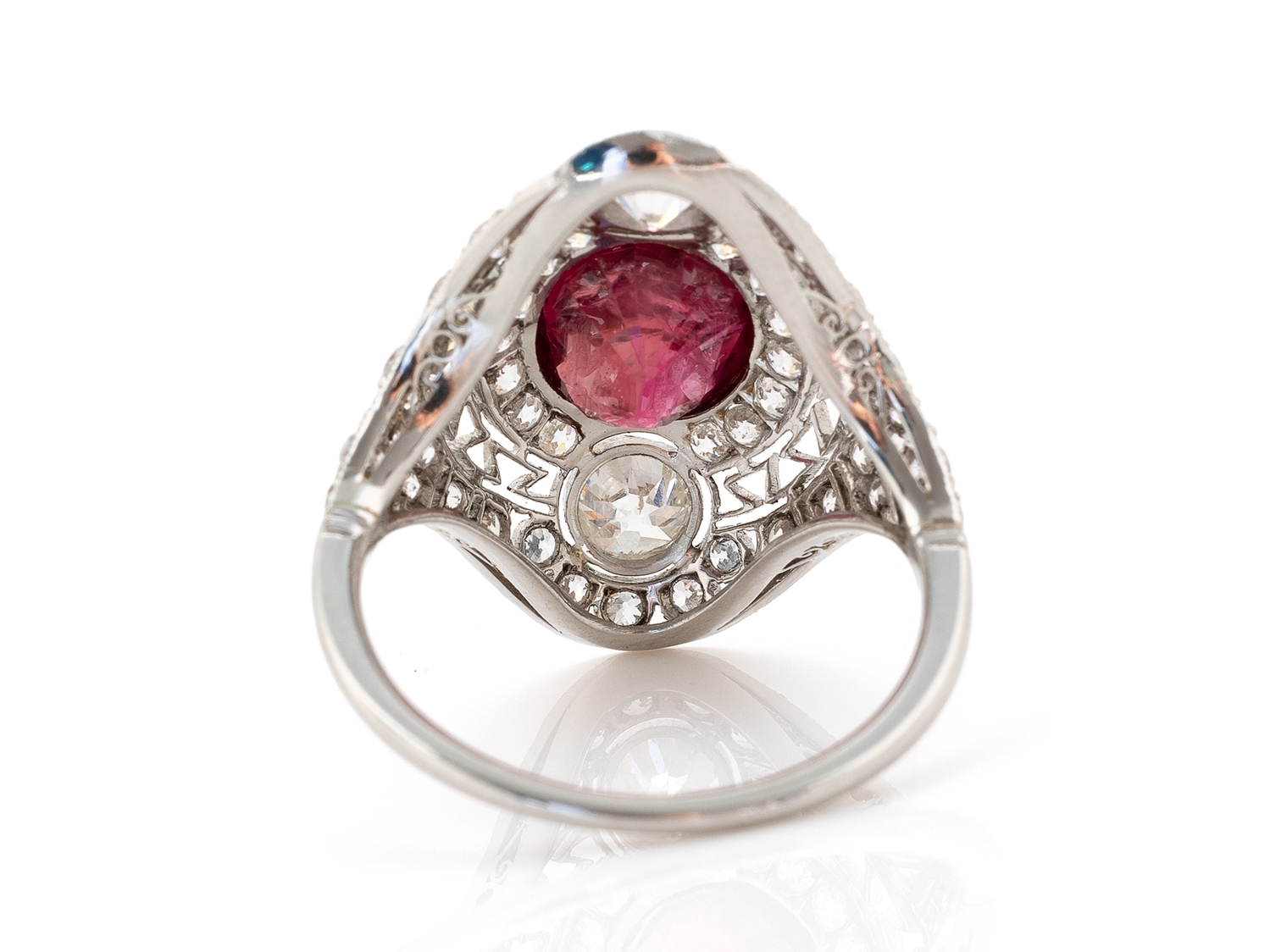Antiker Art Deco Ring aus Platin, nicht punziert, wahrscheinlich um 1920 entstanden, Ringweite 54,5/17,5. Im Ring gefasst ein Rubin von etwa 2,2 Carat (etwa 7,5 x 7 mm, starke Einschlüsse, Steinkanten berieben) sowie 2 Diamanten im Altschliff von zusammen etwa 0,40 Carat und 56 Diamanten im Altschliff von zusammen etwa 1,40 Carat, Die Diamanten haben einen mittleren Farb- und Reinheitsgrad. Das Format des Ringkopfes 22 x 19 mm, der Ring wiegt ca. 5,03 Gramm, sehr guter Zustand nur minimale Gebrauchsspuren.