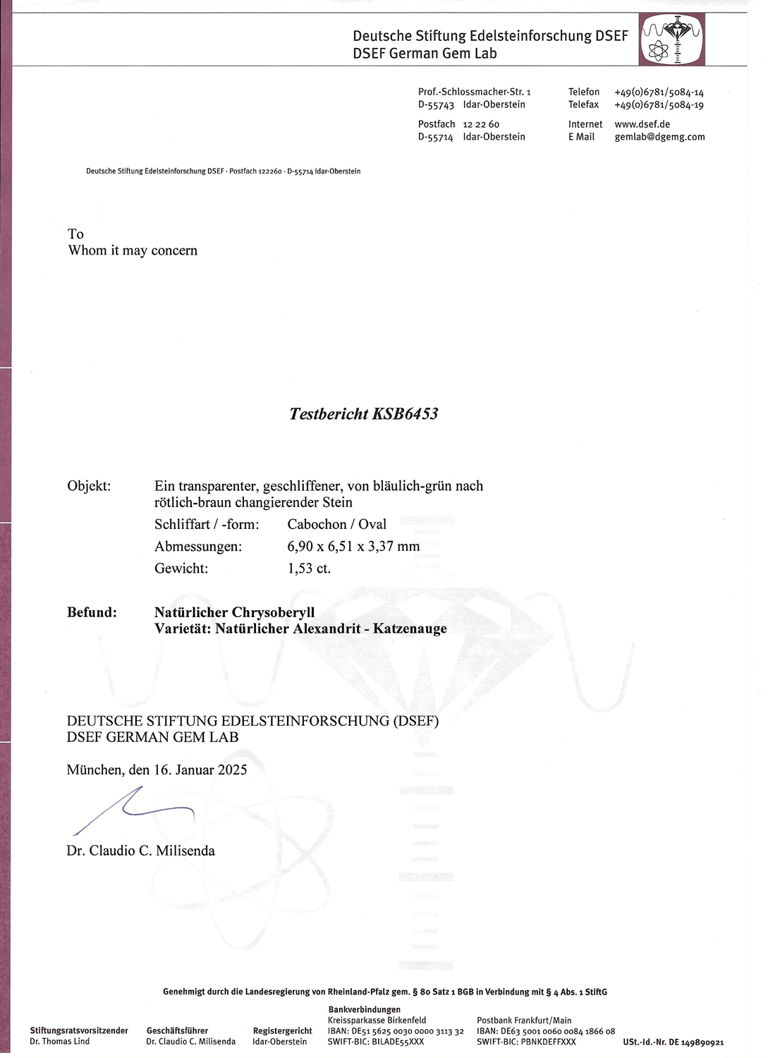 Hoch seltenes Alexandrit Katzenauge von 1,53 Carat, mit DSEF Testbericht